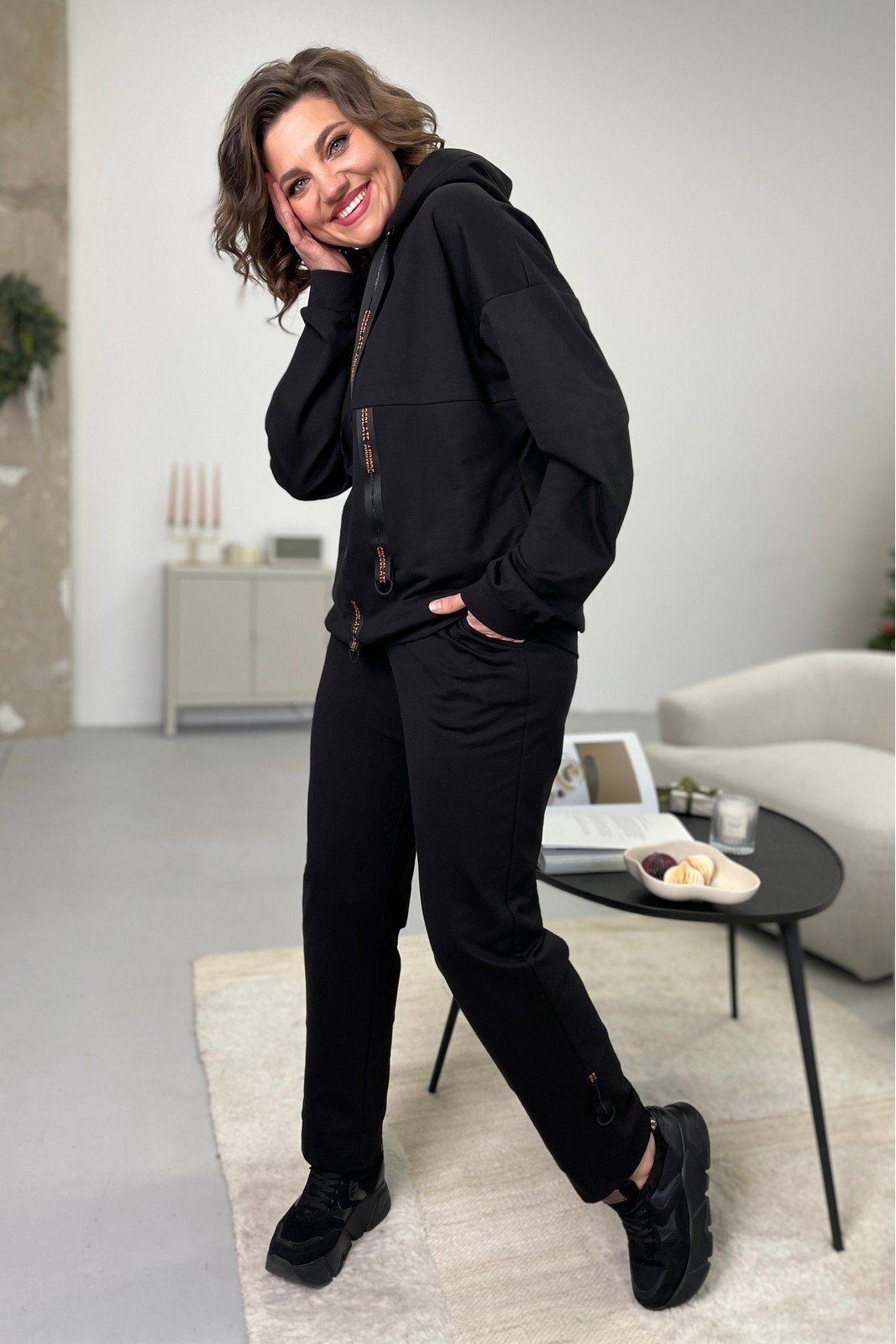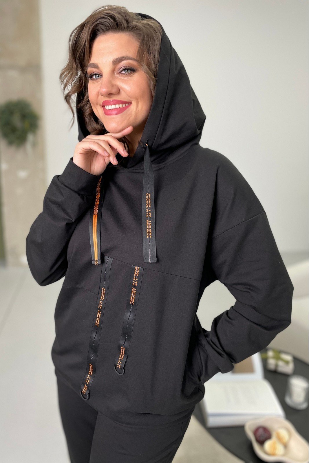 Худи женское из трикотажной ткани. Перед худи с декоротивными подрезами и настрочной тесьмой с полукольцами. В боковых швах расположены карманы. Рукав со спущенным плечом. Низ рукава обработан манжетой,низ изделия обработан притачной планкой. Вырез горловины худи оформлен капюшоном. В притачную деталь капюшона вставлена декоротивная тесьма.