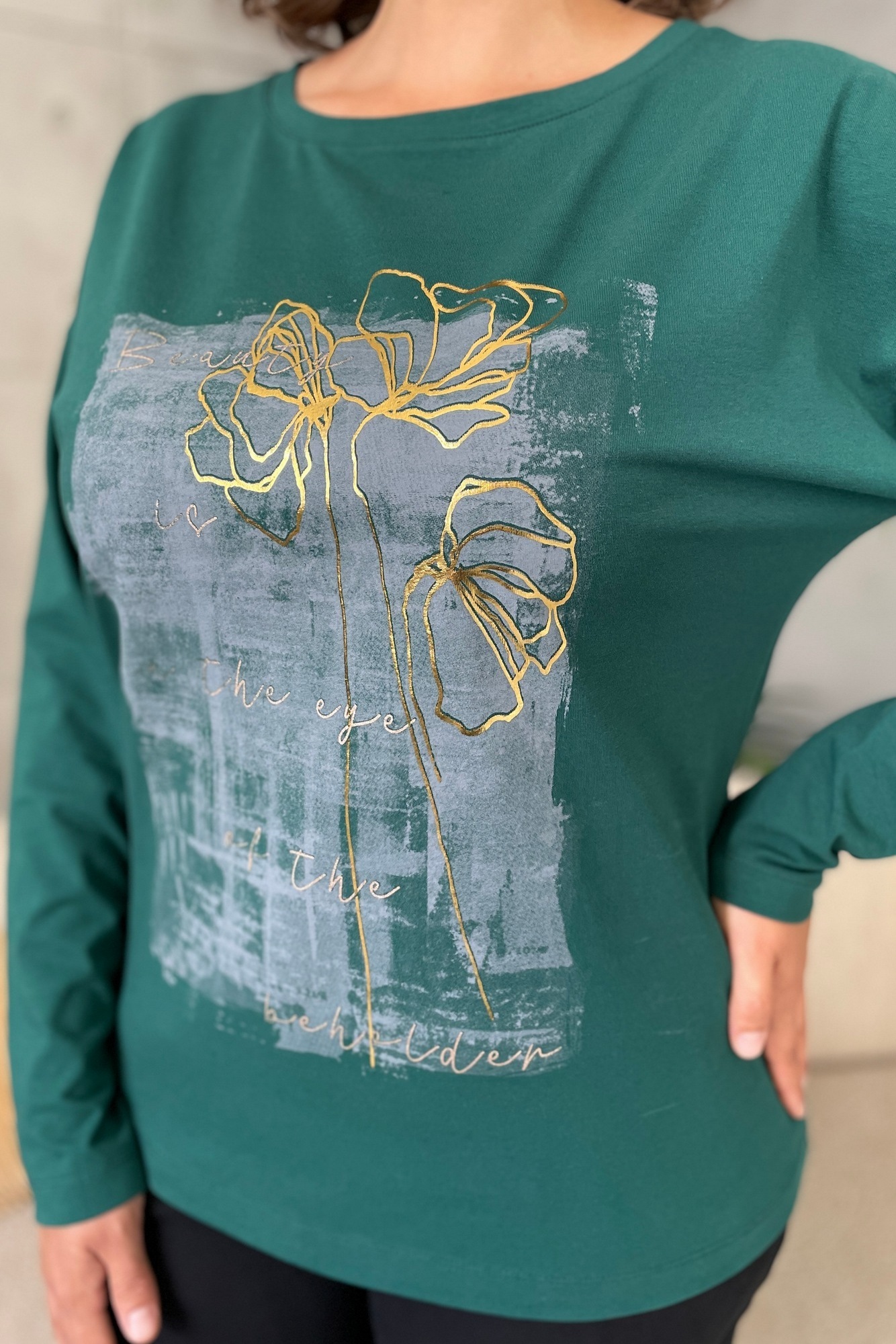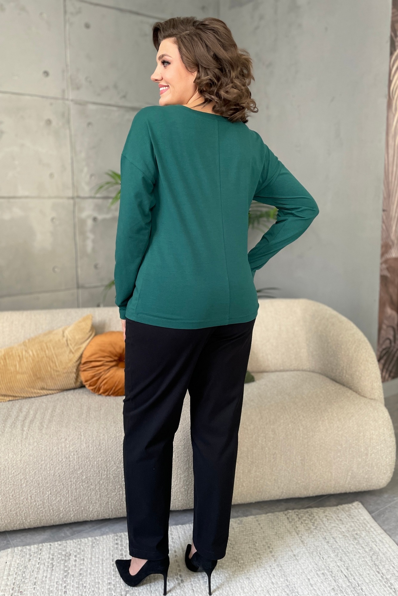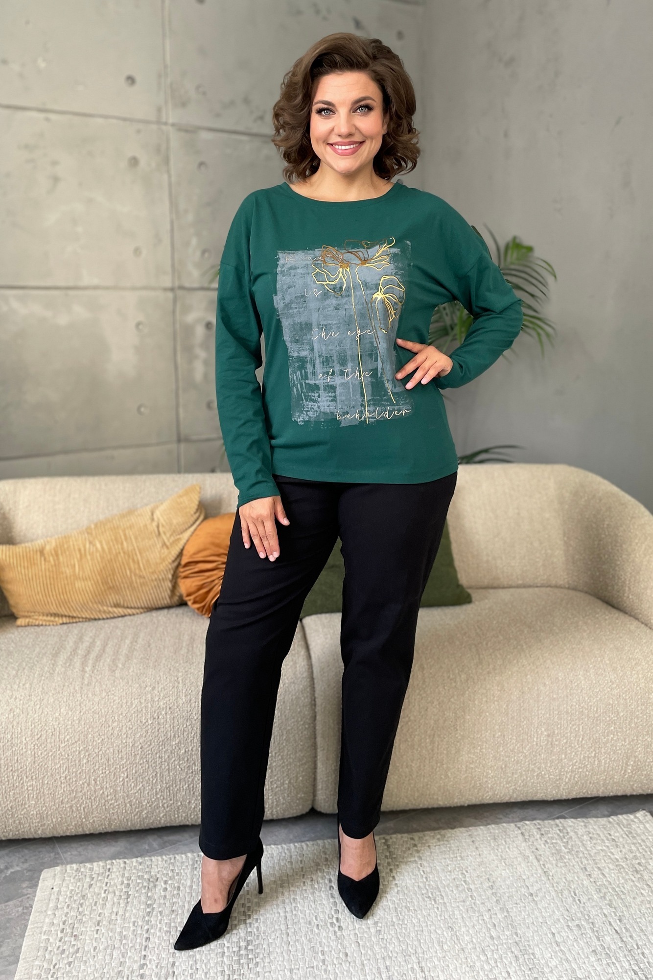 "Джемпер из хлопковой трикотажной ткани. По переду расположен принт. Спинка со средним швом. Рукав одношовный, спущенный. Вырез горловины-круглый, обработан бейкой.