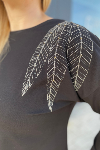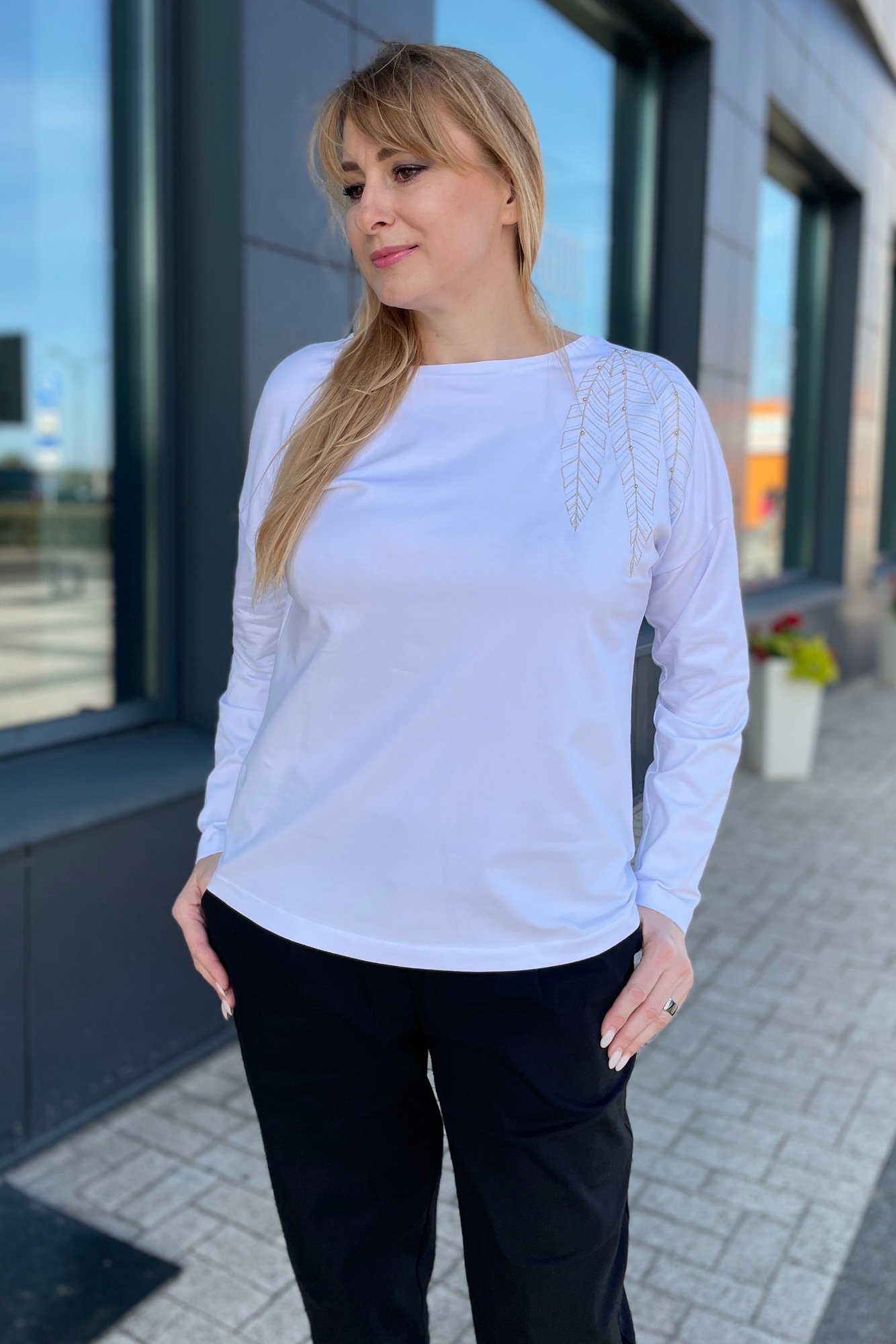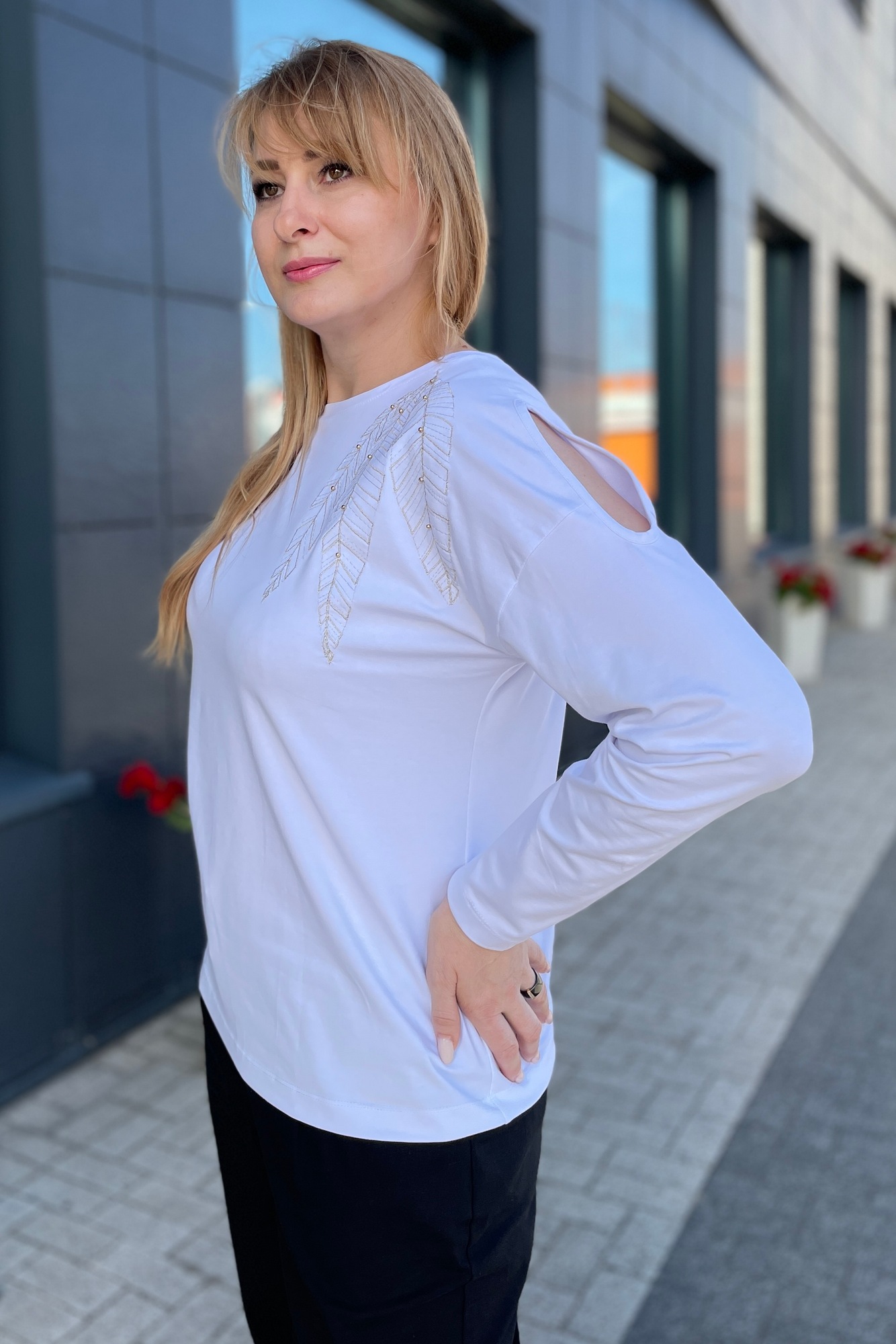 "Джемпер женский из трикотажной ткани. По переду джемпера от плечевого шва расположена вышивка. Вышивка украшена пришивными бусинами. По левому плечевому шву расположен вырез, обработанный окантовкой. Спинка со средним швом. Спущенное плечо.