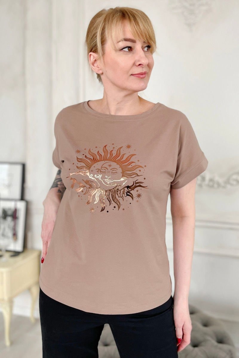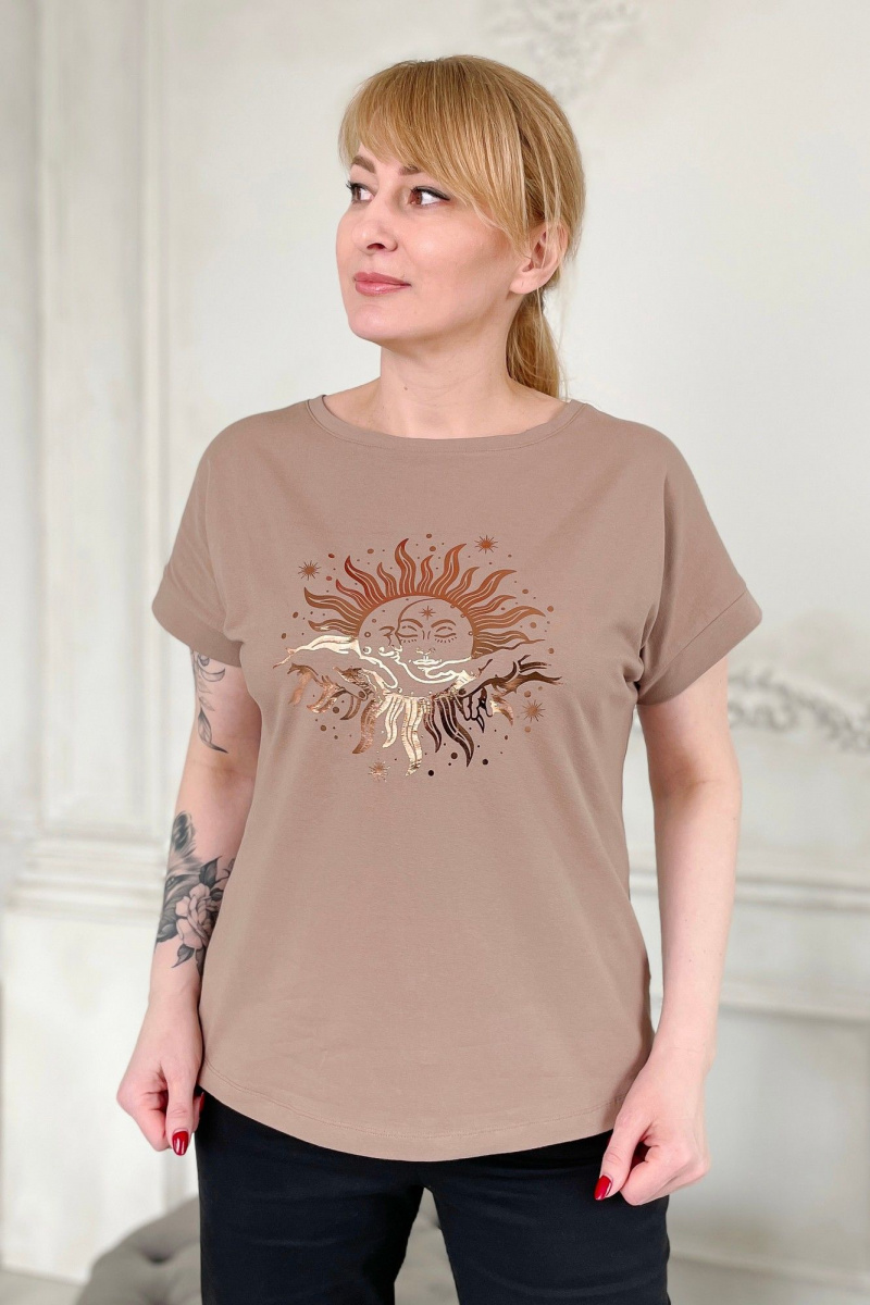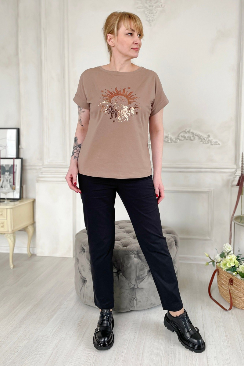 "Джемпер из хлопковой трикотажной ткани прямого силуэта. По переду расположен принт. Спинка со средним швом. Спущенное плечо обработанное манжетой. Вырез горловины-круглый, обработан бейкой.