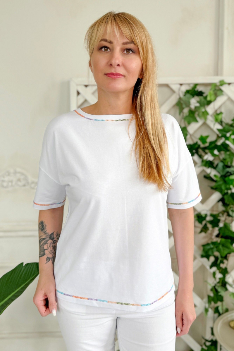 "Джемпер женский из трикотажной ткани, прямого силуэта. Спинка со средним швом, спущенное плечо. Вырез горловины ""лодочка"". Низ джемпера, низ рукава, шов притачивания бейки прострочены декоративным швом ""мультиколор голубой"".