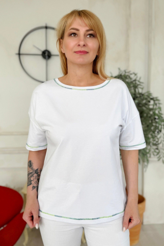 "Джемпер женский из трикотажной ткани прямого силуэта. По переду расположен принт. Спущенное плечо ,короткий рукав. В боковых швах расположены разрезы. Вырез горловины V образный.