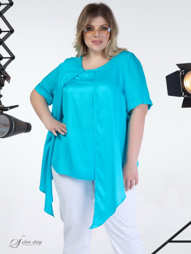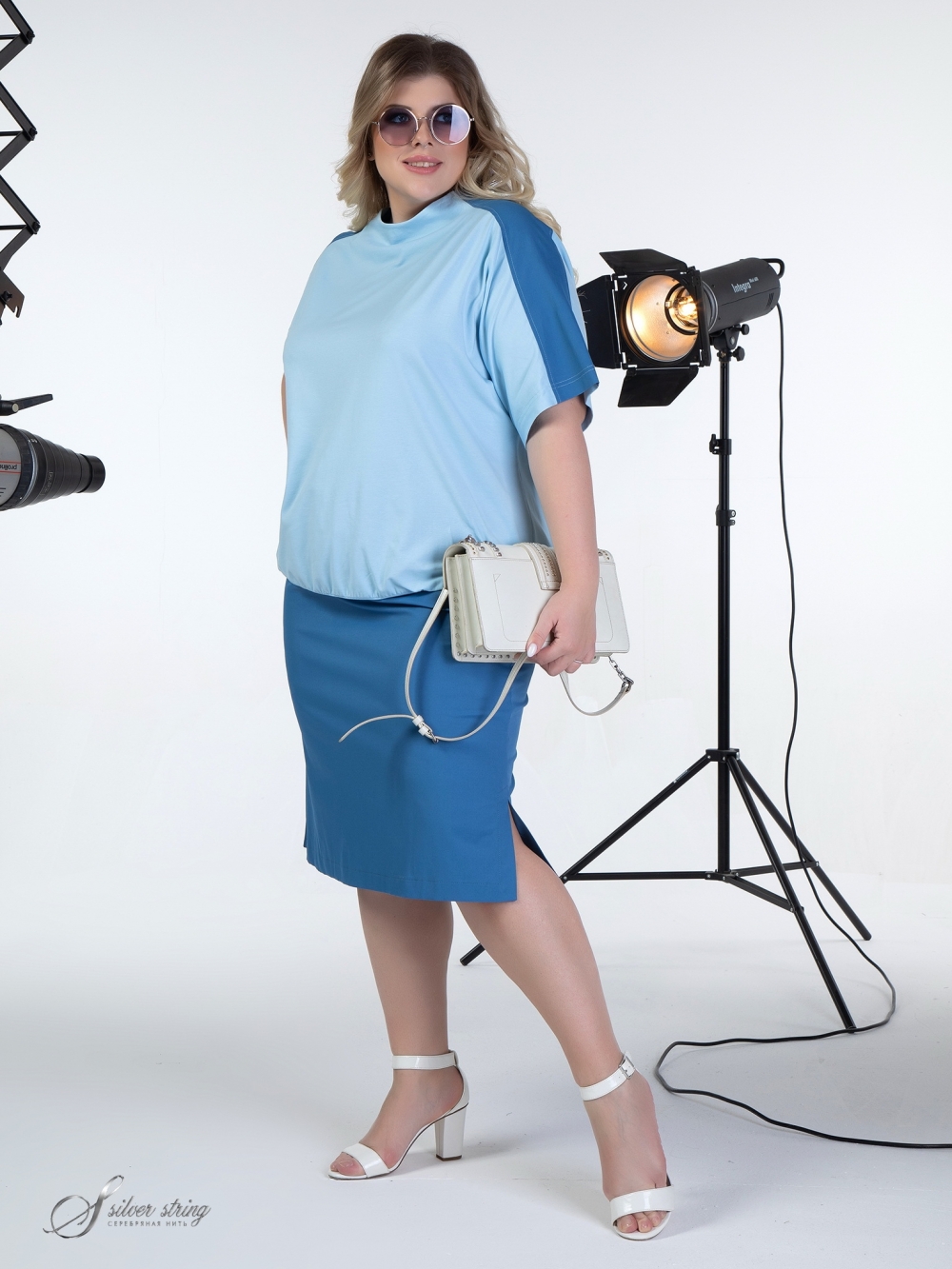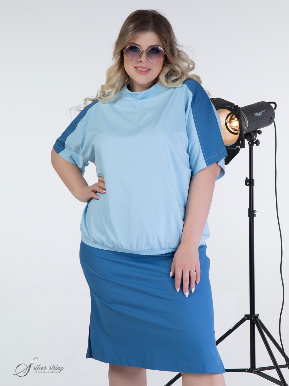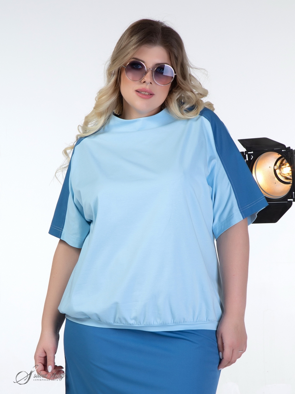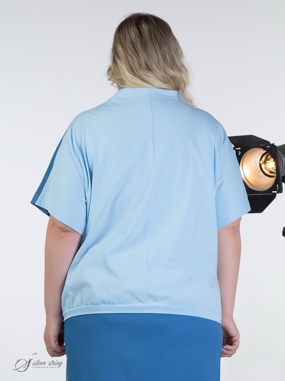 Элегантный джемпер прямого силуэта, с рукавом покроя кимоно длиной до локтя. Модель выполнена из разнотонных материалов - компаньонов: высококачественное трикотажное полотно сочетается с тканью из натурального волокна. Горловина слегка расширена к плечам и оформлена стойкой цельнокроеной с лифом. Кокетки-погоны выполнены из отделочной ткани. Низ модели обработан притачным поясом из основного полотна. Это лаконичная модель, которая притягивает внимание изысканными нюансами.