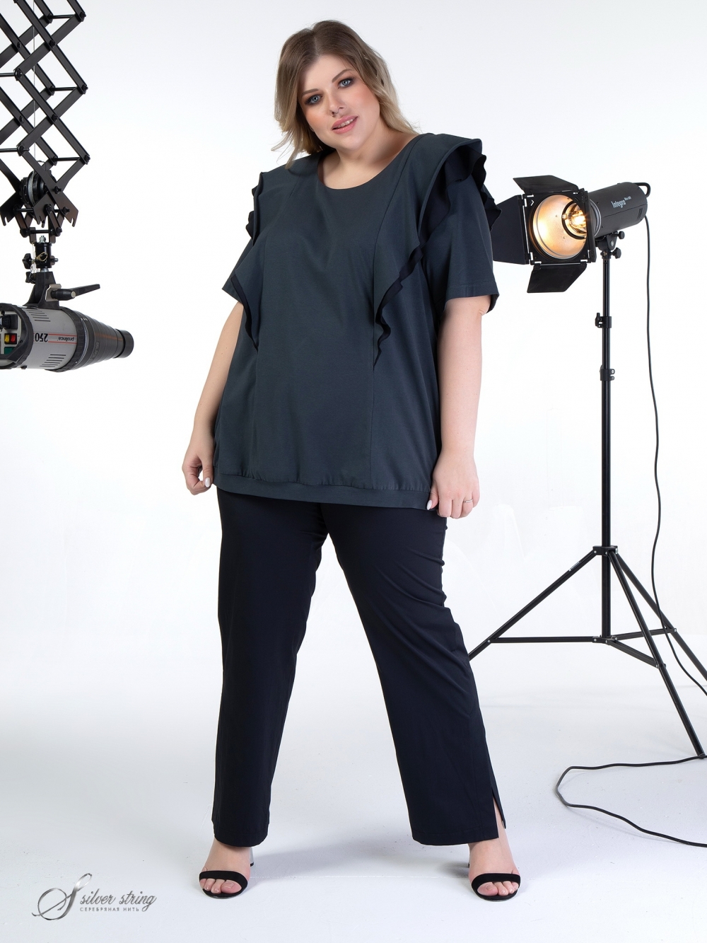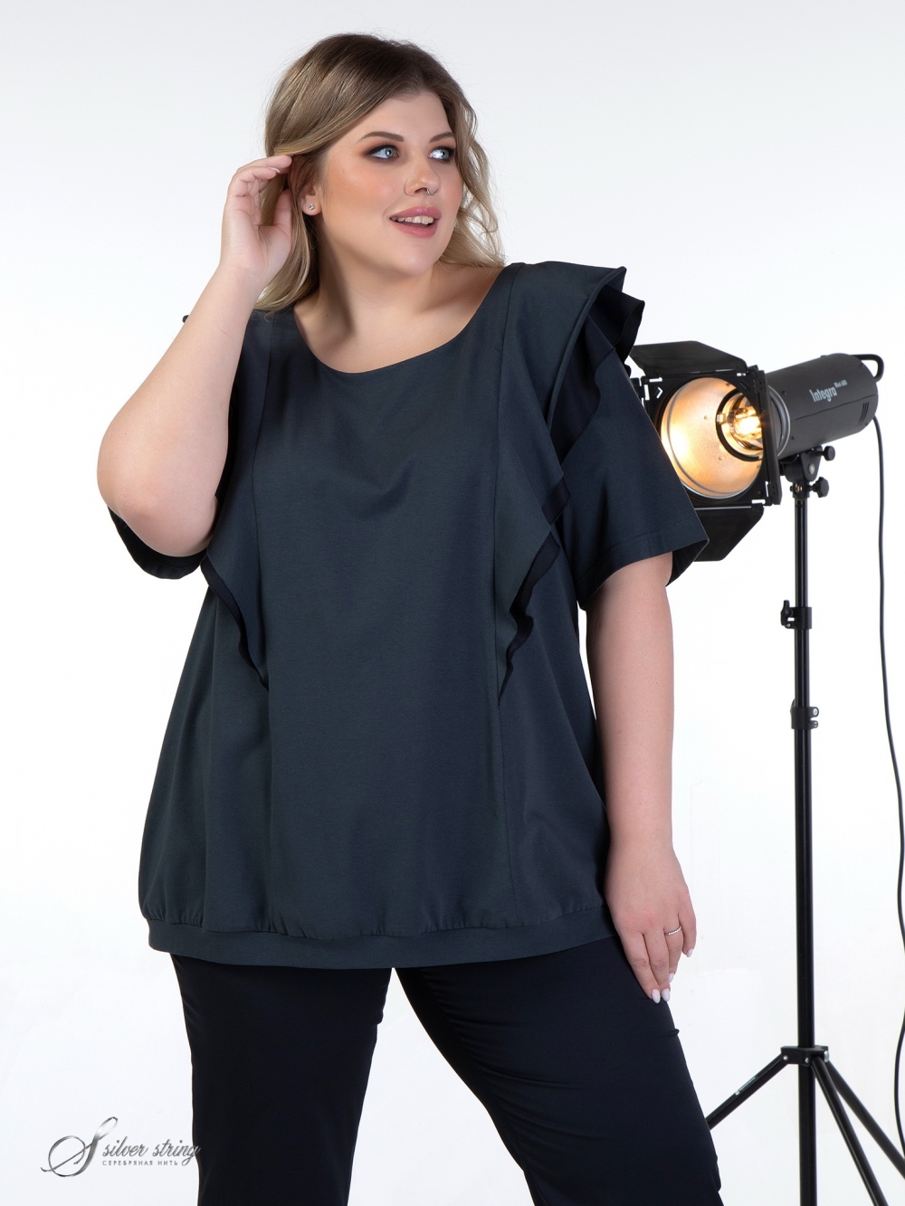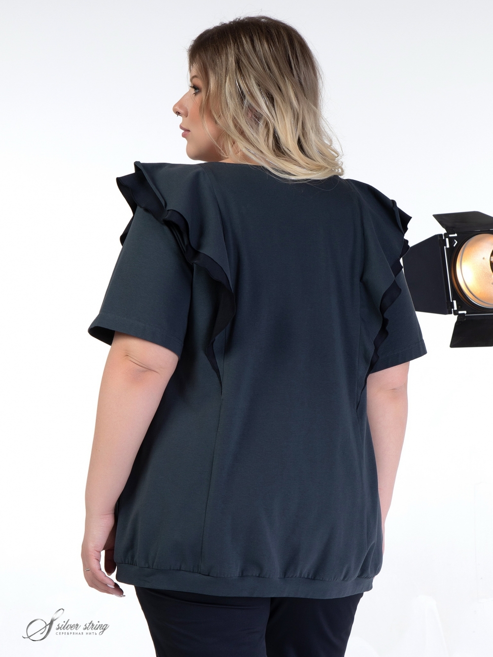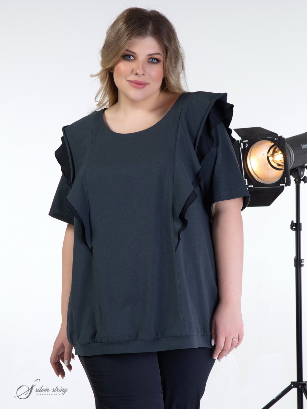 Модный трикотажный блузон прямого силуэта выполнен из однотонных материалов - компаньонов: высококачественное трикотажное полотно сочетается с тканью из натурального волокна. Линия горловины округлой формы. Рукав втачной, длиной до локтя. В вертикальных рельефах расположены двухслойные воланы, которые добавляют модели женственности, что так актуально в этом сезоне. Низ модели обработан притачным поясом из основного полотна. Это лаконичная модель, которая притягивает внимание изысканными нюансами.
