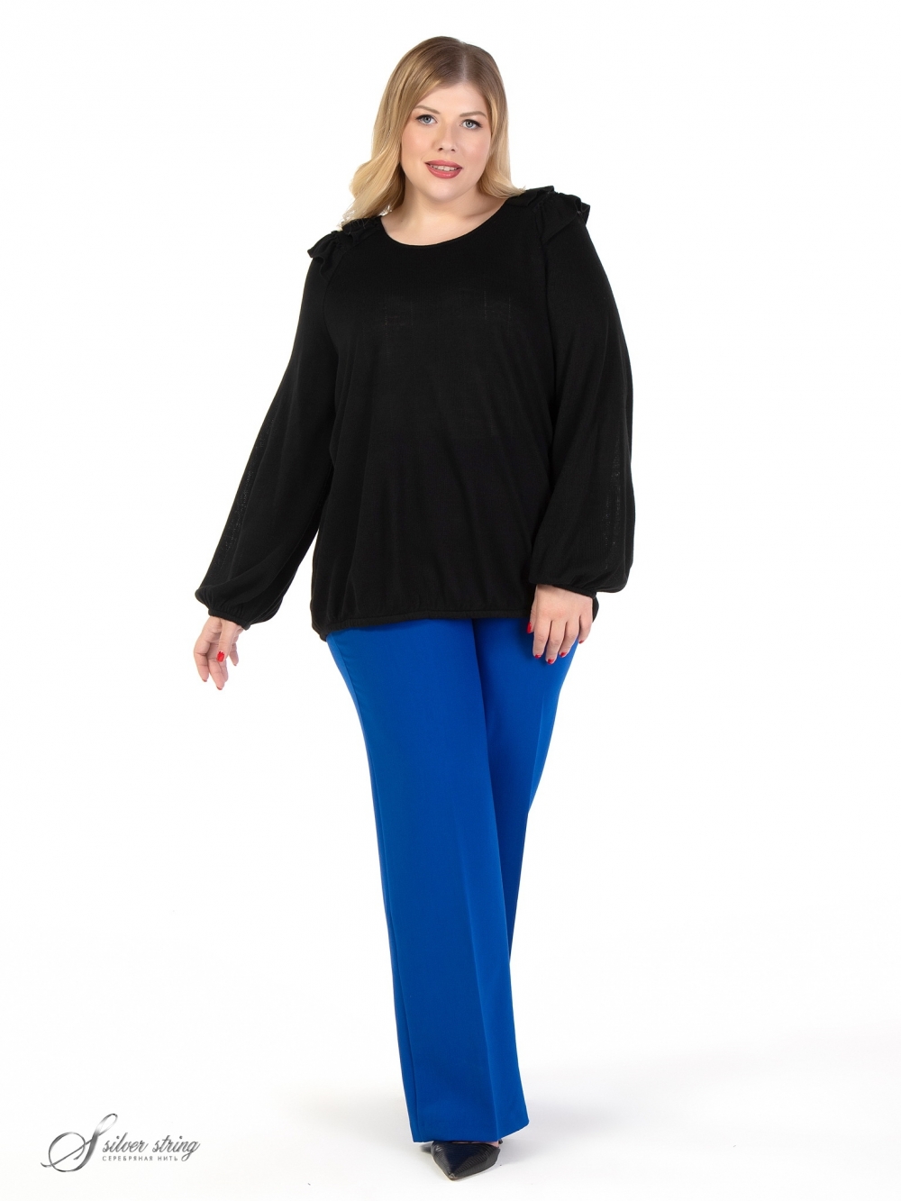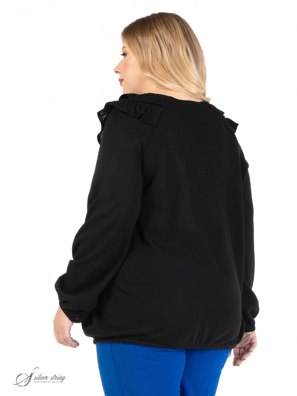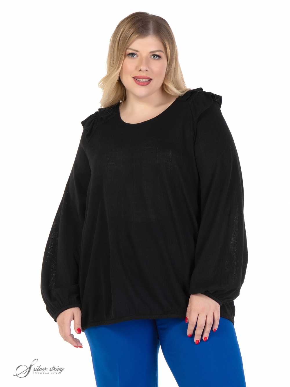 Нарядный джемпер прямого силуэта, в стиле Easy-chic, выполнен из фактурного однотонного трикотажного полотна. Модель с округлой линией горловины и длинным, объемным рукавом покроя реглан. Между линиями реглана полочки и спинки, параллельно вырезу горловины, настрочены два ряда рюш. Низ изделия и рукава обработан тонкой эластичной тесьмой. Удобный крой, и эффектный декор делают модель неповторимой.