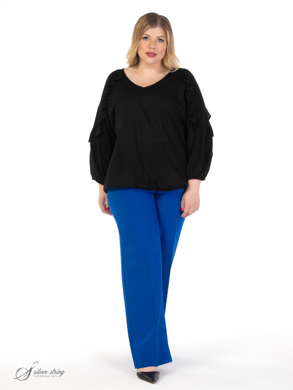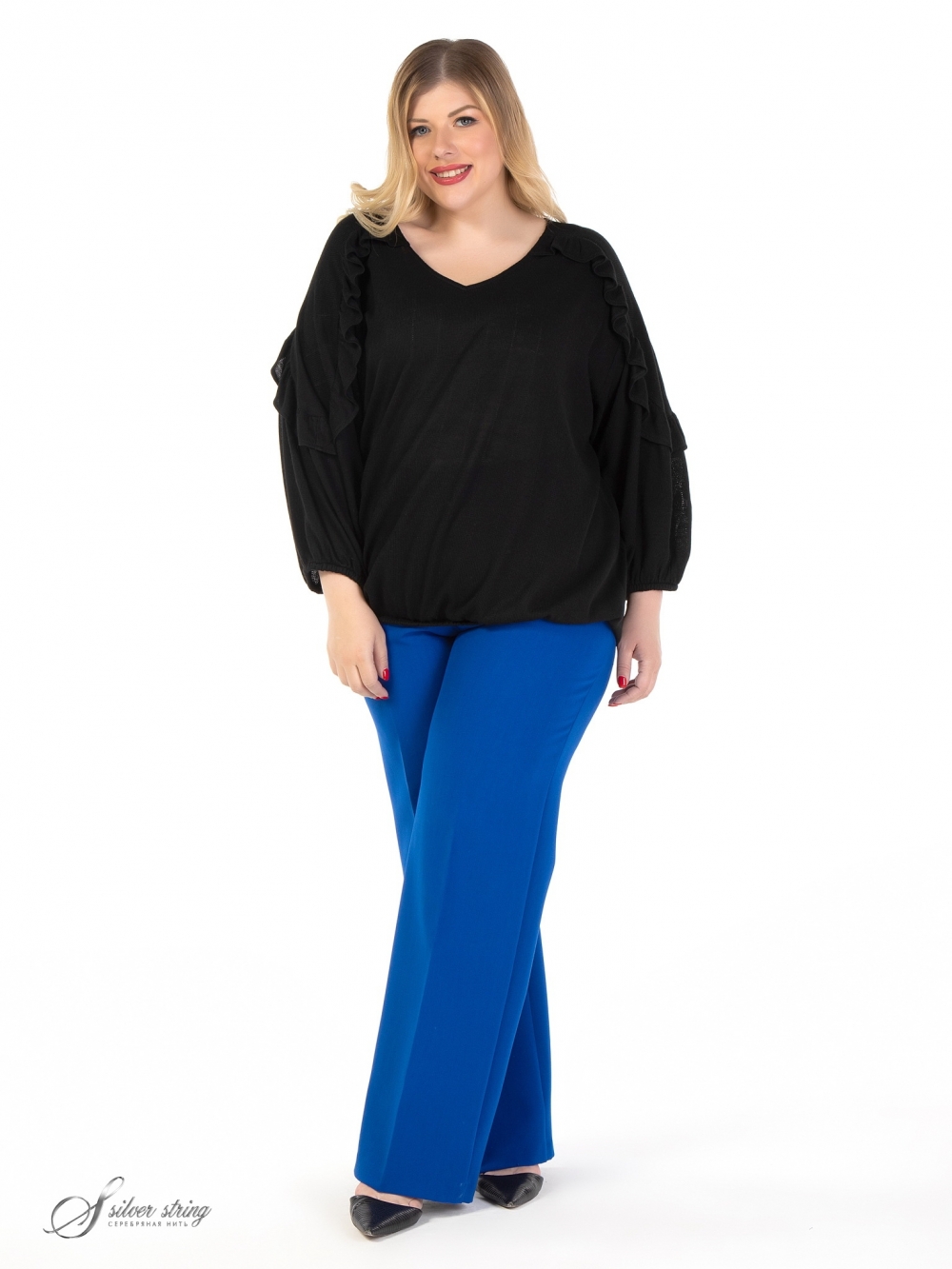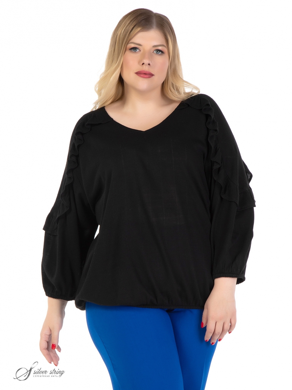 Оригинальный джемпер, свободного силуэта, выполнен из фактурного однотонного трикотажного полотна. Горловина У-образной формы. Модель с просторным рукавом длиной за локоть. Низ рукава, как и низ изделия, обработан эластичной тесьмой. На полочке и спинке расположена единая кокетка, переходящая на рукав. Линия кокетки подчеркнута элегантной рюшкой. Модель отлично скрывает проблемные зоны, а эффектный дизайн позволит чувствовать комфортно и стильно.