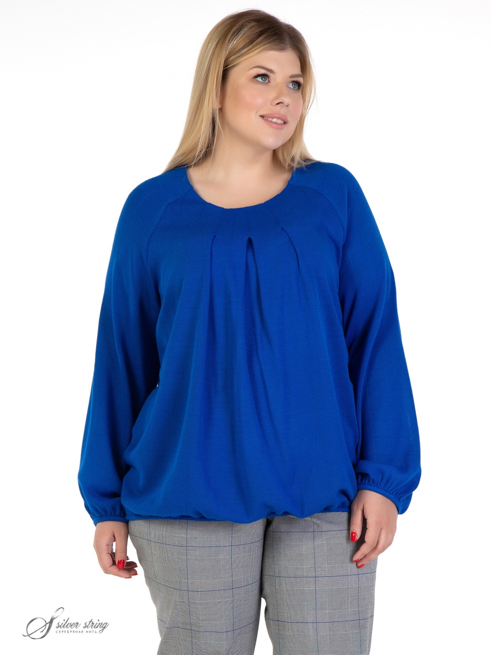 Яркий джемпер, свободного силуэта, выполнен из фактурного однотонного трикотажного полотна. Модель с длинным, объемным рукавом покроя реглан. Низ рукава, как и низ изделия, обработан эластичной тесьмой. Горловина округлой формы. По центру полочки, от горловины, заложены три мягкие складки. Модель смотрится неординарно, за счет сочетания оригинального кроя и эффектной ткани.