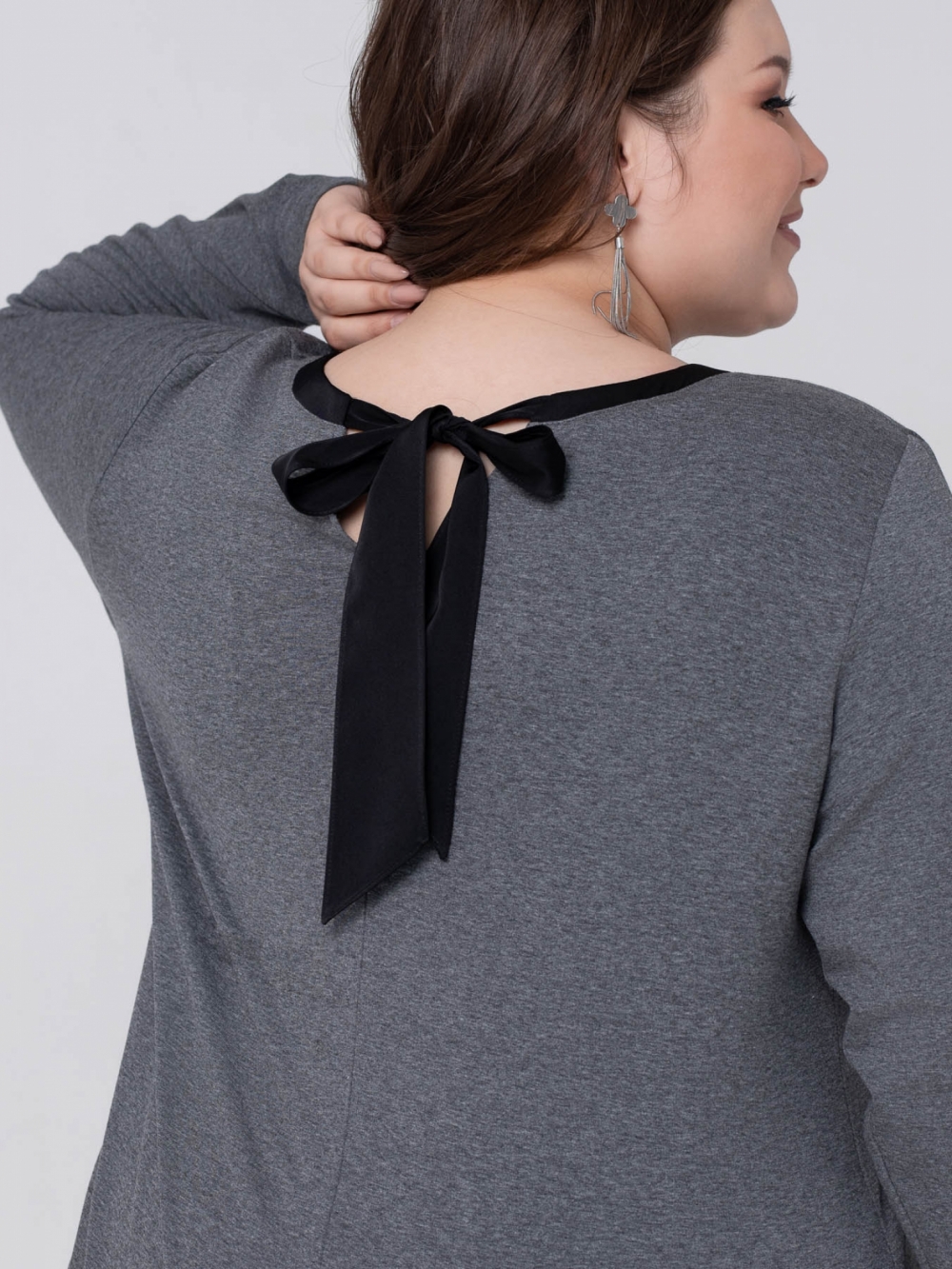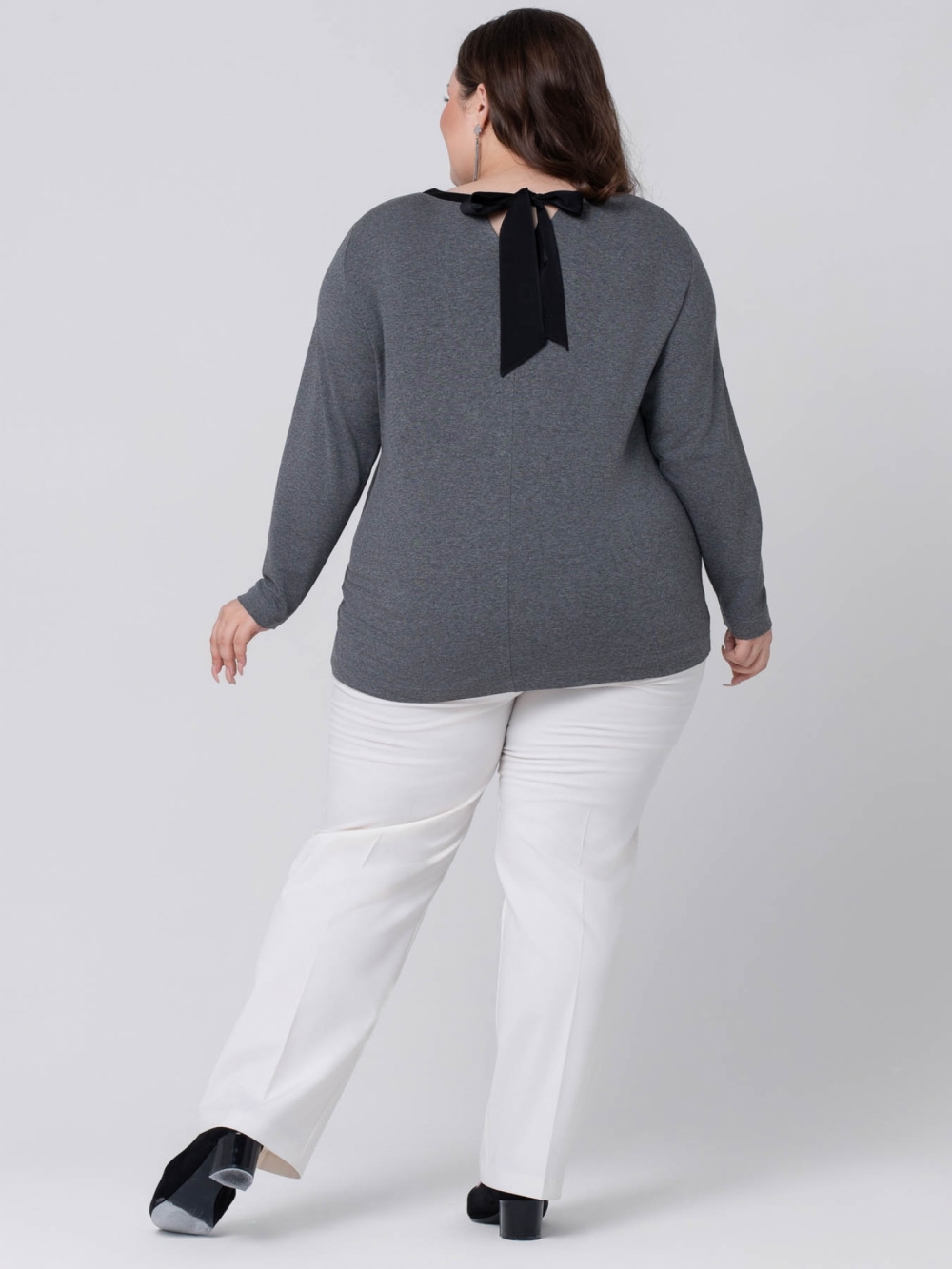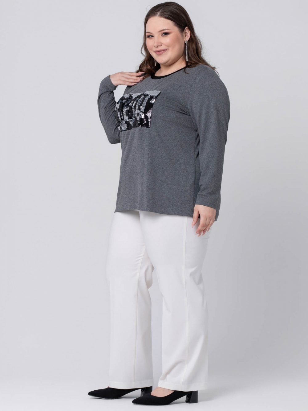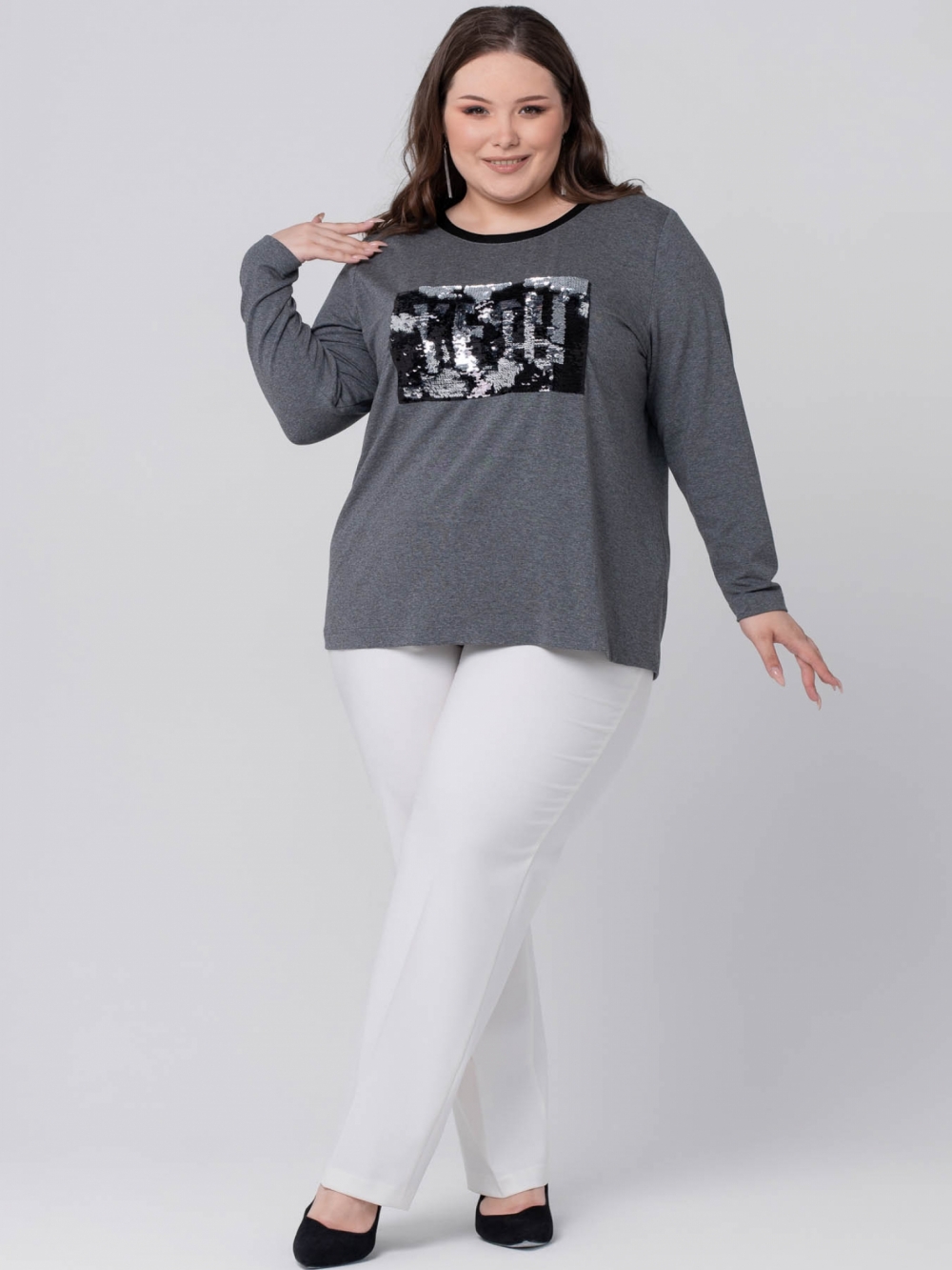 Эффектный джемпер выполнен из качественного трикотажного полотна с меланжевым эффектом. Изделие прямого силуэта с длинным втачным рукавом. По центру полочки настрочена аппликация из пайеток с 3D эффектом. Линия горловины на полочке имеет округлую форму, а на спинке в виде V-образного выреза и обработана контрастными планками из атласа, которые переходят в широкие завязки. Лонгслив в стиле спорт-шик идеально дополнит любой гардероб, т.к. отличается правильной посадкой и прослужит не один год .