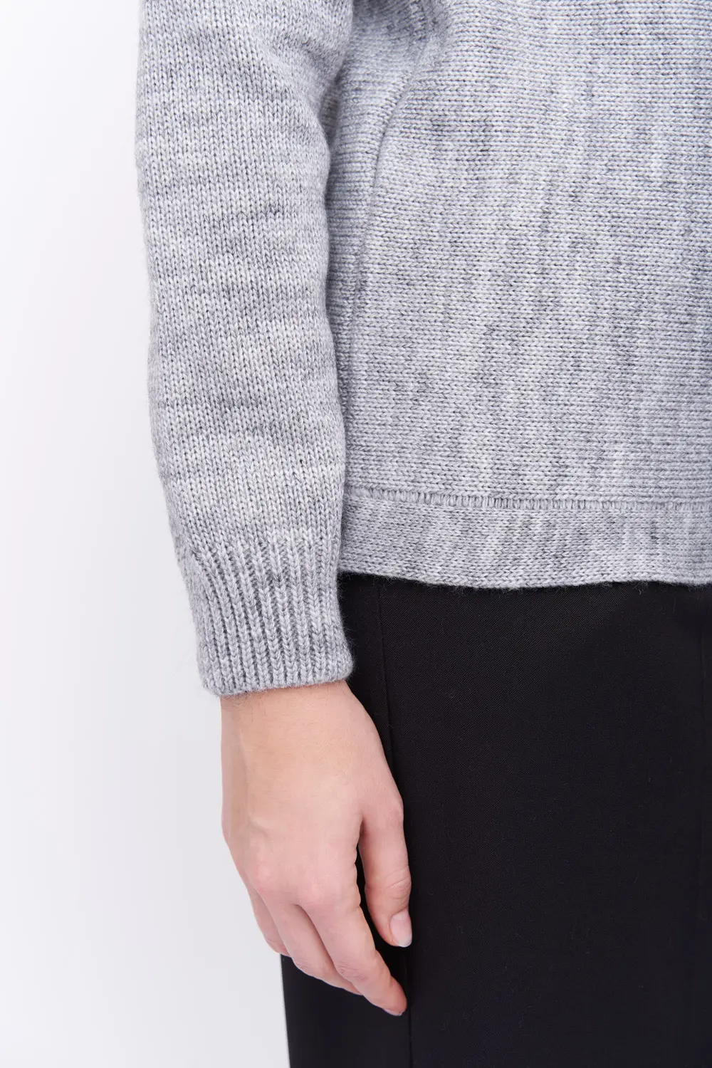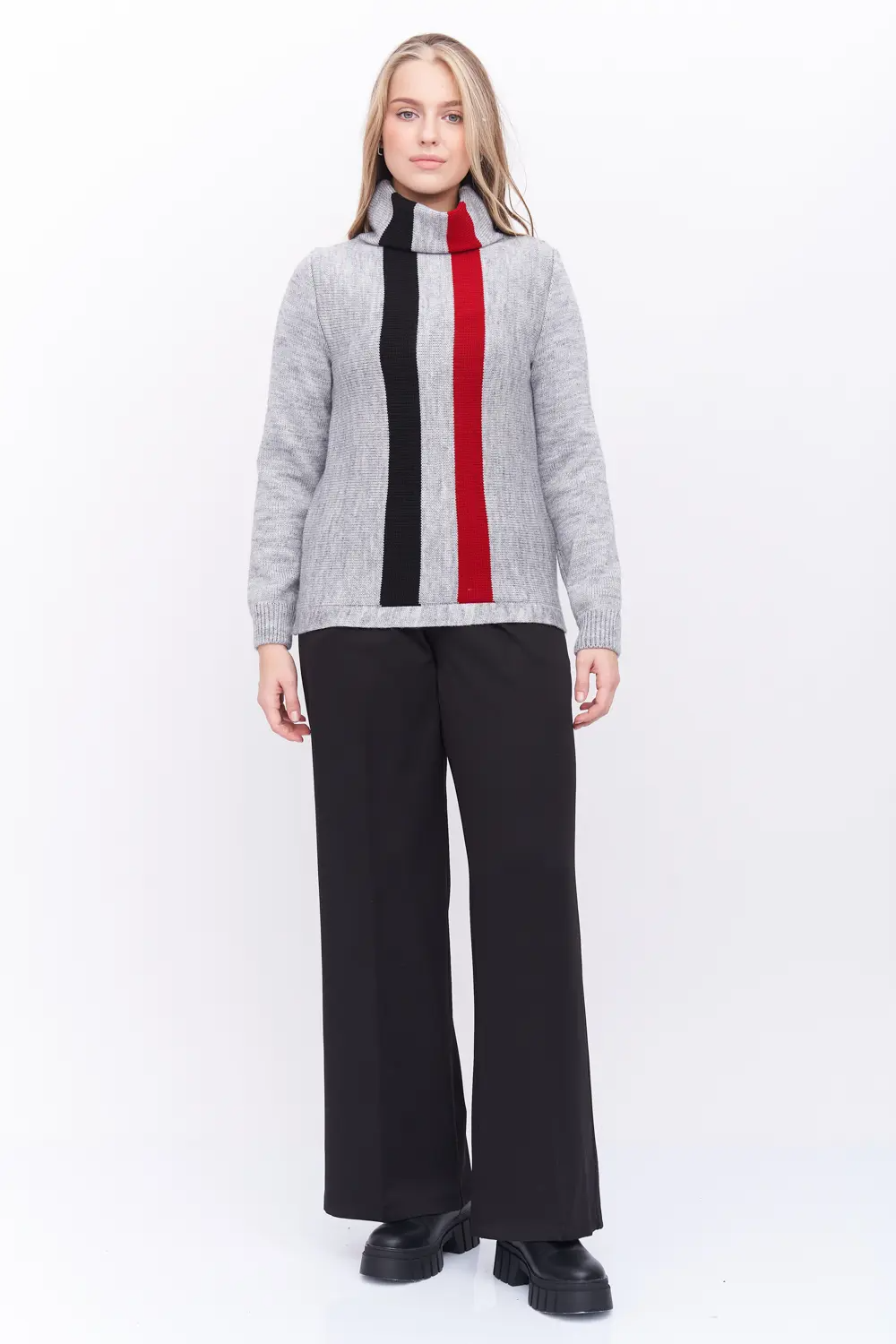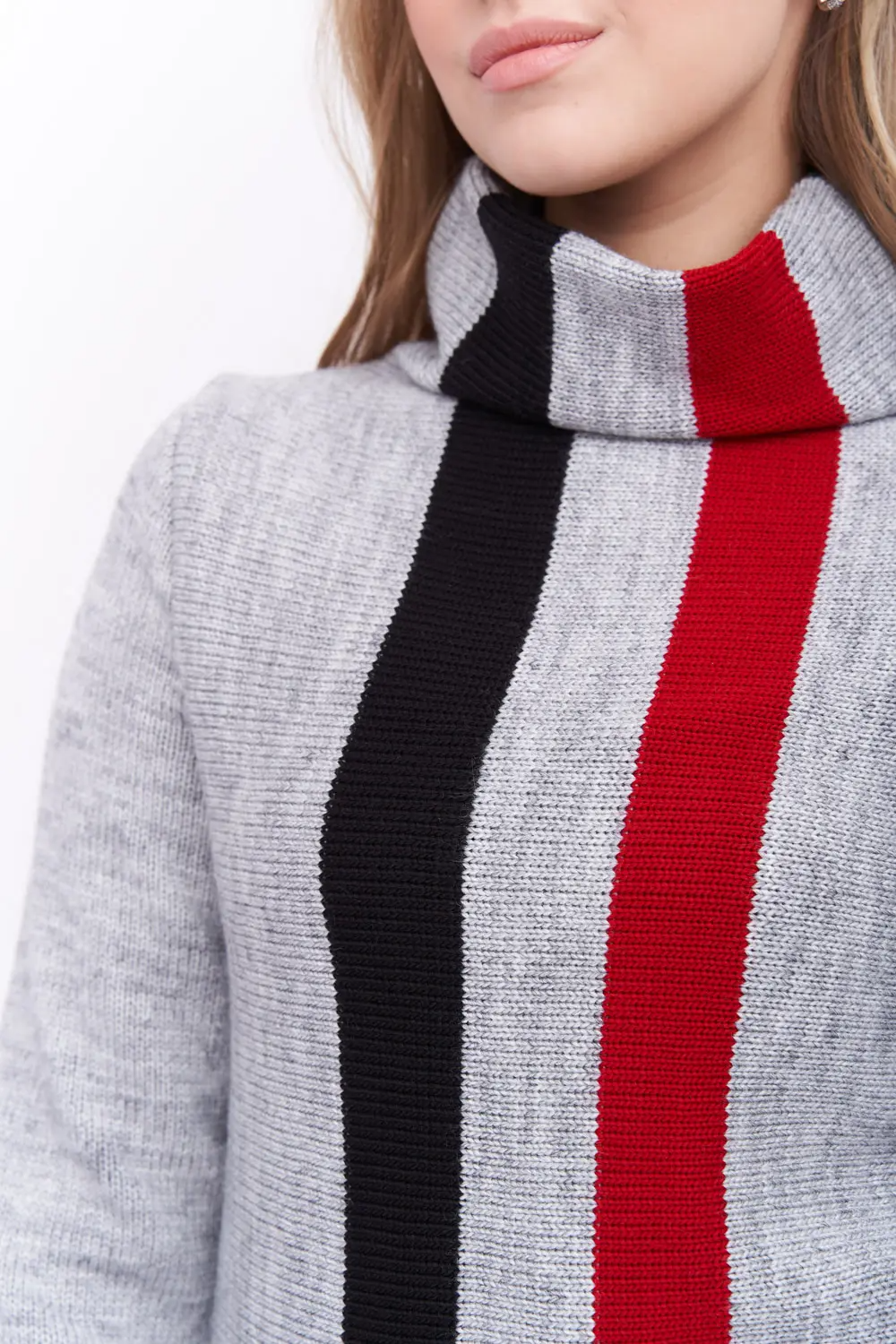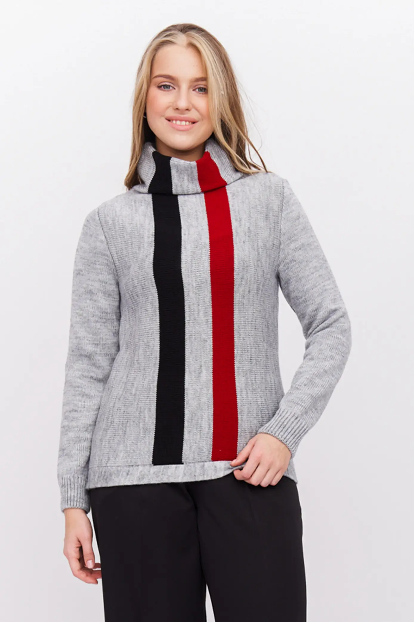 Женский вязаный джемпер прямого силуэта. Воротник-стойка.Рукава втачные полной длины. Две яркие вертикальные полосы визуаьно удлиняют и стройнят силуэт. серый микс