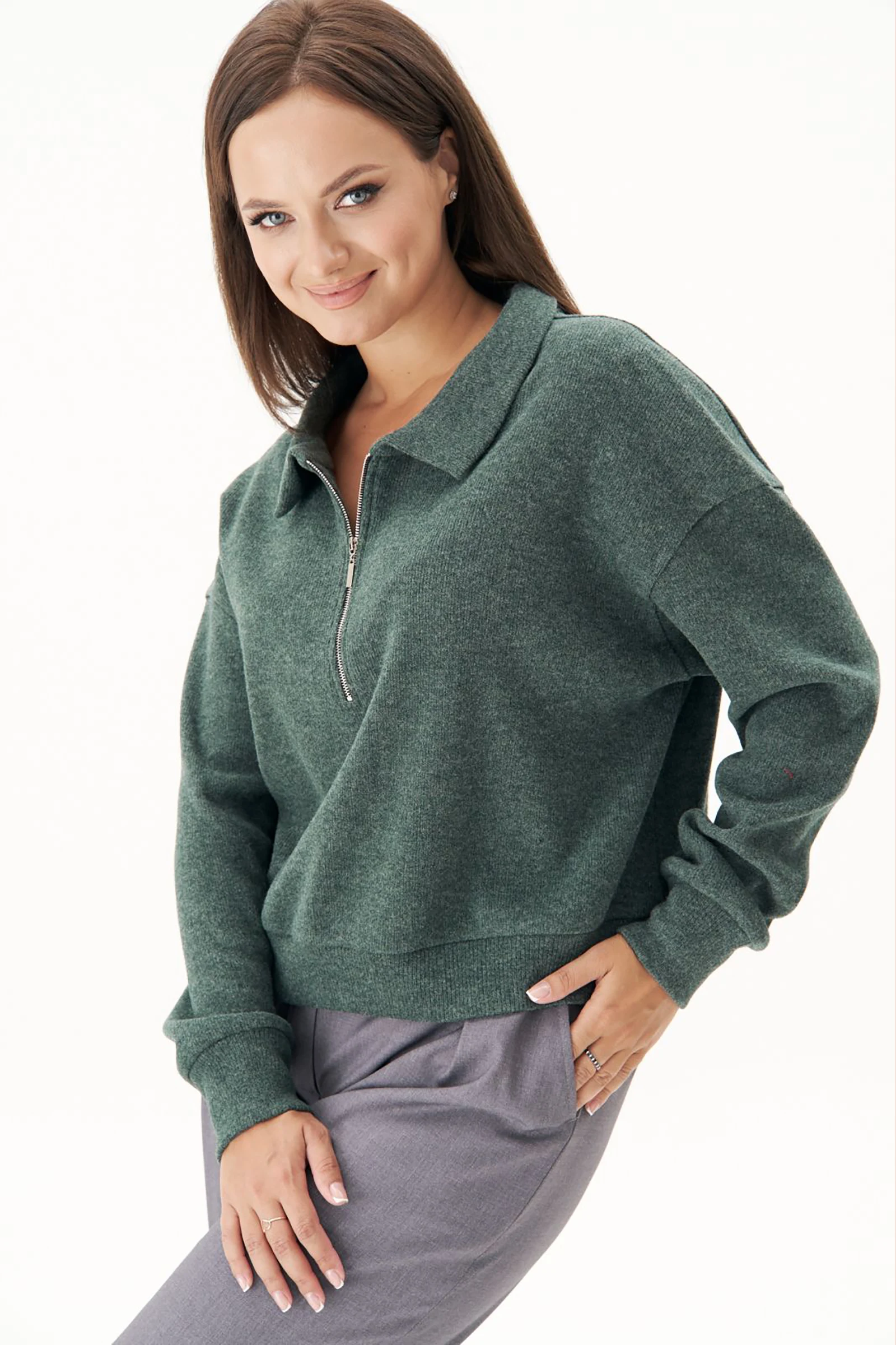 Джемпер из трикотажа. Это одна из базовых вещей осенне-зимнего сезона. Он тёплый, удобный и невероятно комфортный. К тому же, настолько универсален, что его можно стилизовать абсолютно разными способами. Свободный покрой с заниженной линией плеча, рукав рубашечного покроя на отрезной манжете, воротник классический, по центру полочки частичная застёжка-молния. По низу джемпера - отрезной пояс.