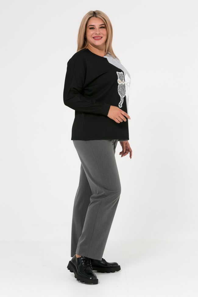 черный Стильный джемпер свободного силуэта из комбинированного трикотажа футер. Перед с центральным швом. Левая часть переда выполнена в светлом оттенке. Правая часть и спинка - темный футер. Асимметричный вырез горловины округлой формы, с вырезом по центру, дополнен оригинальной брошью. Эффектным акцентом модели является аппликация с пайетками по центру переда. Длинные цельнокроеные рукава, по низу оформлены манжетой. Низ изделия прямой.