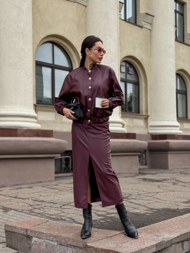Джемпер укороченный прямого свободного кроя. Выполнен из мягкого трикотажа светло-серого цвета. Горловина-стойка, в естественную складку. Есть подплечники (съёмные). Длина рукава от линии втачивания 61 см. Длина спинки 50 см