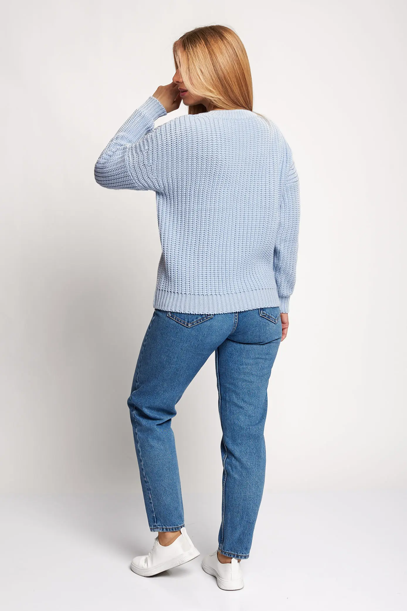 Джемпер женский вязаный с круглой горловиной без застежки. Модель выполнена из высококачественной пряжи с составом 30% шерсть 70% ПАН переплетением, образующим "жемчужные" петли. Джемпер однотонный, имеет свободную посадку в области груди за счет "спущенного" плеча. Рукава втачные длинные, длина составляет 61 см. Джемпер будет кстати на любой случай жизни. На работу или на прогулку. Он согреет Вас теплом и укутает уютом! голубой