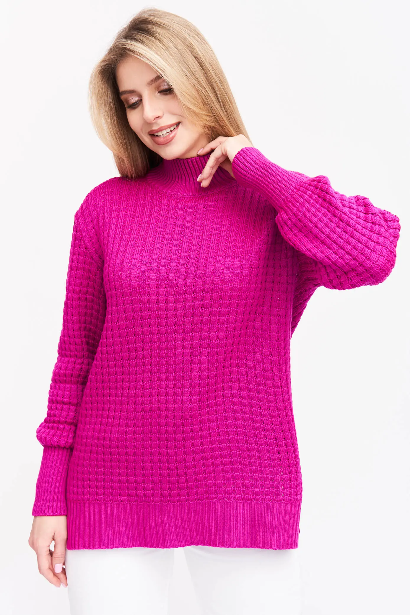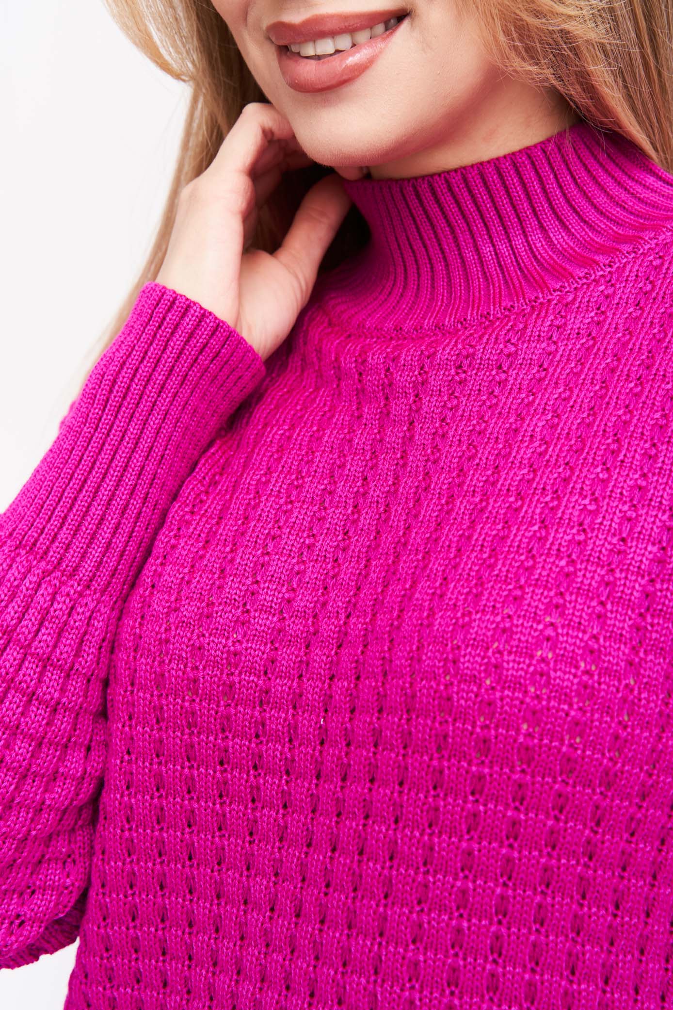 Женский джемпер с воротником-стойка. Спущенная линиия плеча и длинный рукав. Стильная модель выполнена из дышащей, износостойкой, мягкой акриловой пряжи с добавлением полиэстера и шерсти. Поэтому джемпер не только прекрасно смотрится, но и комфортно сидит на любой фигуре, не теряет форму и цвет даже после множества стирок. Отлично сочетается с джинсами, брюками и юбками. малина