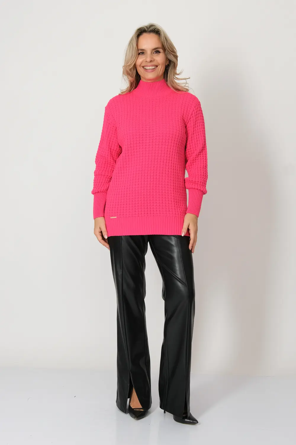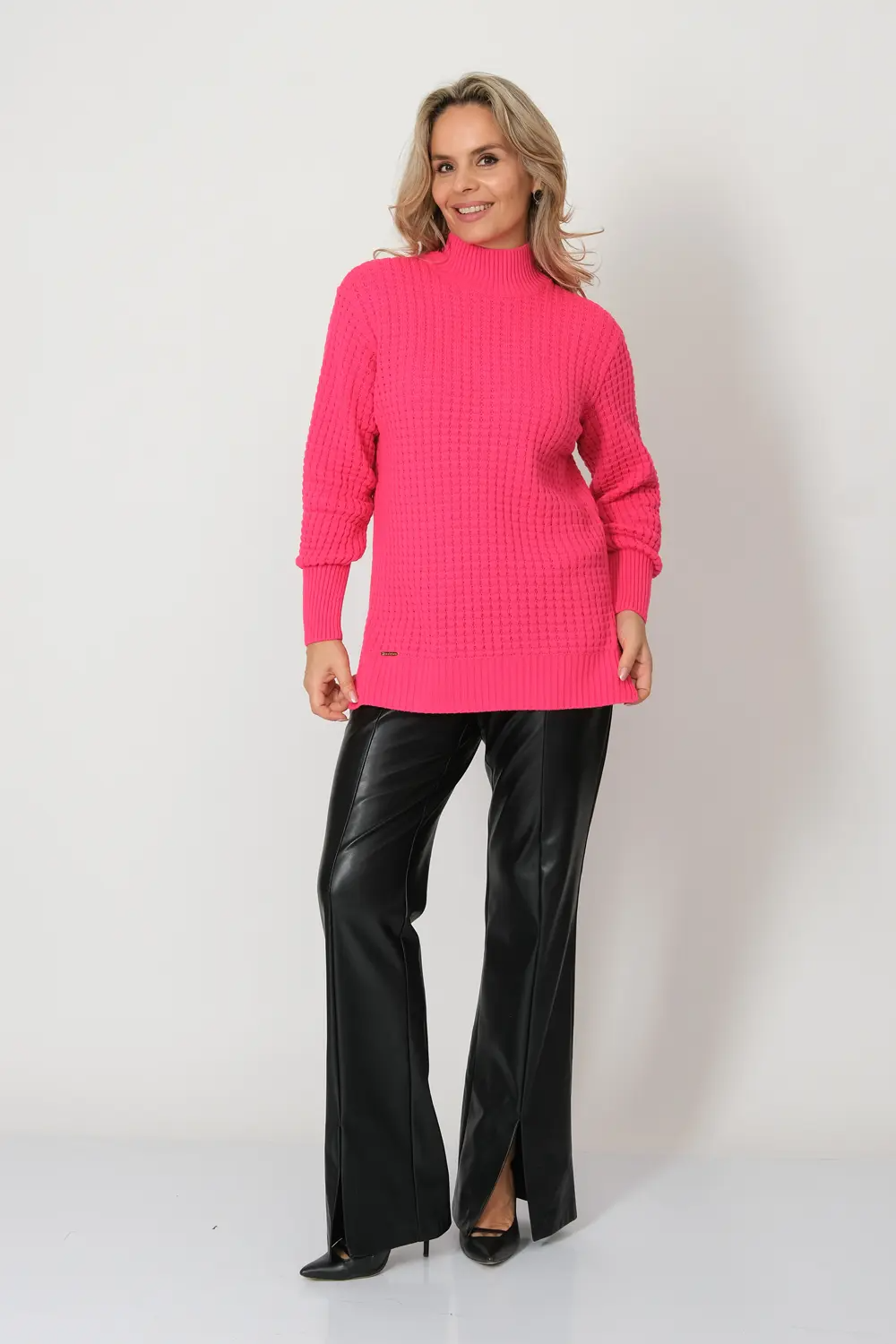 Женский джемпер с воротником-стойка. Спущенная линиия плеча и длинный рукав. Стильная модель выполнена из дышащей, износостойкой, мягкой акриловой пряжи с добавлением полиэстера и шерсти. Поэтому джемпер не только прекрасно смотрится, но и комфортно сидит на любой фигуре, не теряет форму и цвет даже после множества стирок. Отлично сочетается с джинсами, брюками и юбками. малина