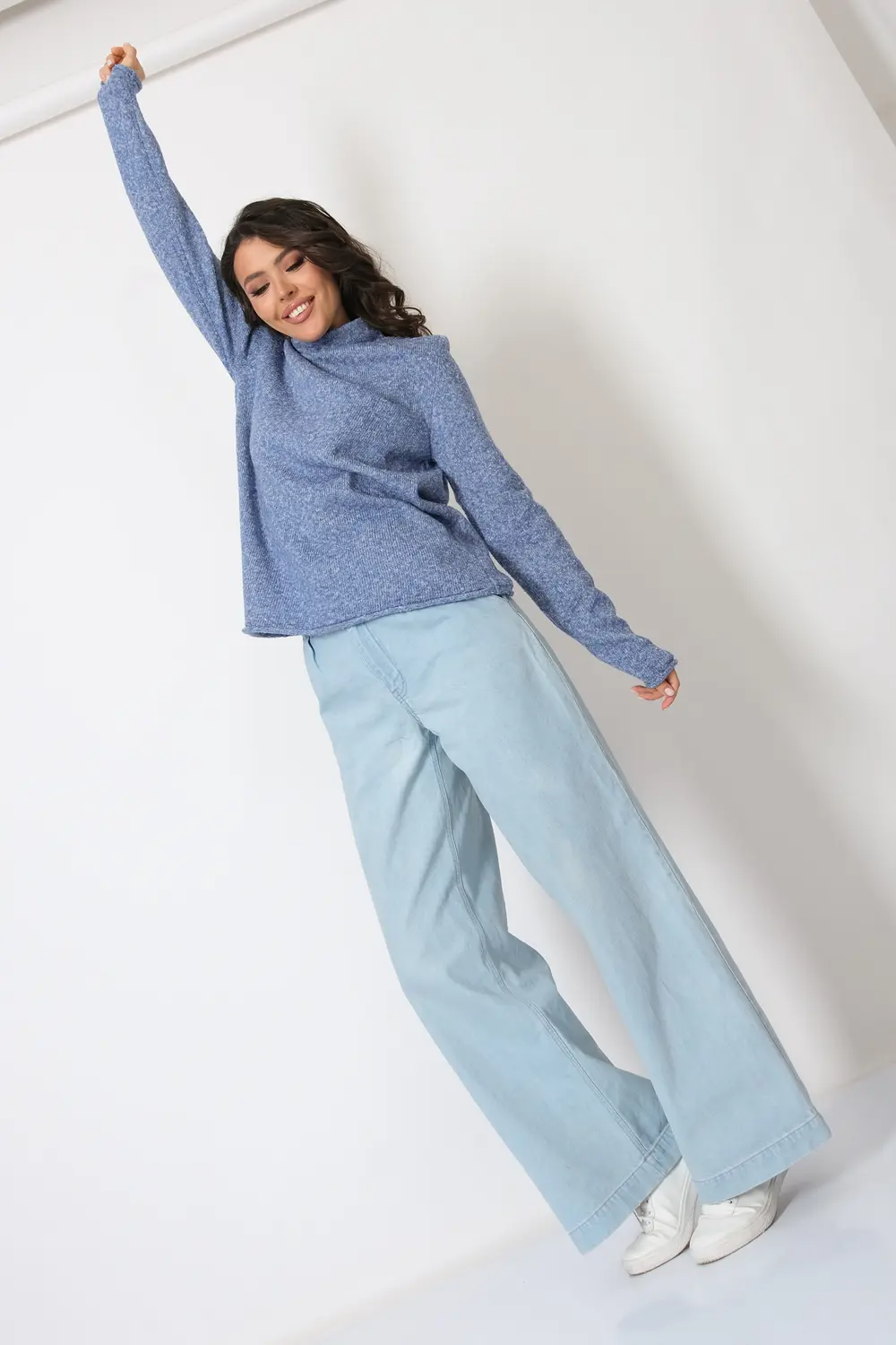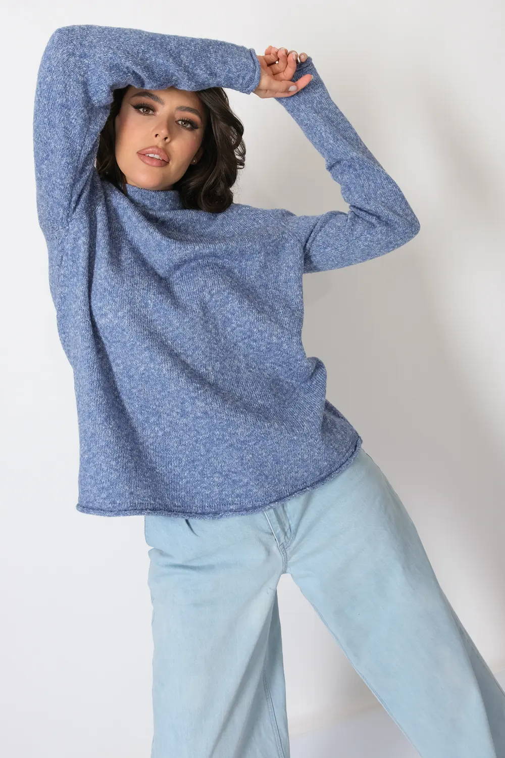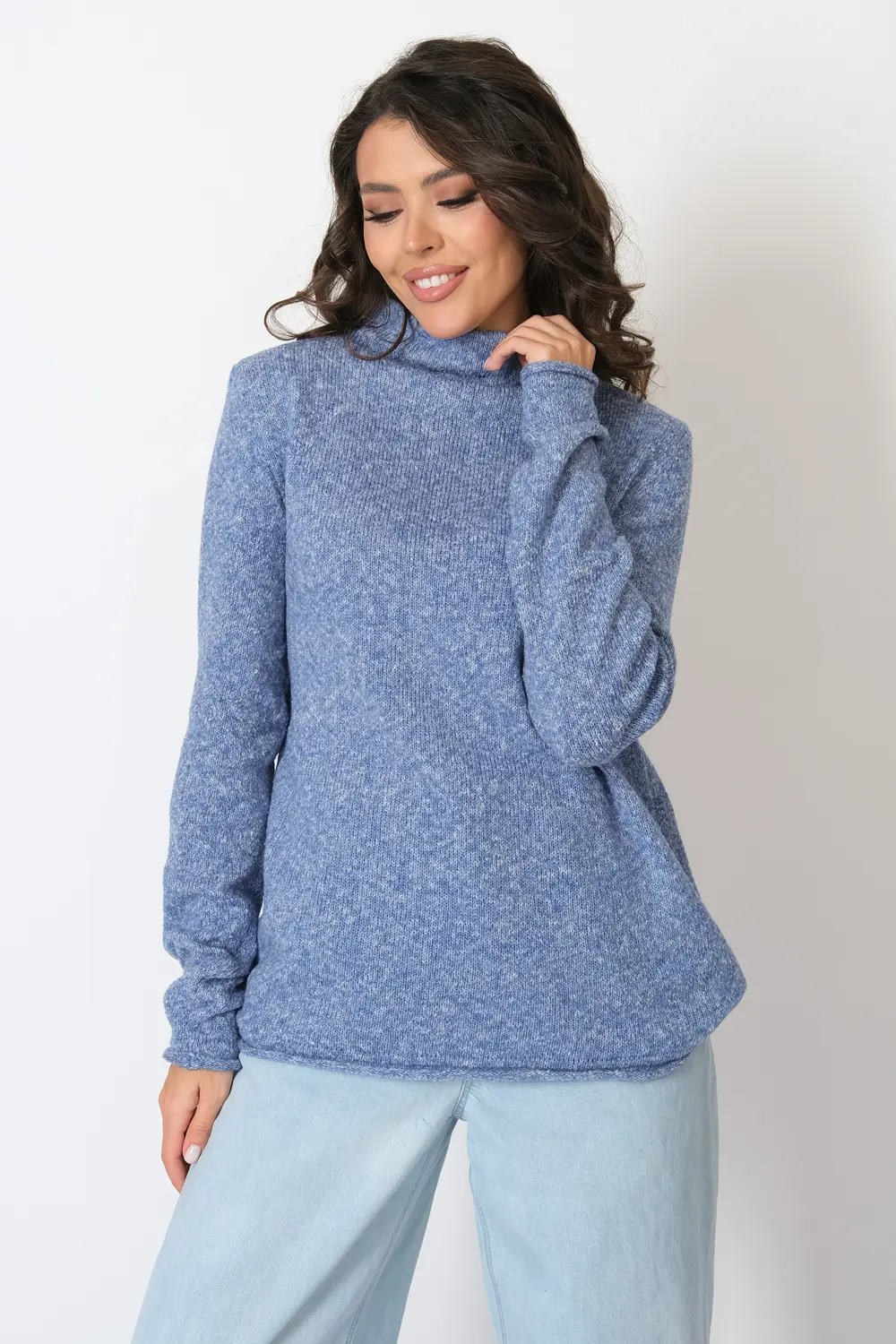Базовый теплый женский джемпер-водолазка. Длинный втачной рукав, цельнокроеный воротник-стойка обеспечивают комфортную в меру свободную посадку. Отсутствие декоративных элементов делает однотонный  джемпер с горлом универсальной, будь то школьная форма или офисный костюм, создавая стильный и функциональный образ для осени и зимы. джинс