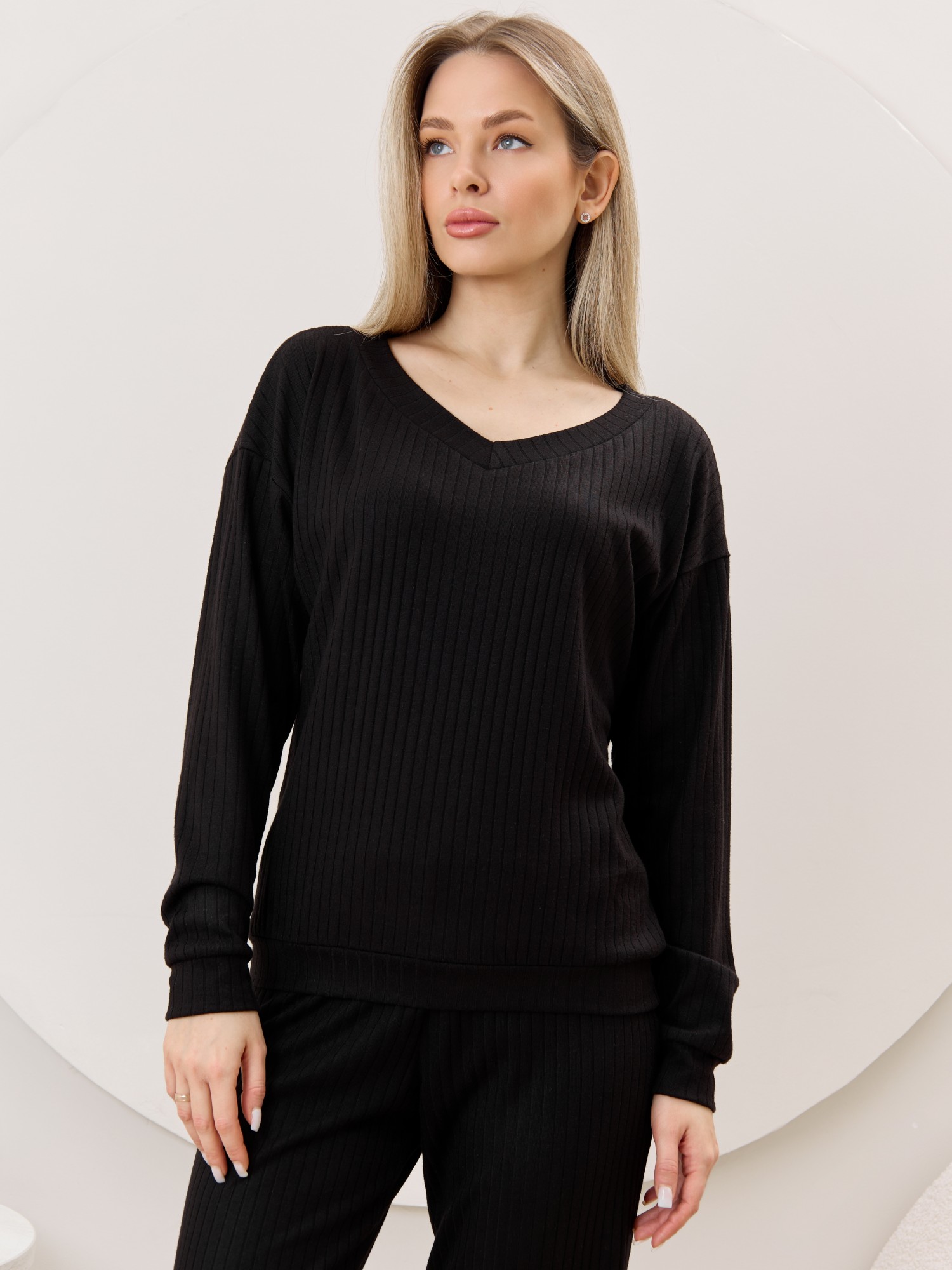 Джемпер женский из гладкокрашенного трикотажного фактурного полотна в «рубчик» с добавлением ангоры, классического покроя, с расширенной V-образной горловиной, обработанной втачной планкой, длинными втачными рукавами. Низ изделия обработан притачным поясом, рукава с манжетами.