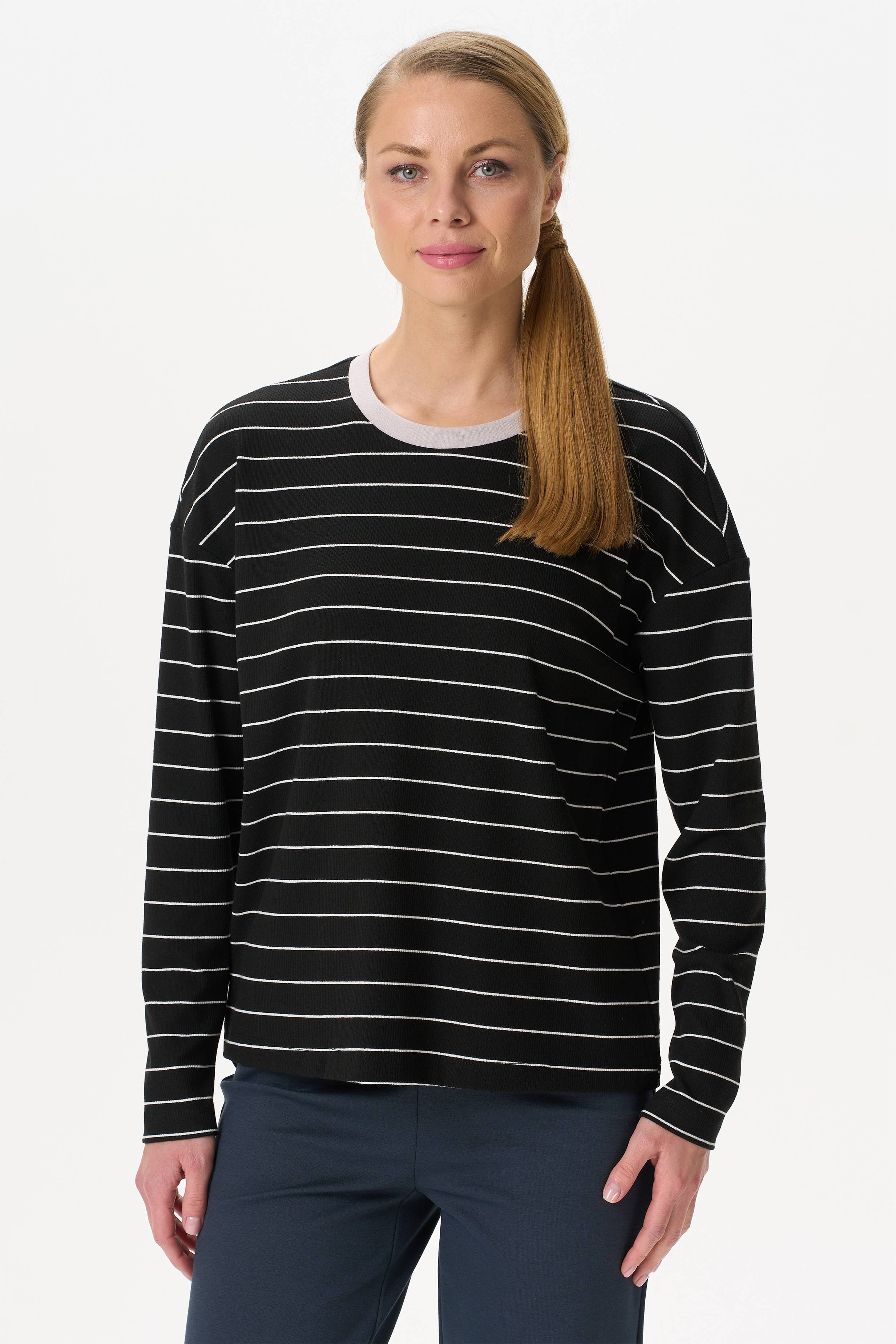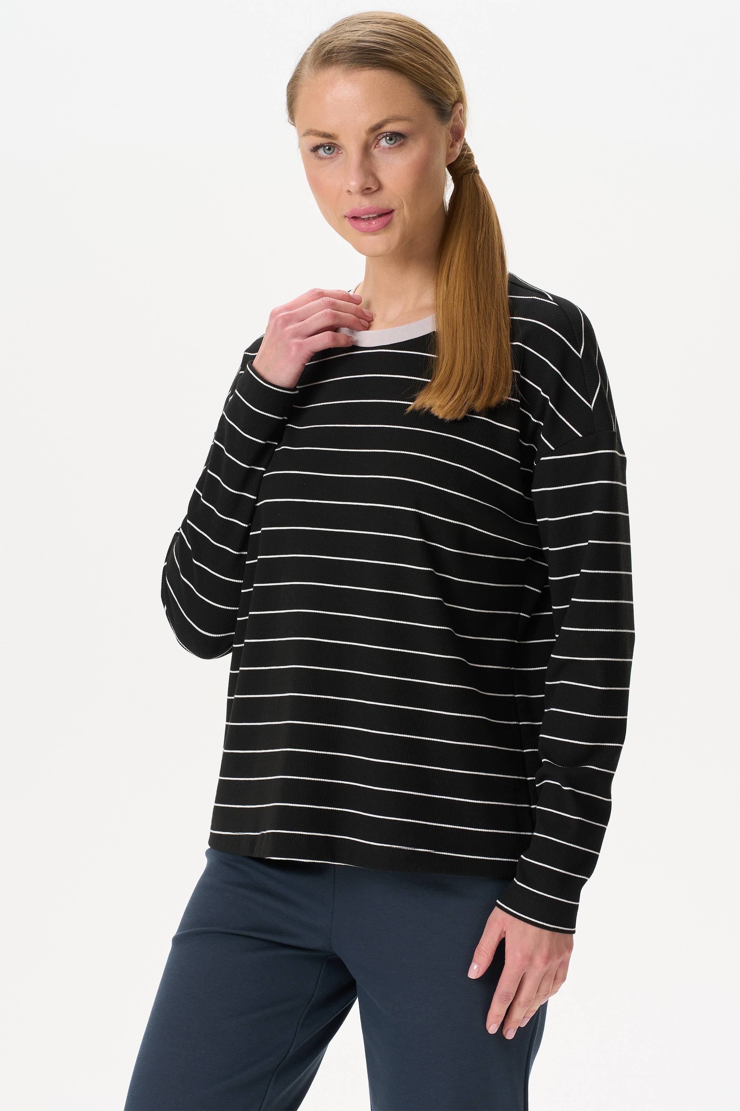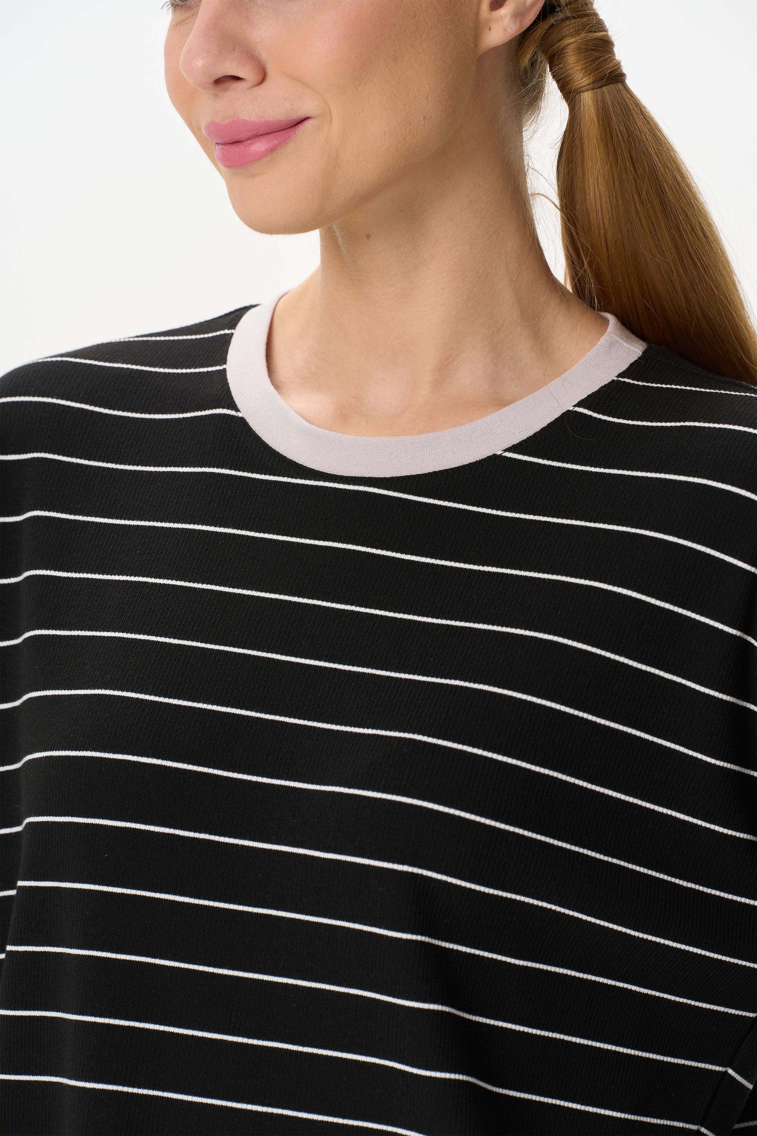 75% вискоза, 25% полиэстер Джемпер в полоску свободного кроя, выполнен из вискозного полотна - кашкорсе. Круглый вырез горловины оформлен хлопковым полотном - рибана контрастного цвета. Спущенные длинные рукава. Рост модели на фото 178см