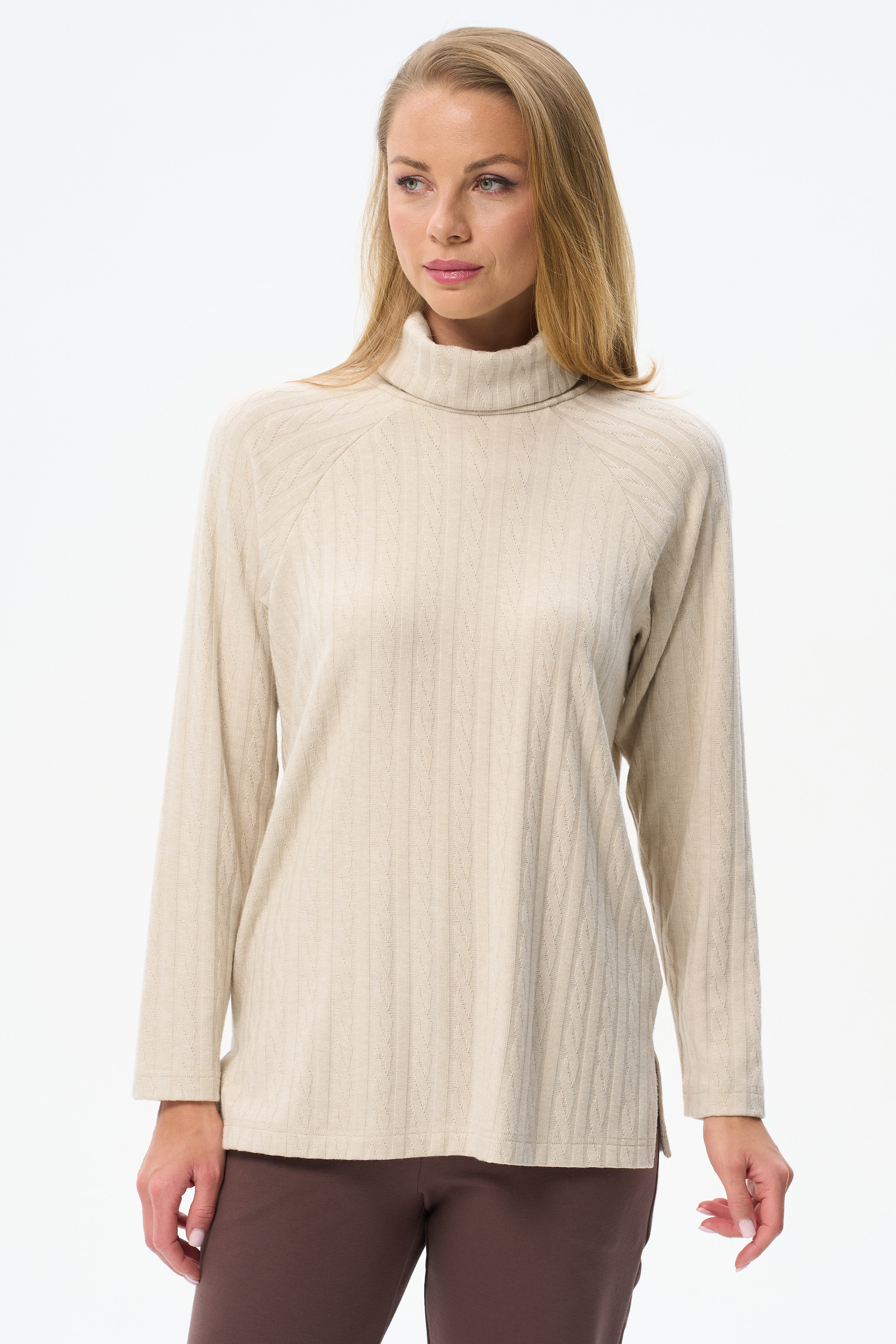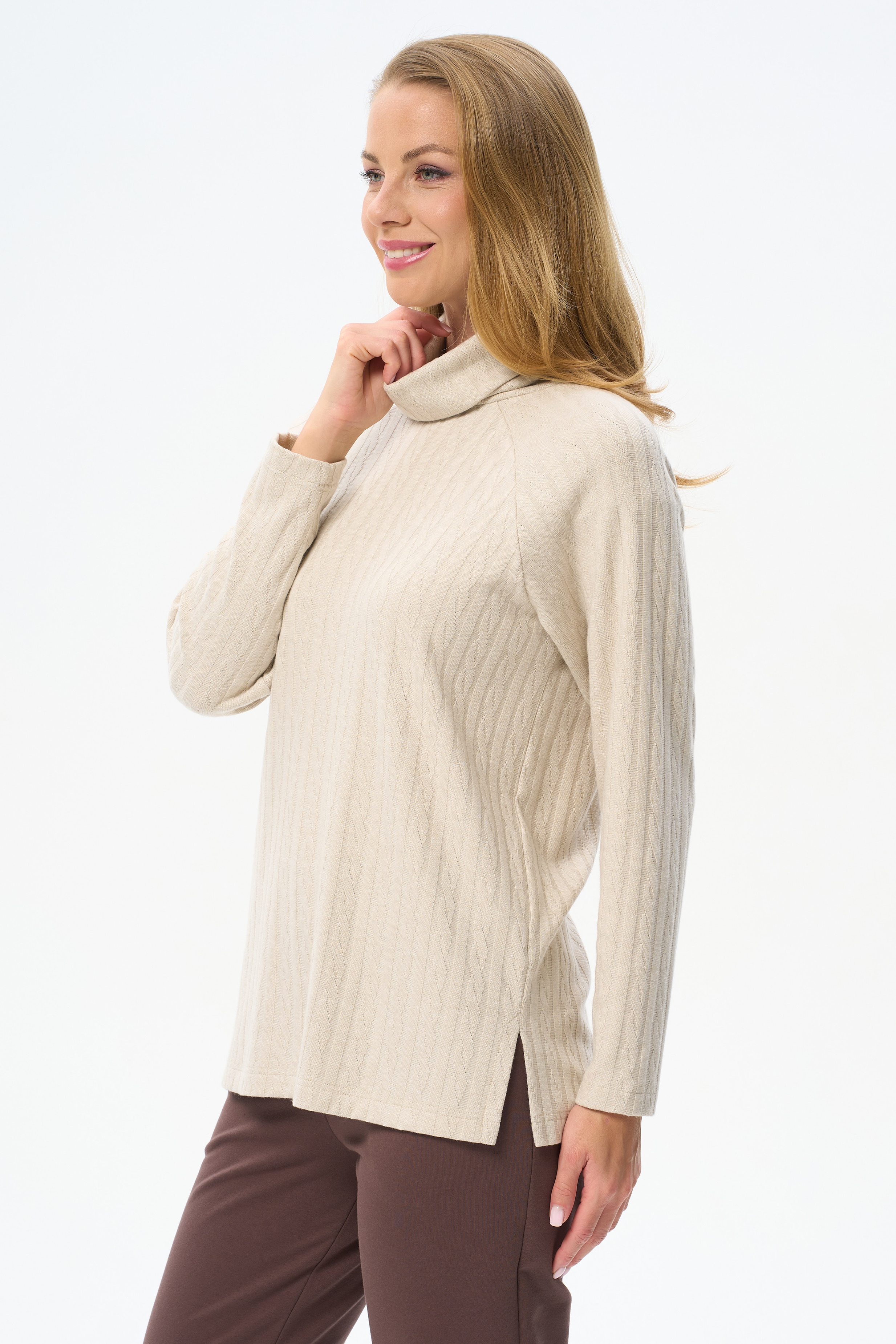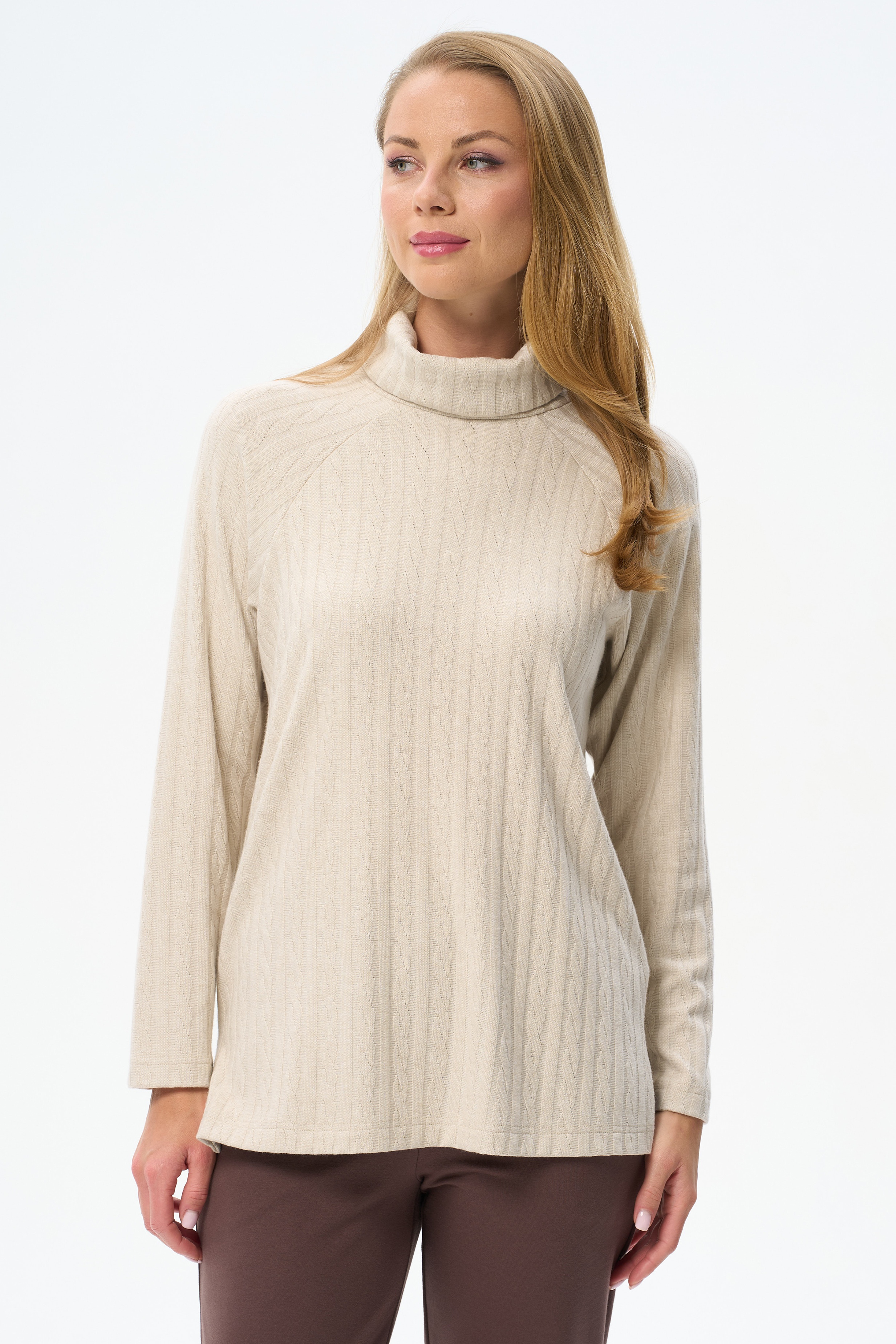 60% вискоза/ 30% полиэстер/ 7% нейлон/ 3% эластан Теплый джемпер из фактурного вискозного полотна. Воротник - стойка, длинные рукава реглан, по низу боковых швов разрезы. Рост модели на фото 178 см.