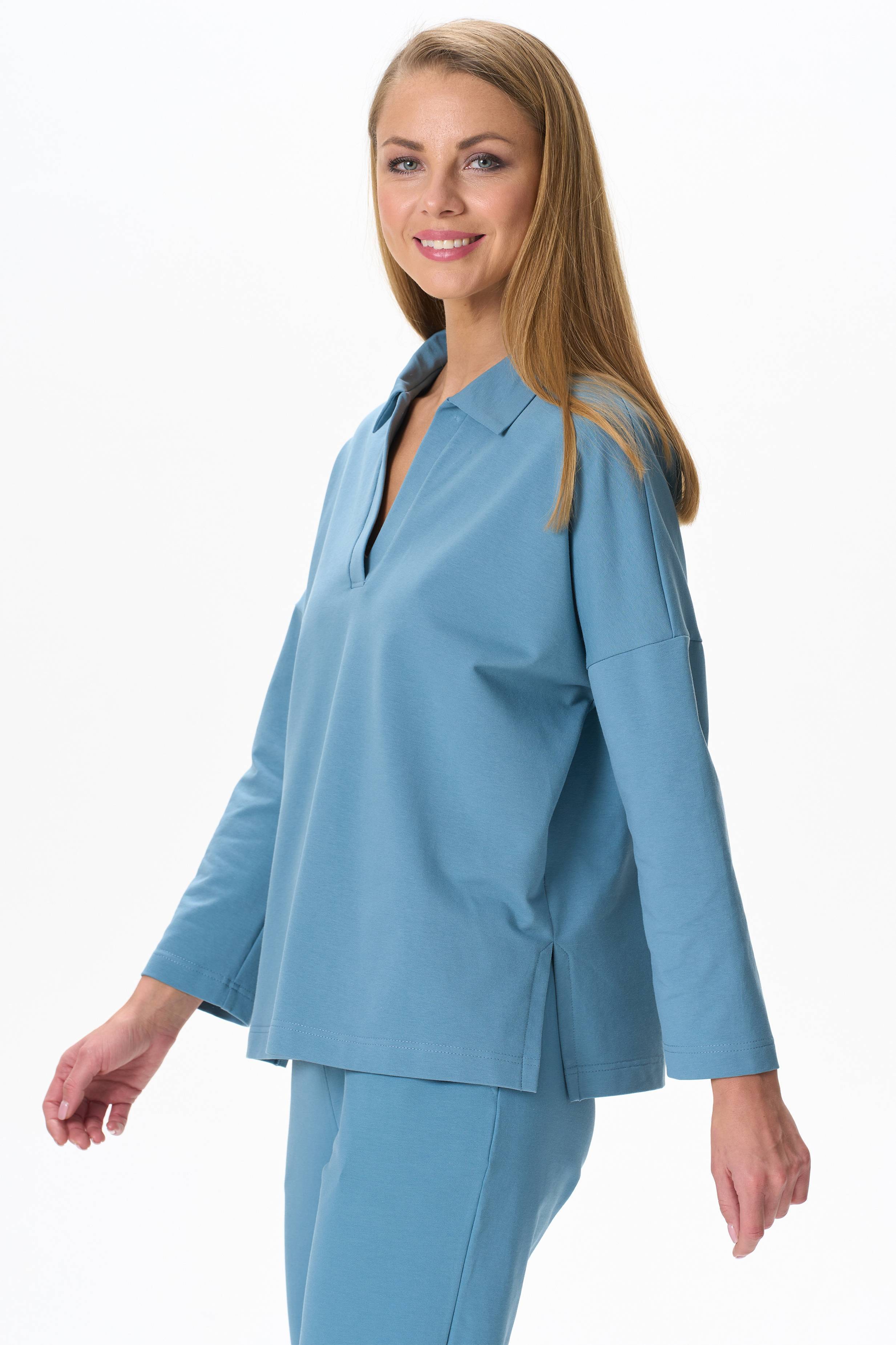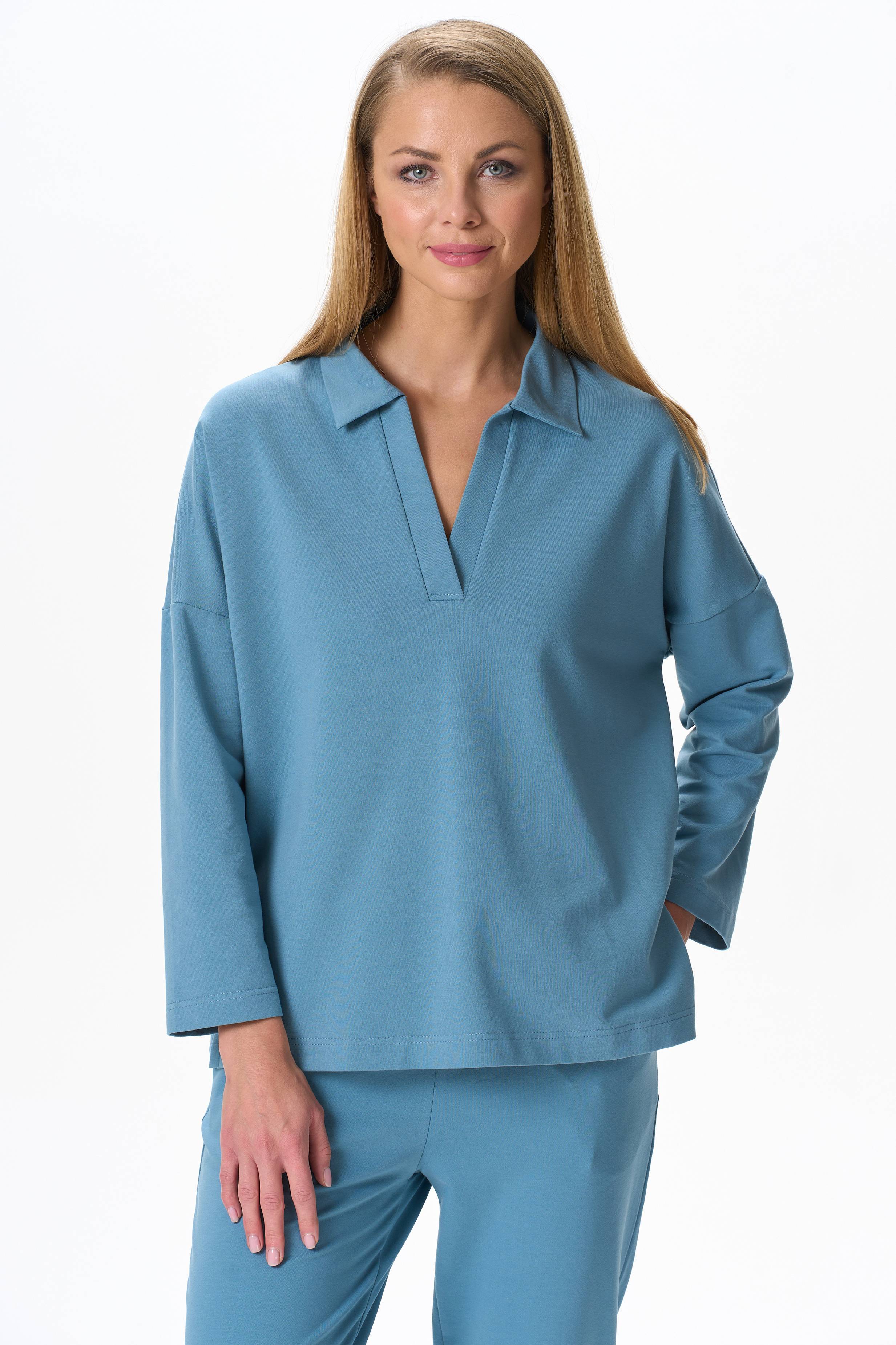 92% хлопок, 8% эластан Джемпер из хлоткового футера 2х нитки. Отложной воротник, спущенная линия плеча, длинный рукав. По низу изделия в боковых швах разрезы. Роста модели на фото 177.