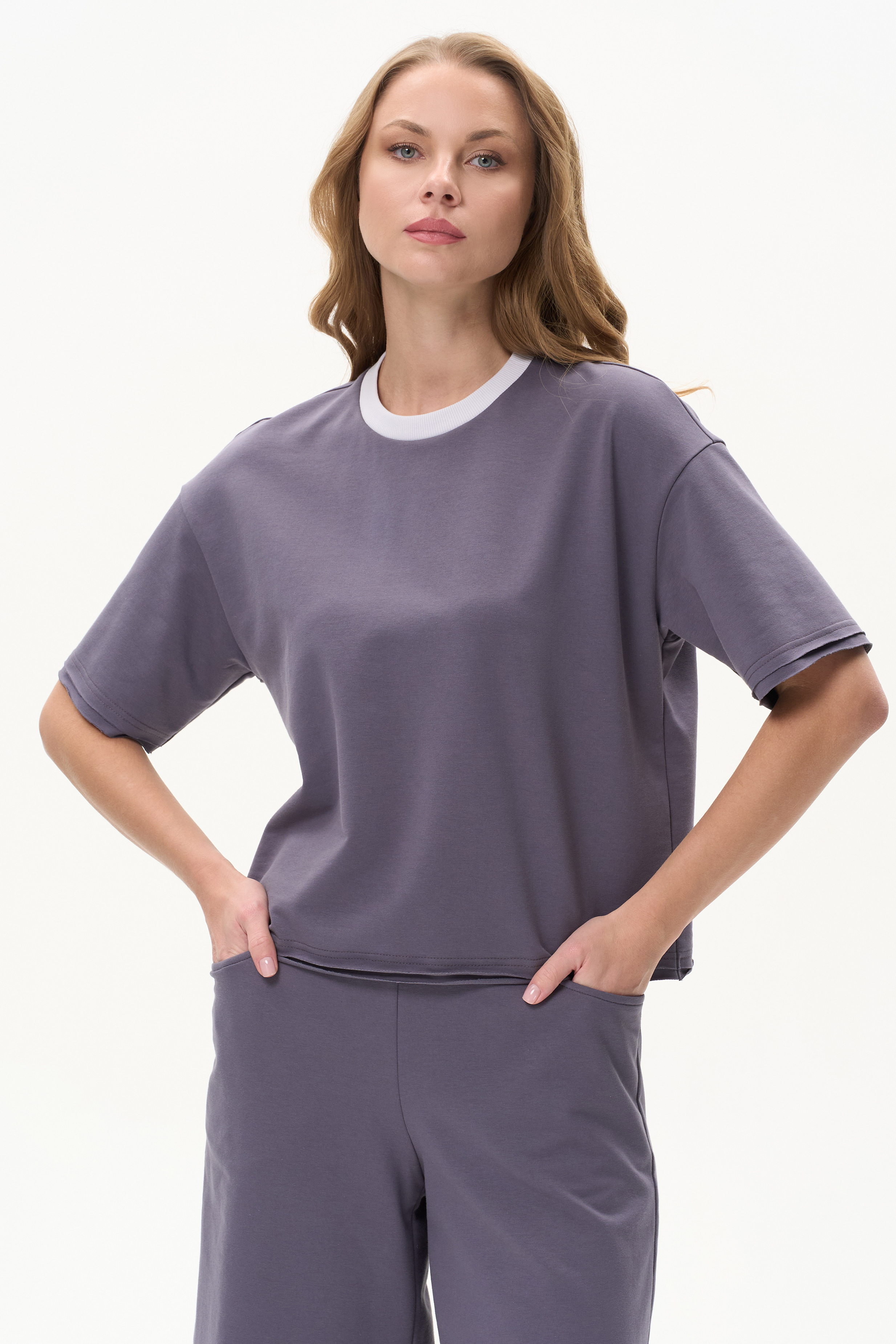 Стильный джемпер из тонкого футера качества ПЕ 240 гр в трендовом оттенке Утренний туман. Круглый вырез горловины обработан хлопковым кашкорсе в Жемчужном оттенке, рукава до локтя, низ изделия с двойной деталью с открытыми срезами.