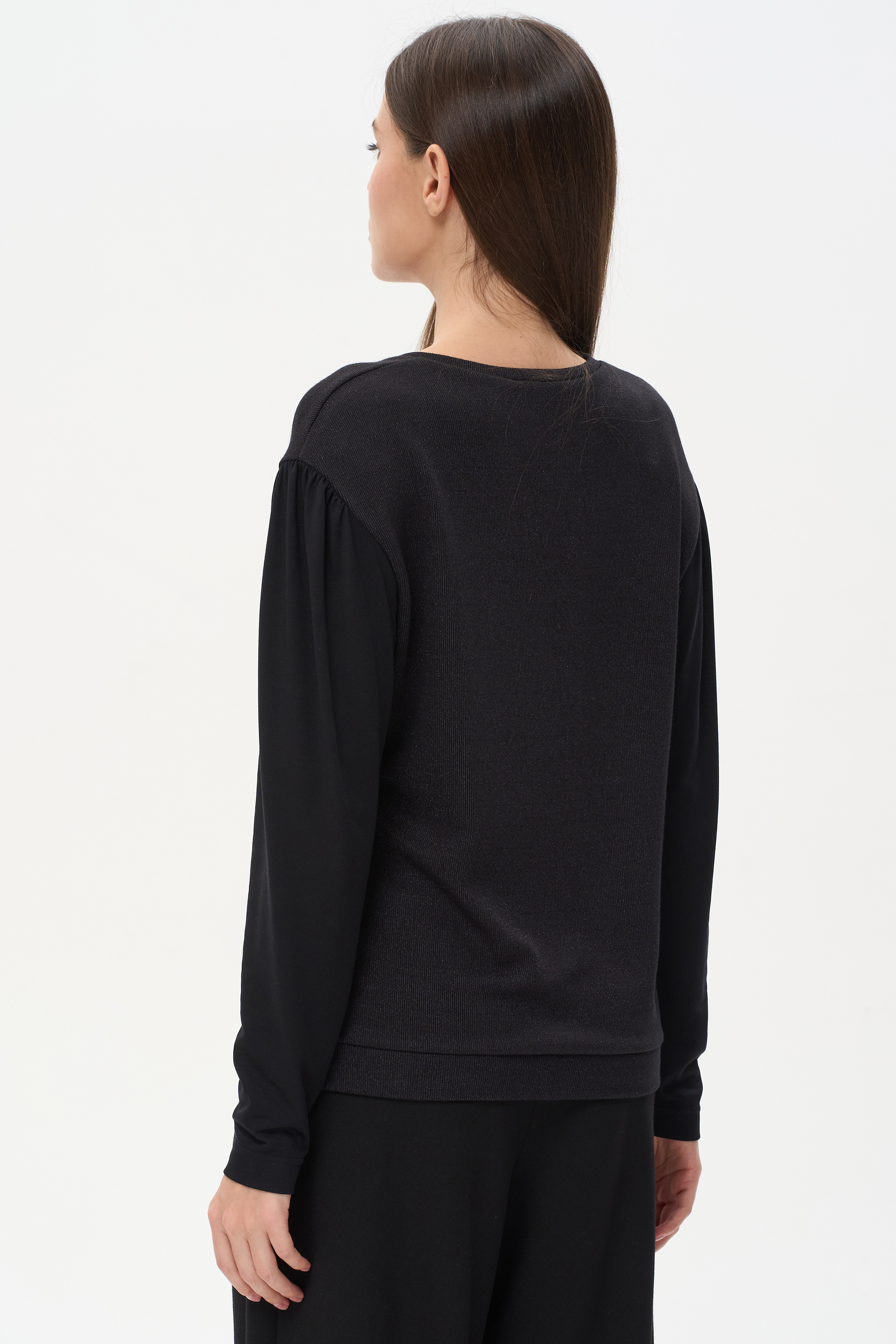 Нарядный свободный джемпер с V-образным вырезом комбинированный: спинка и полочка из мягкой рибаны с деликатным блеском, рукава длинные из модала. На полочке дизайнерский рисунок из чёрных страз в виде банта.