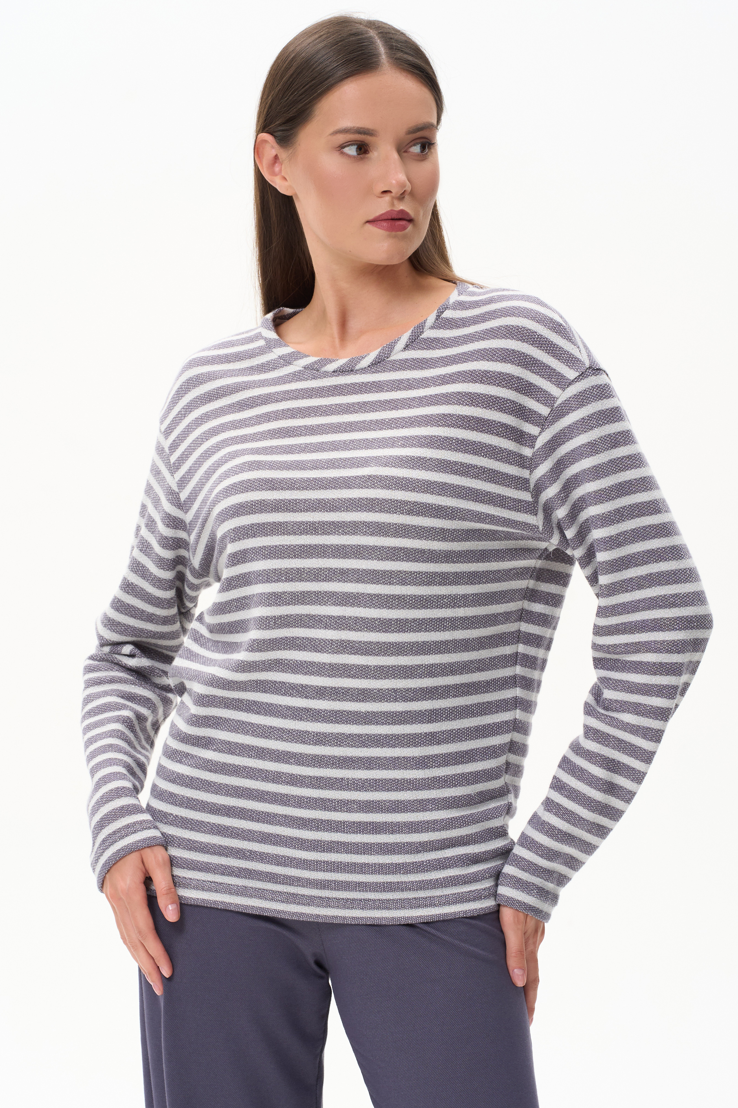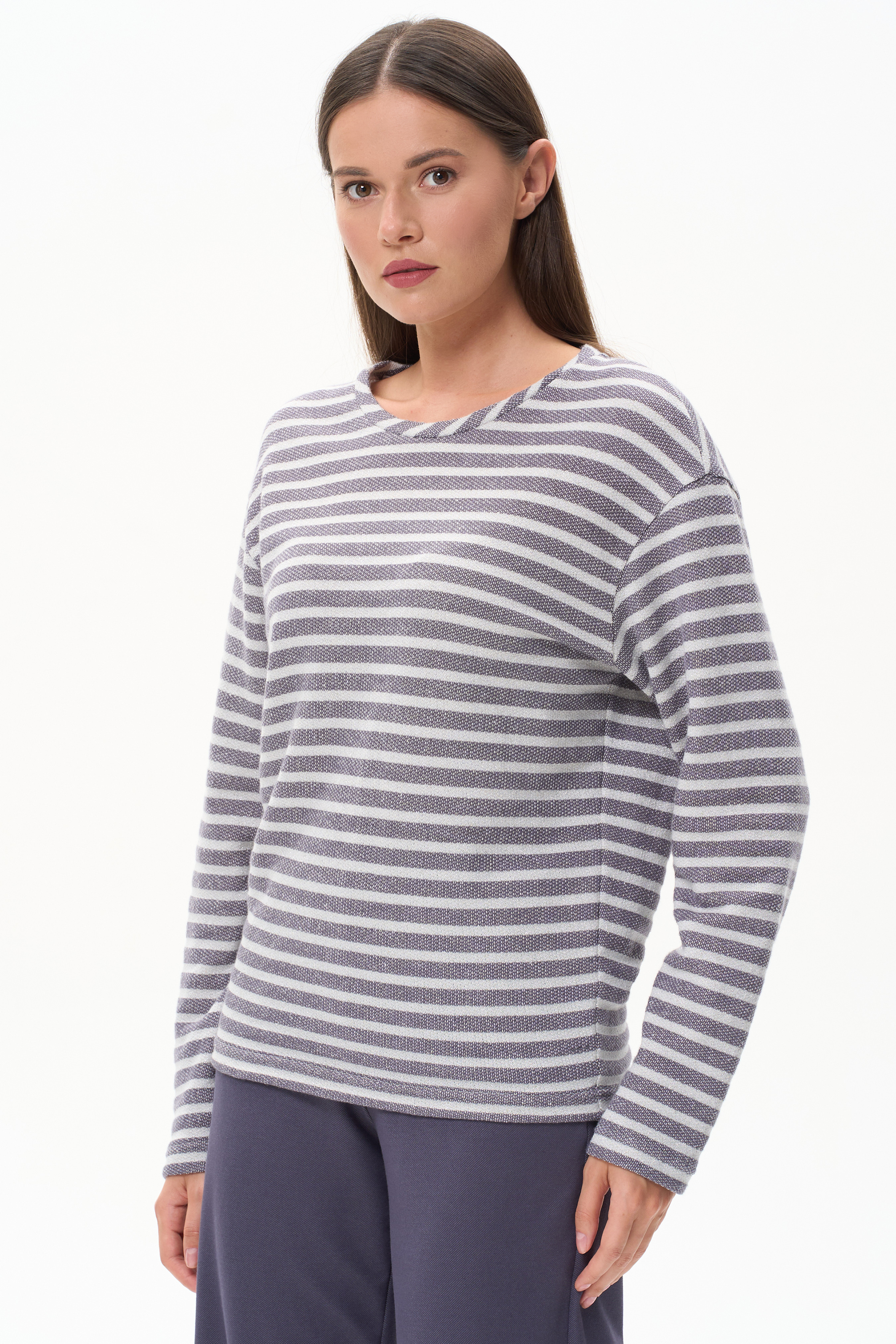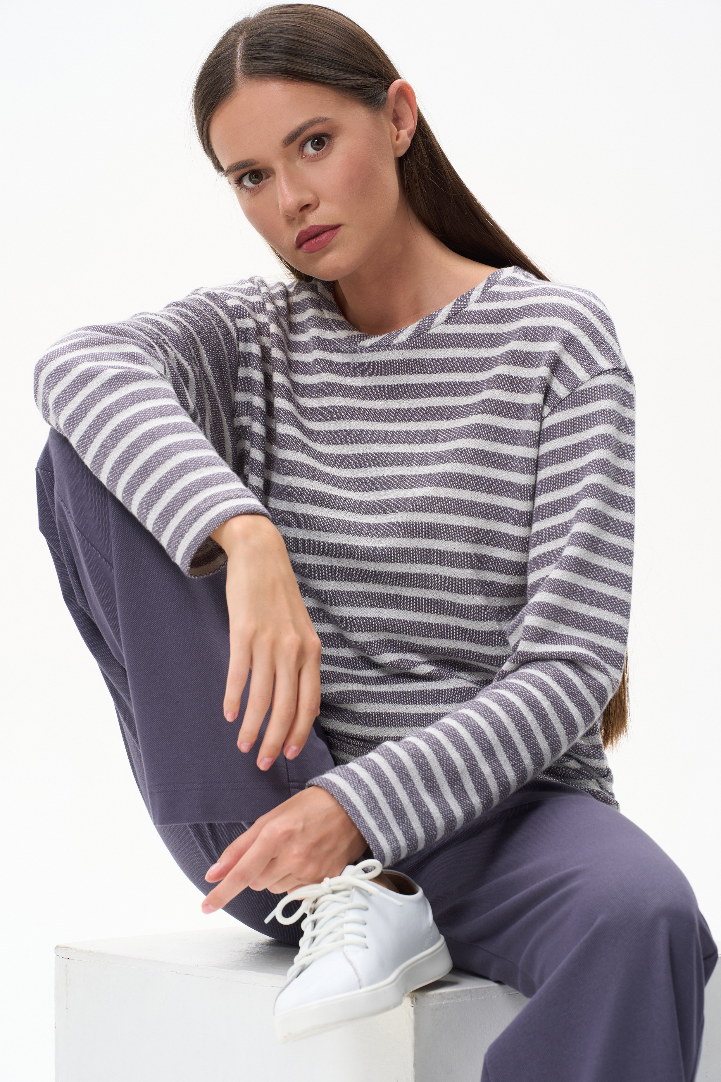 75% хлопок/ 22% полиэстер/ 3% люрекс Джемпер из фактурного жаккарда в полоску в оттенках коллекции 200 гр Модель нового силуэта - свободный в плечевом поясе и прилегающий по бедрам, длинные рукава со спущенным плечом и круглая горловина. Серебристый люрекс в составе полотна придает эксклюзивный вид изделию. Рост модели 175 см.