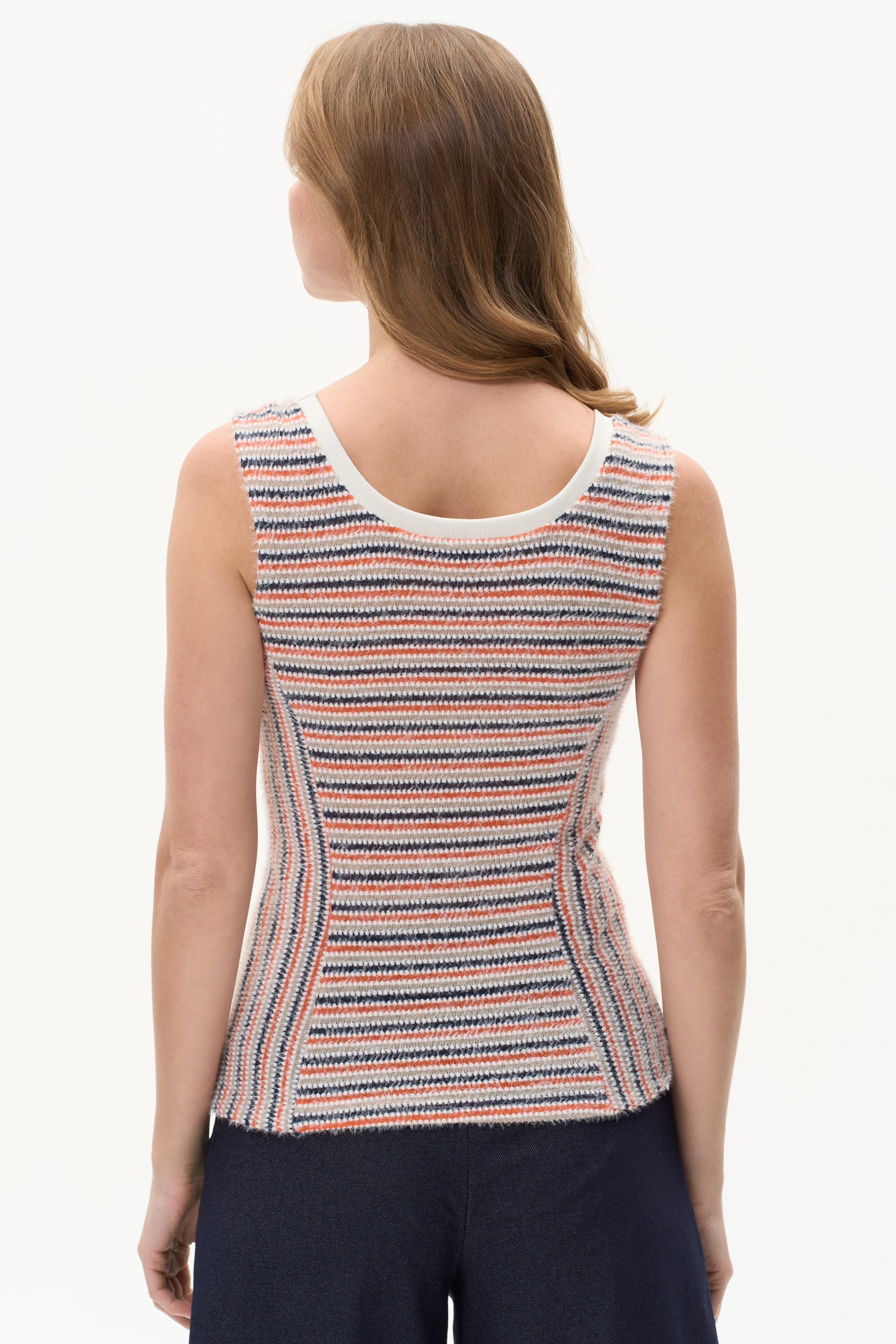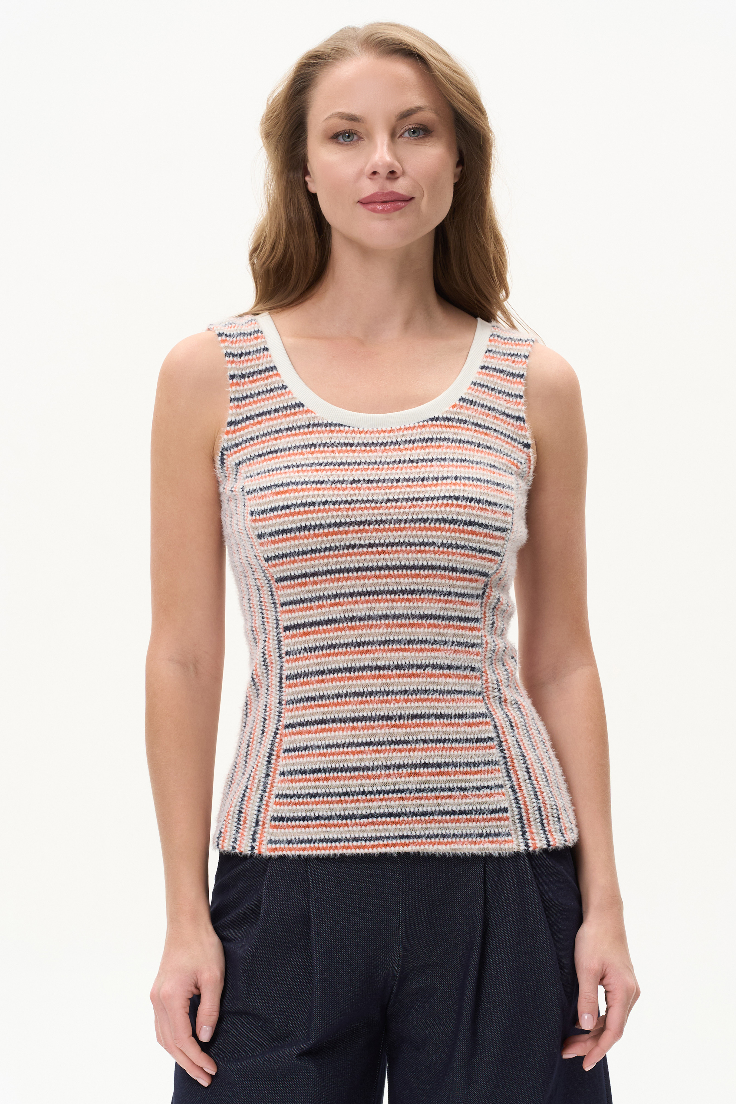 Майка из мягкого фактурного трикотажа в полоску с пухом. Модель с углублённым круглым вырезом горловины, отделана рибаной в тон светлой полоски. Приятная к телу и облегает фигуру, идеальный вариант первого слоя в повседневной коллекции. Рост модели 175 см