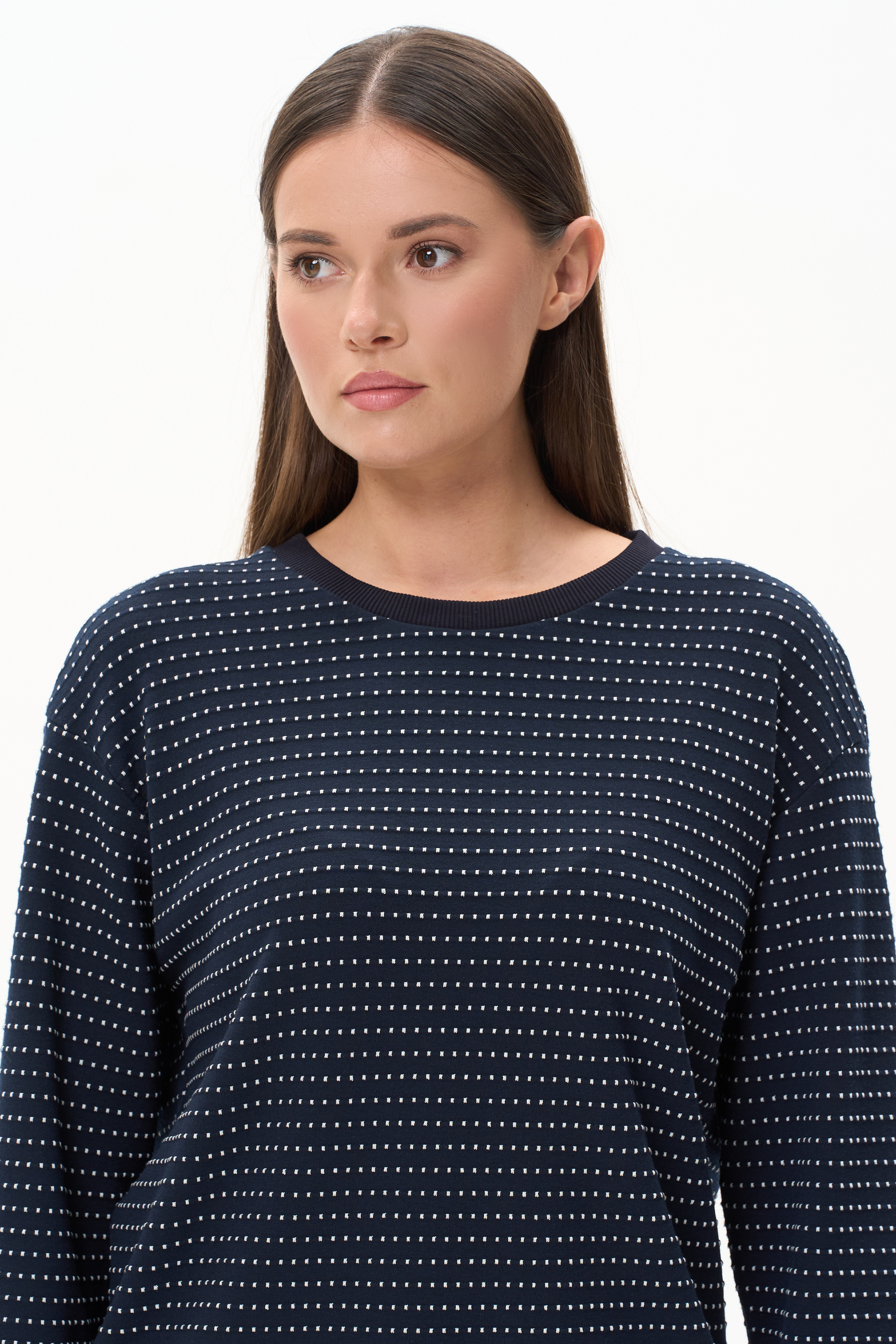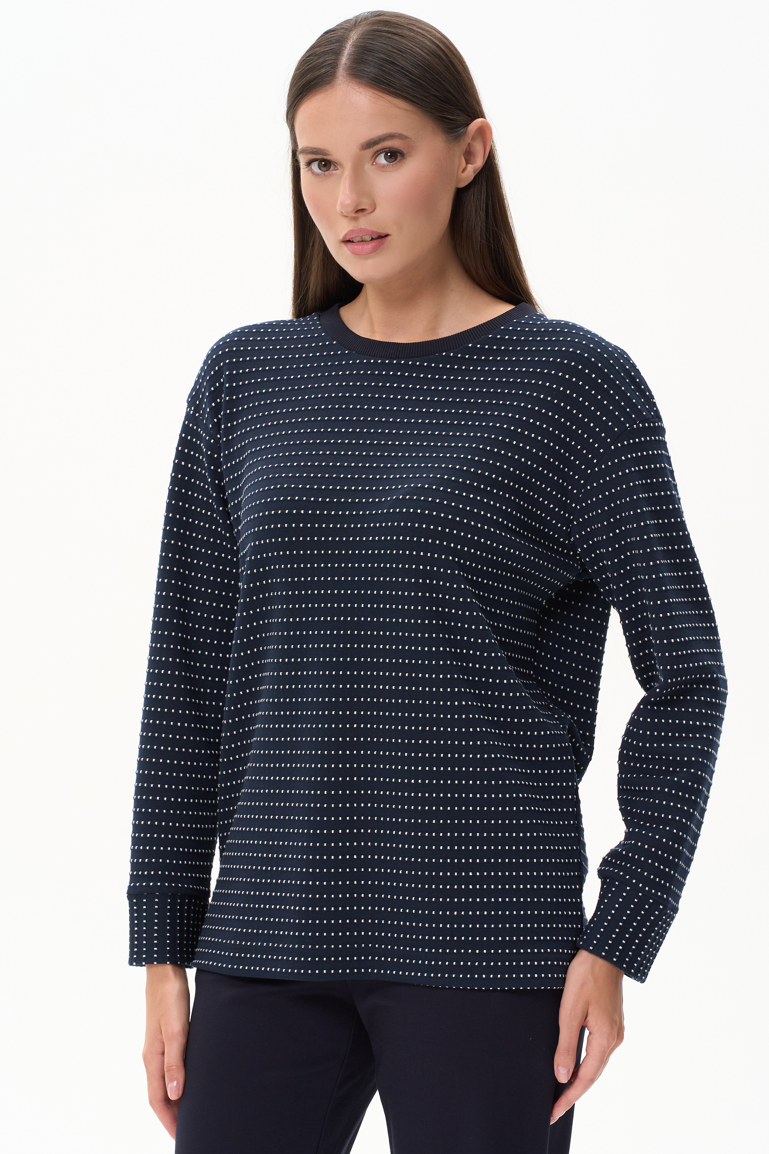 Комфортный джемпер выполнен из вискозного жаккардового трикотажного полотна. Круглый вырез горловины оформлен планкой из хлопкового трикотажного полотна - кашкорсе. Длинные втачные рукава с манжетами. Рост модели на фото 178 см.