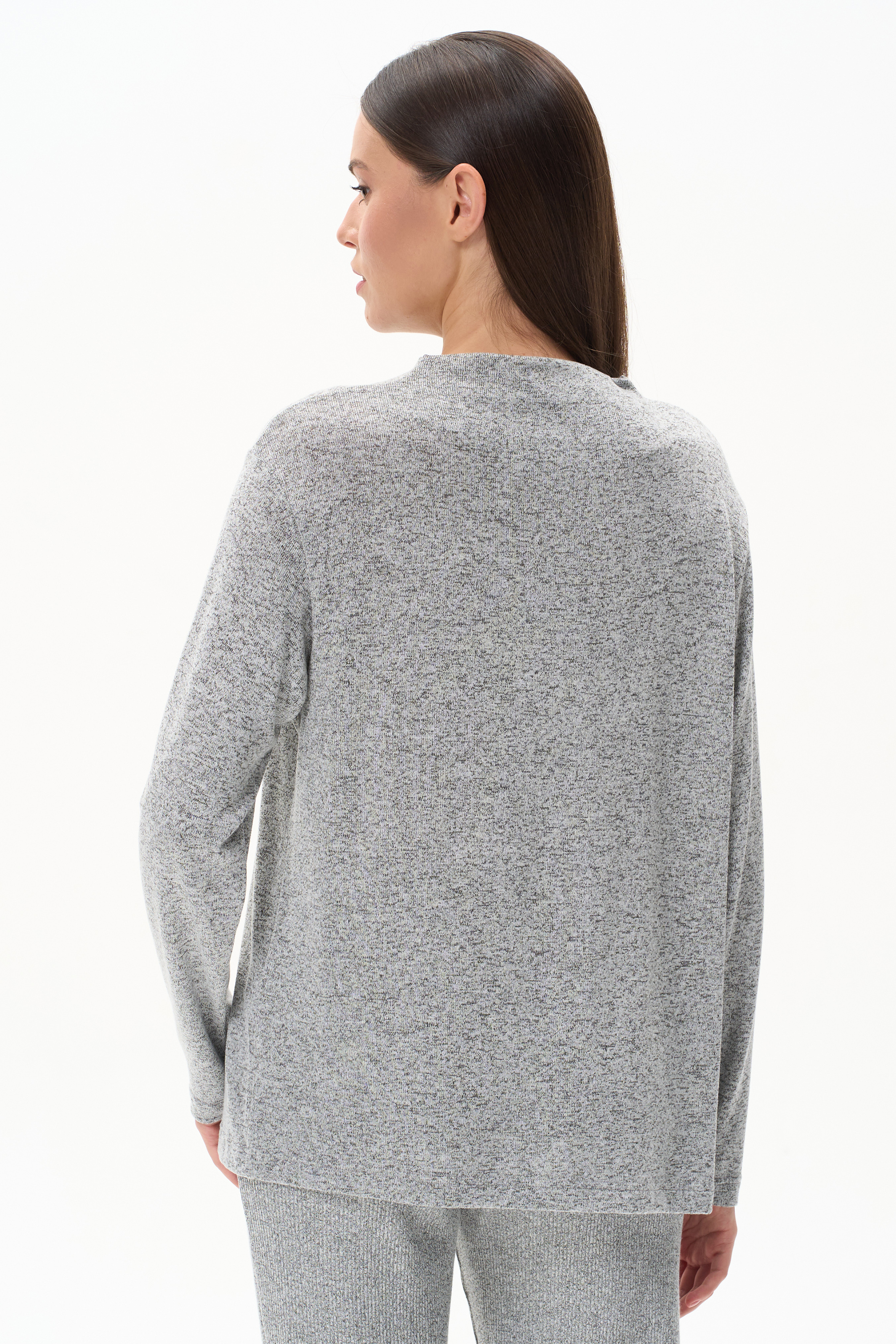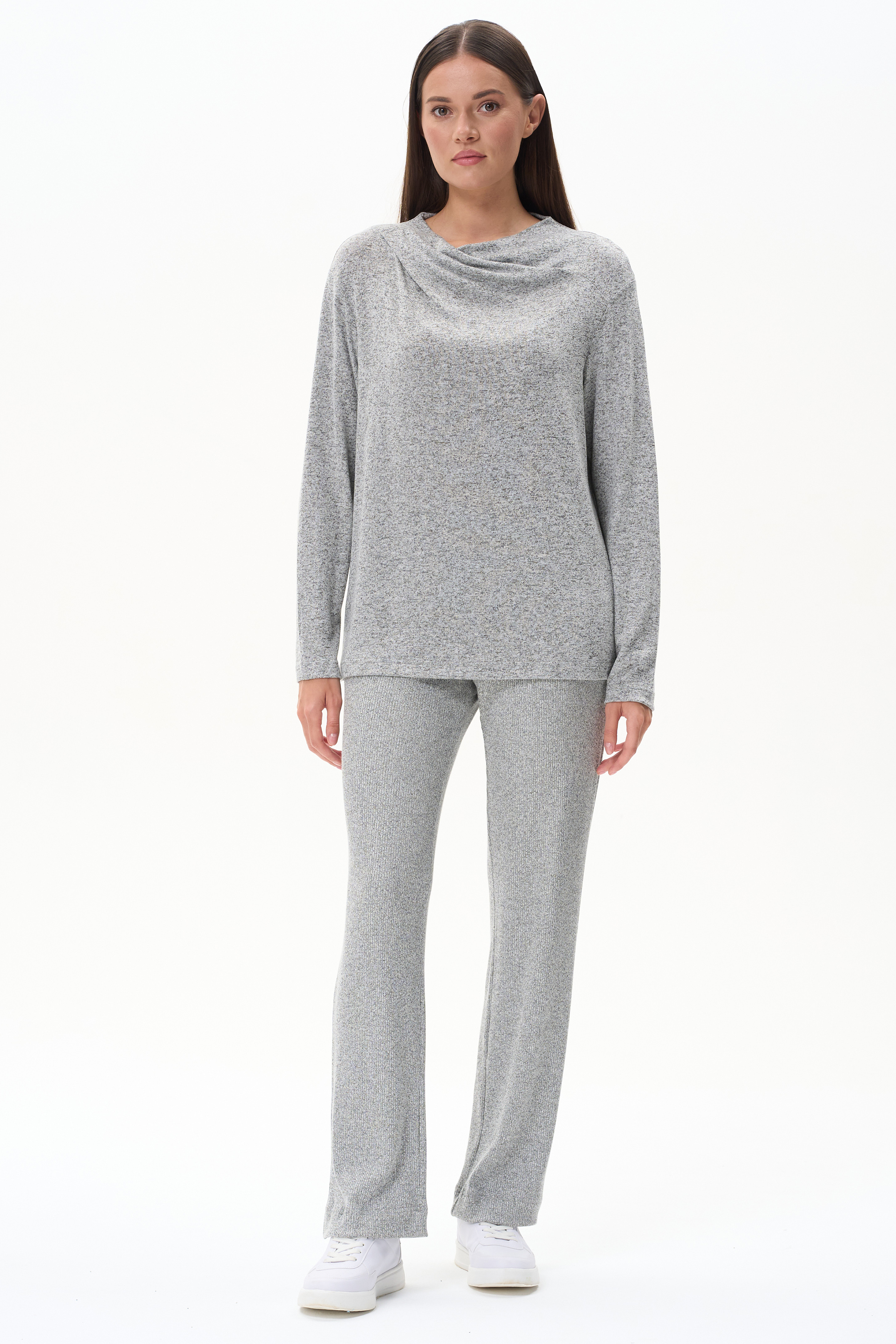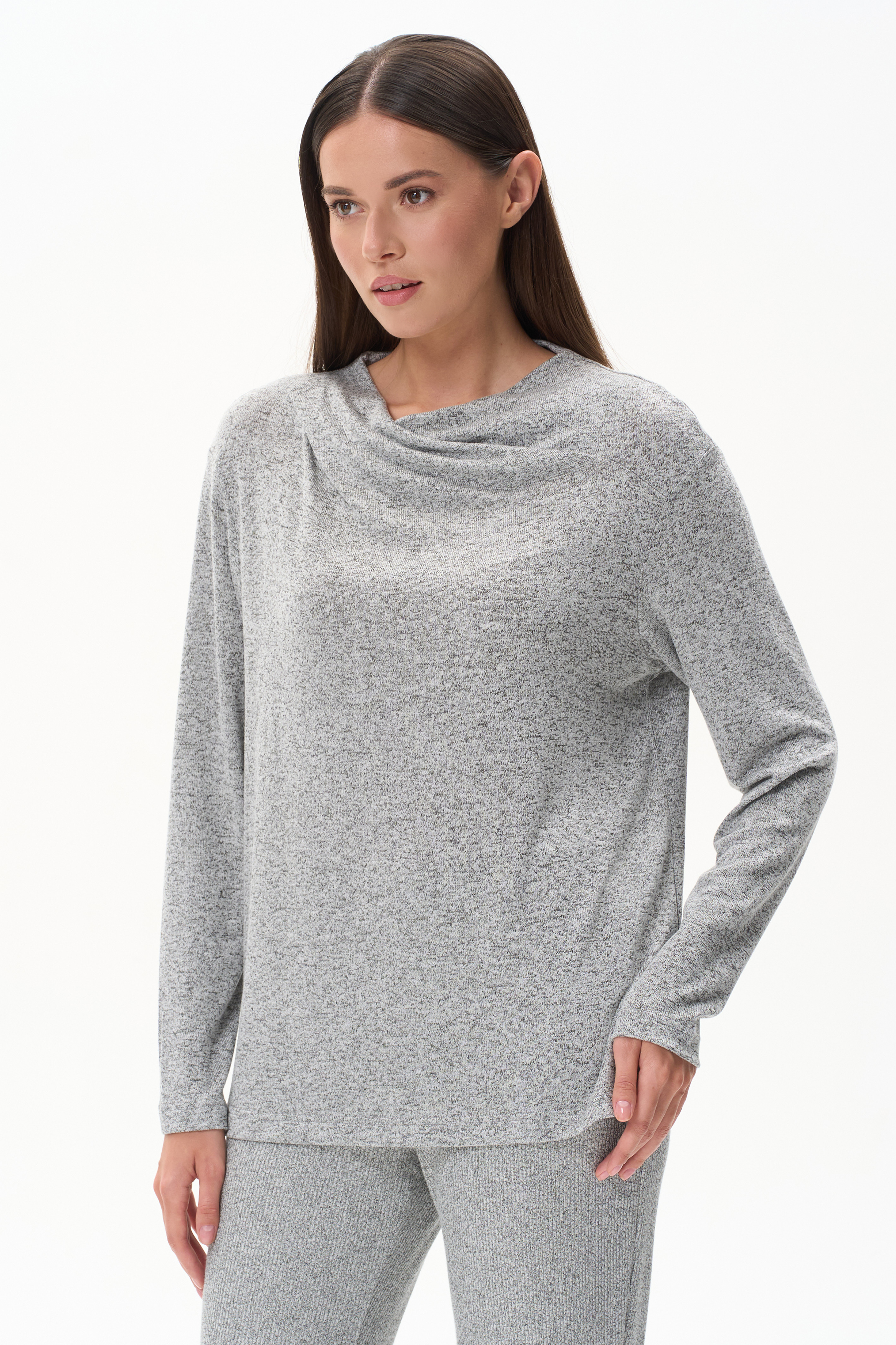 Джемпер выполнен из вискозного меланжа. Вырез горловины драпируется и закладывается естественными складками. Спущенная линия плеча, втачные рукава. Рост модели на фото 178 см