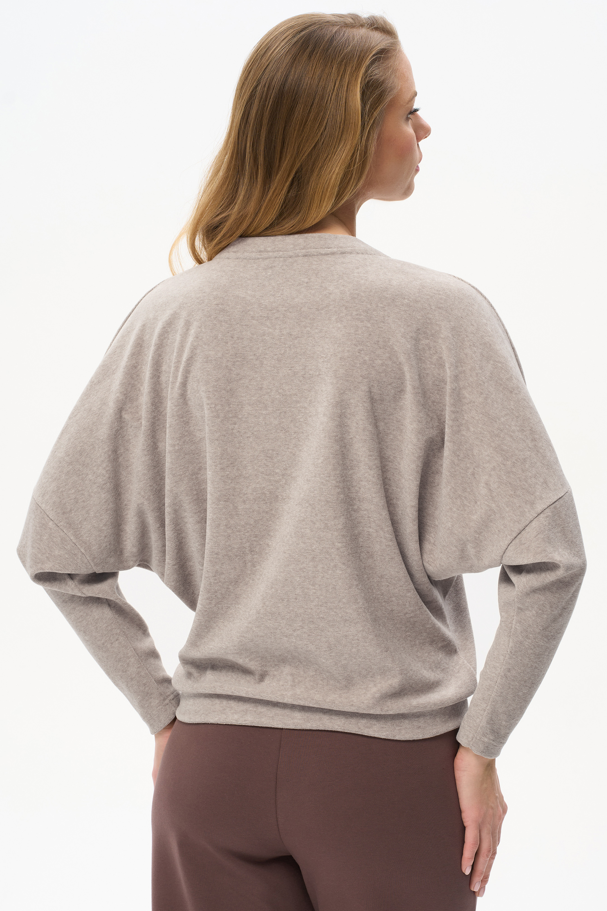 64% вискоза/ 22% полиэстер/ 8% нейлон/ 6% эластан Элегантный джемпер в стиле 80-х, с заниженной проймой, почти от талии. Рекомендуем дополнить образ юбкой из такого же полотна, либо брюками из футера бежевого цвета.