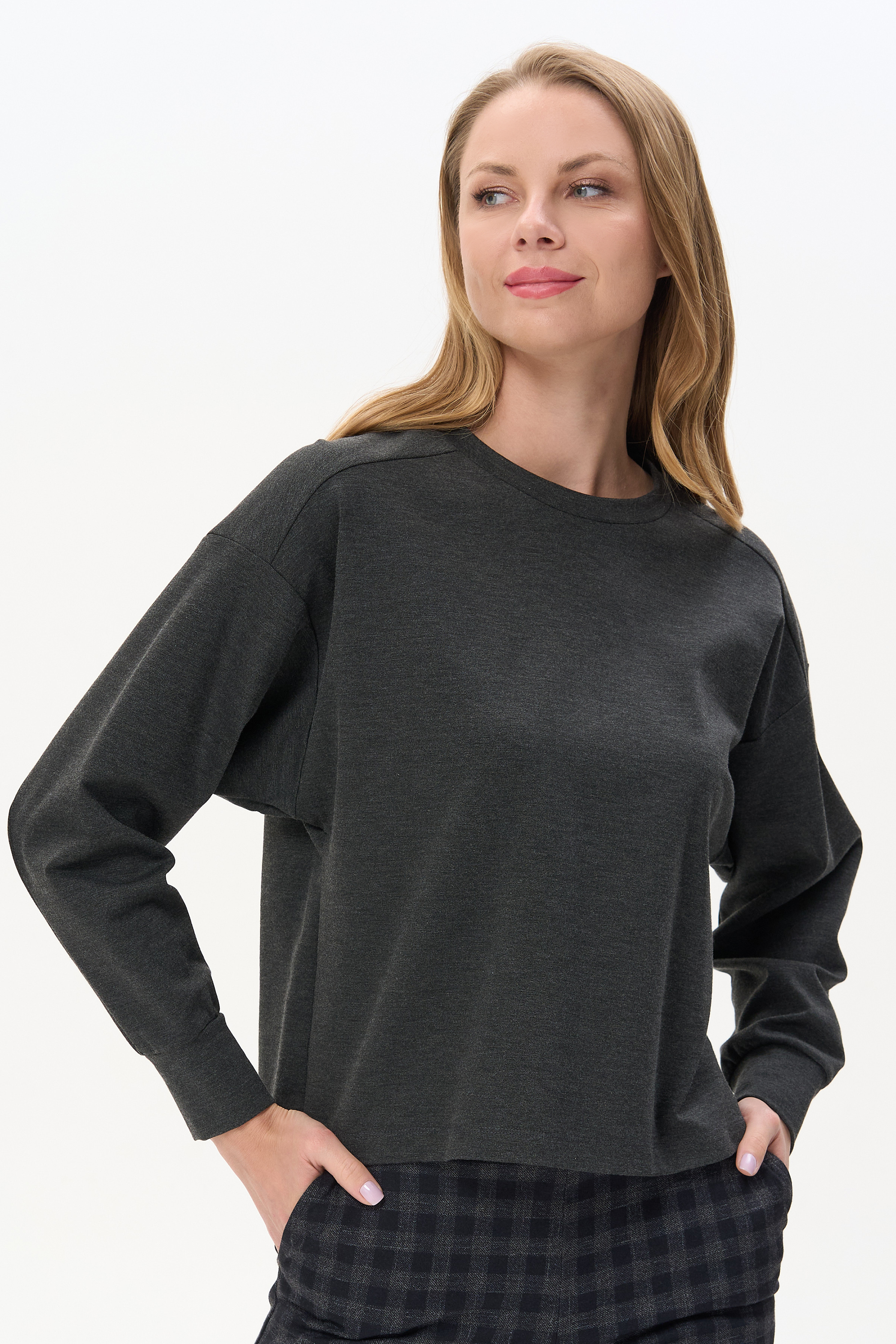 Джемпер из поливискозного меланжевого полотна. Хорошо держит форму. Свободный крой, круглый вырез горловины, длинные втачные рукава на манжетах. Рост модели на фото 177 см