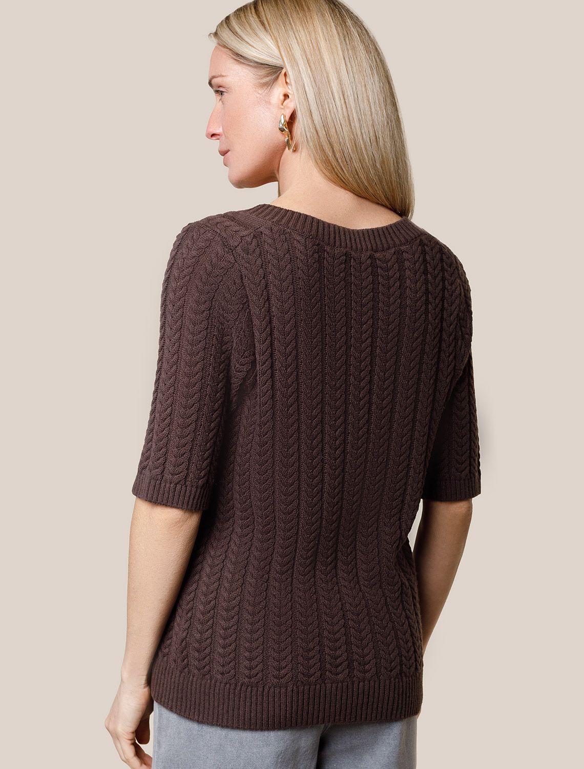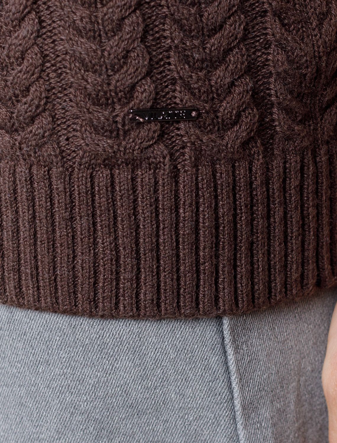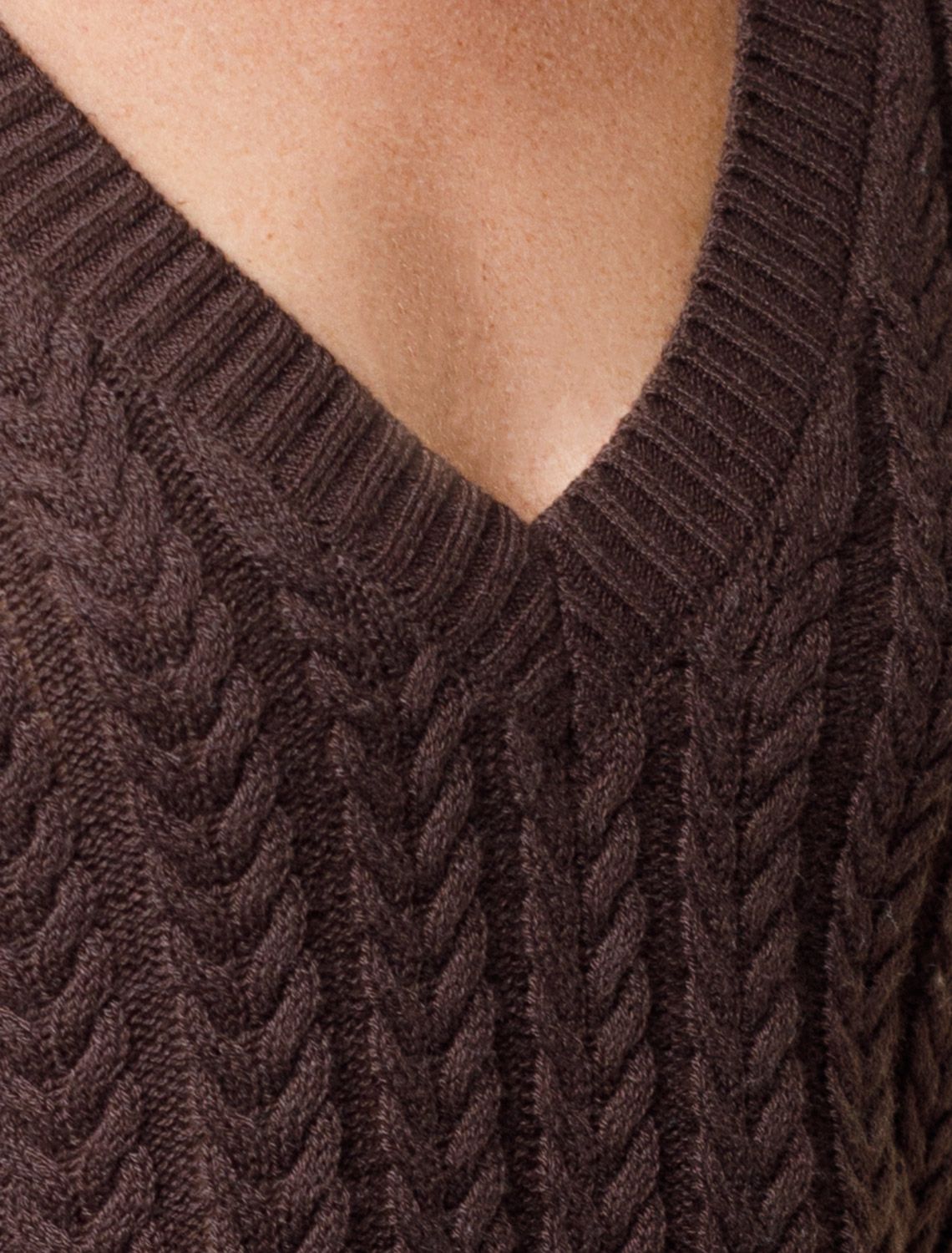 Джемпер фактурной вязки выполнен из хлопка с добавлением кашемира. Модель с V-вырезом с вывязанным орнаментом цепи. Мягкая и очень приятная пряжа совершенно не колется, сохраняет тепло при этом не перегревая, гарантируя безупречный комфорт. коричневый