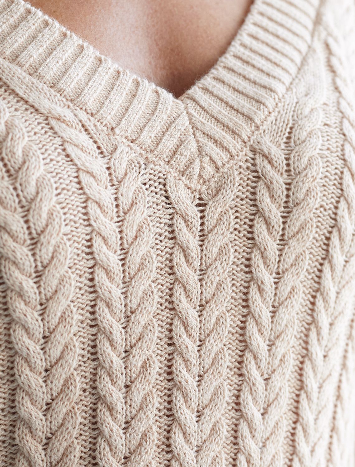 Джемпер фактурной вязки выполнен из хлопка с добавлением кашемира. Модель с V-вырезом с вывязанным орнаментом цепи. Мягкая и очень приятная пряжа совершенно не колется, сохраняет тепло при этом не перегревая, гарантируя безупречный комфорт.
