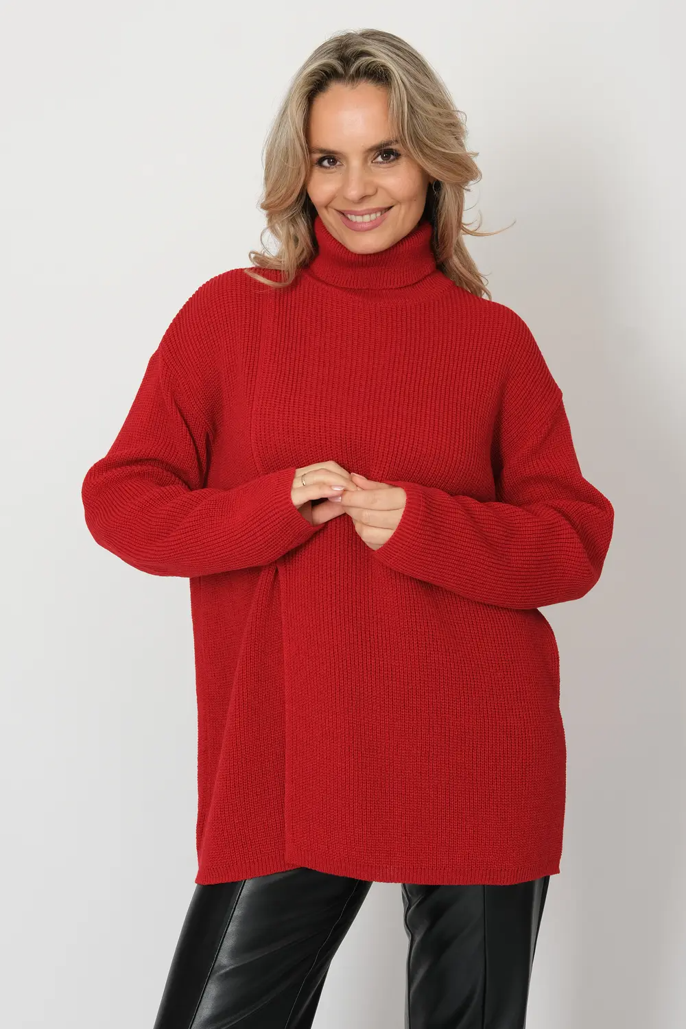 Джемпер оверсайз с воротом-стойкой. Рукава длинные со спущенным плечом. По переднему полотну изделия сбоку стильный глубокий разрез. красный