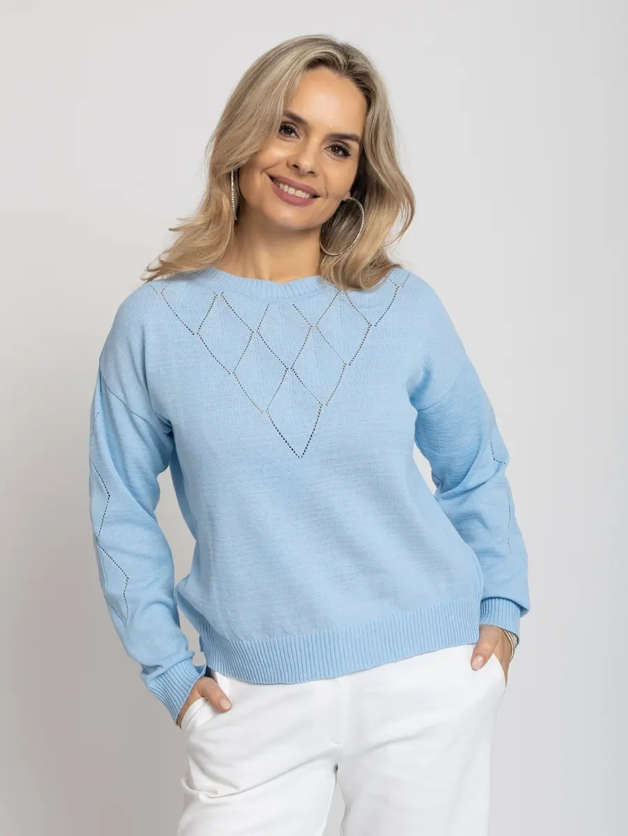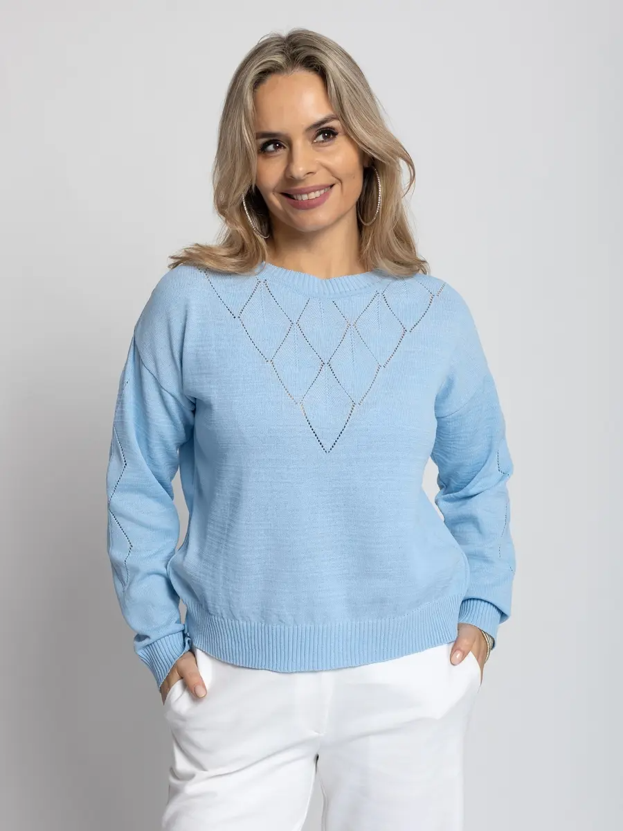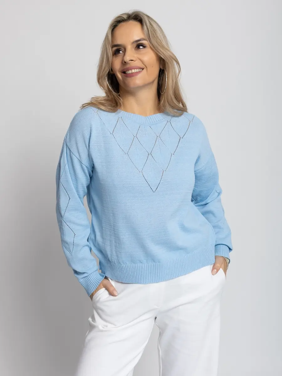 Элегантный женский джемпер — идеальное сочетание стиля и комфорта. Свободный крой делает джемпер универсальным и комфортным, он прекрасно садится на фигуру, мягко скрывая нюансы и создавая современный силуэт. Фактурная вязка из меланжевой пряжи делает модель по-настоящему нарядной — такой джемпер легко впишется как в повседневный гардероб, так и в более элегантные образы. Стильный, уютный и универсальный женский джемпер — вещь, которую захочется носить каждый день.. голубой