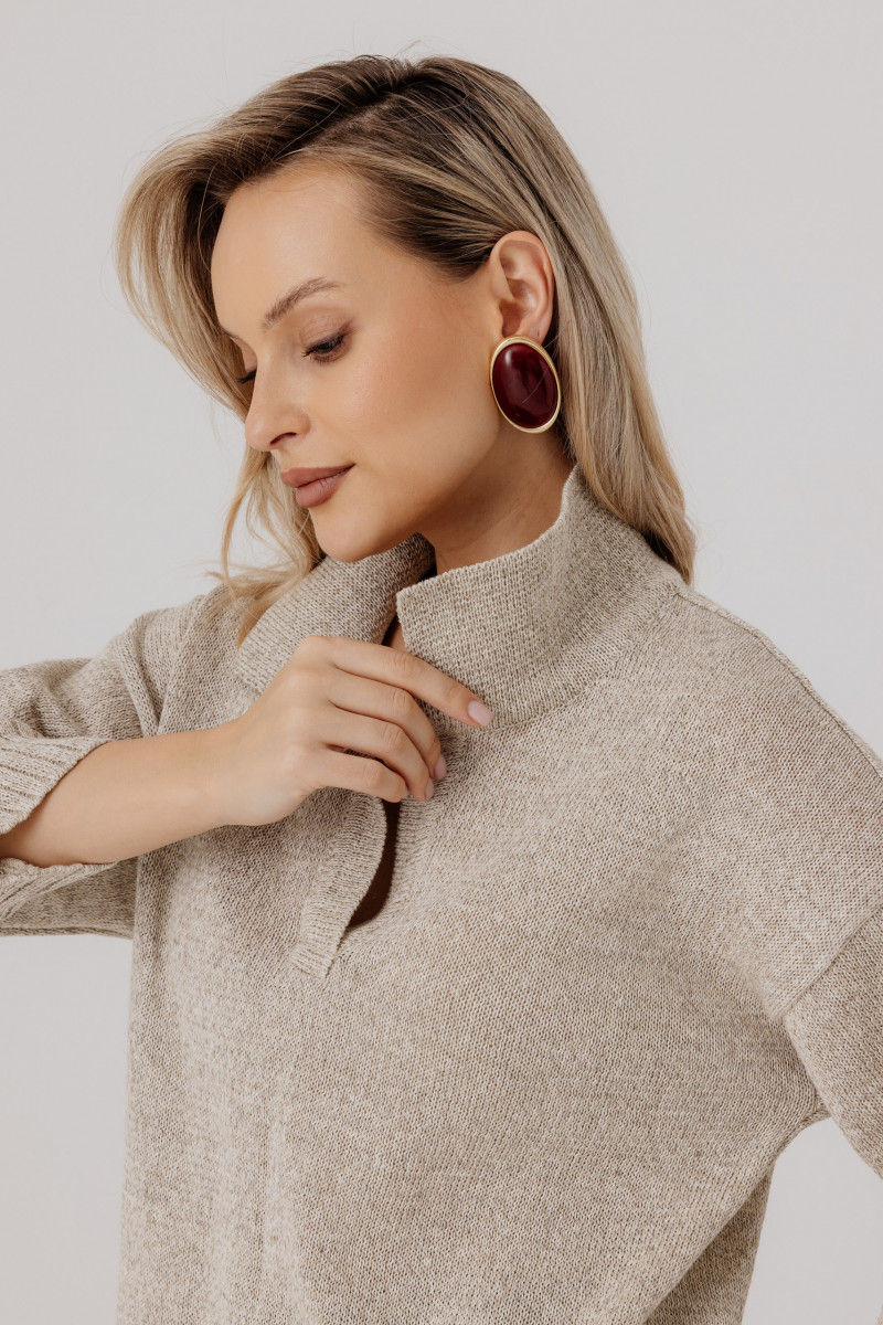 Широкий отложной воротник поло , который добавляет элегантности и делает образ более структурированным. Низ изделия и манжеты выполнены в виде плотной резинки, что обеспечивает аккуратную посадку и подчёркивает текстуру вязки.