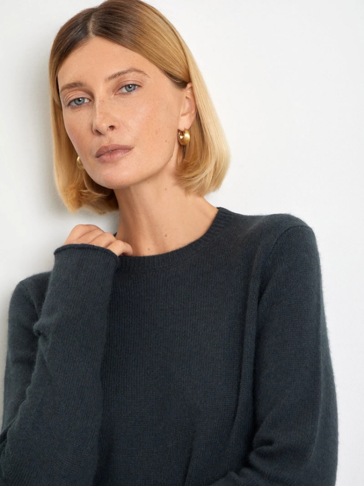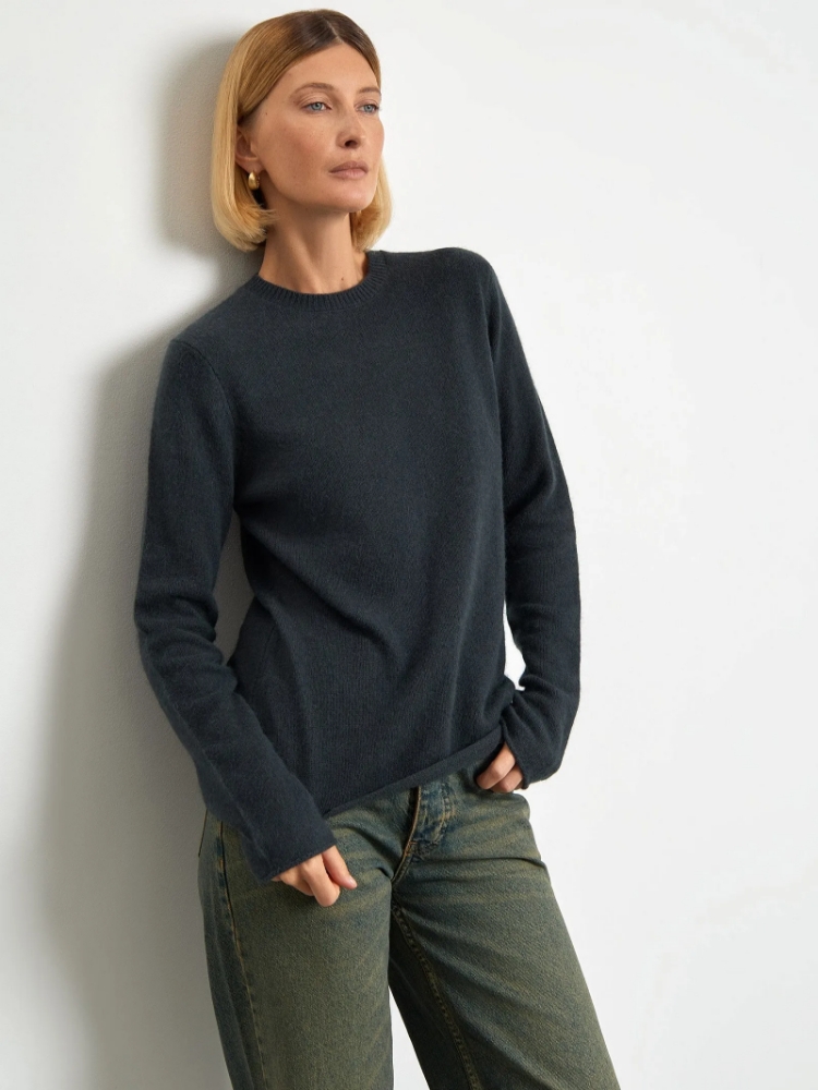 Лаконичный джемпер в тёмно-сером цвете. Мягкий материал более чем на две трети состоит из шерсти. Модель прямого кроя имеет круглый вырез и длинный рукав, прикрывающий часть кисти. Незаменимая базовая вещь для тёплых образов на каждый день