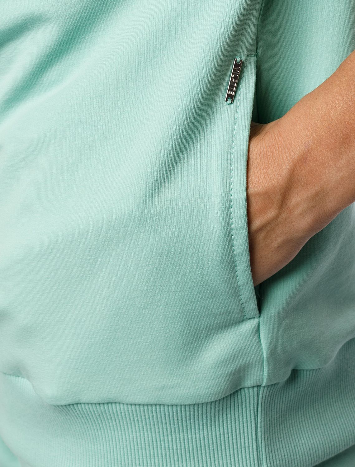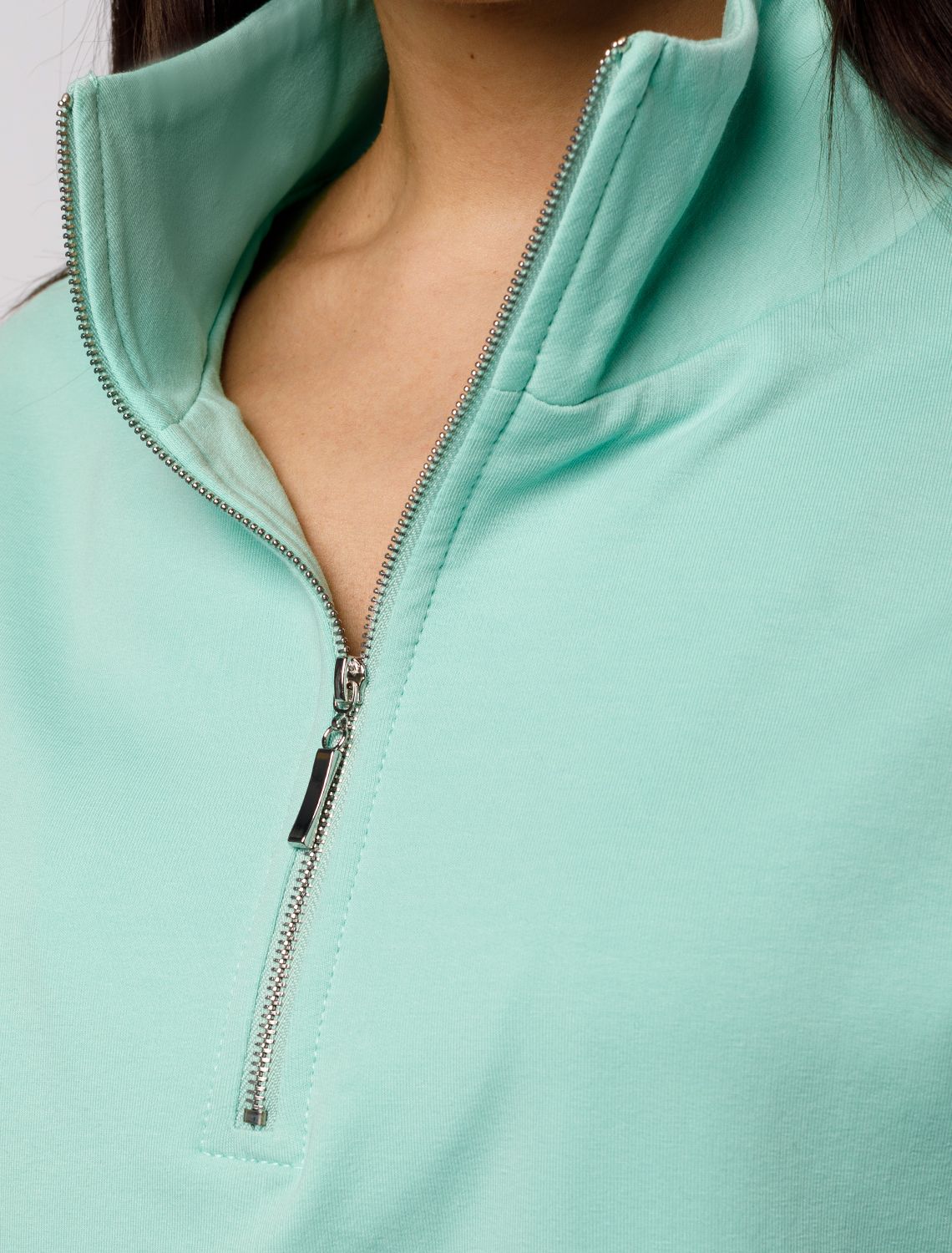 Джемпер среднего объема со спущенным плечом выполнен из футера двухнитки с эластаном. Изделие с воротом на серебристой молнии дополнено боковыми карманами. Эластичный материал гарантирует комфорт и формоустойчивость. Сочетается в костюме с брюками D44.138, D44.139 и шортами D48.008. Изделие дополнено металлическим логотипом бренда. мятный