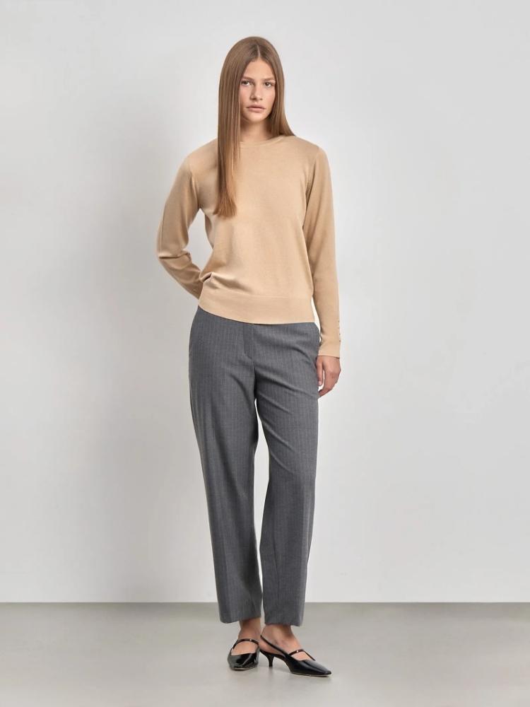 Must have базового гардероба — элегантный джемпер. Выполнен в благородном светло-бежевом цвете. Материал с содержанием шёлка очень приятен к телу. Он нежный на ощупь и комфортный в повседневной носке. Джемпер отлично садится по фигуре. Продуманный крой и широкая полоса вязки резинкой по низу создают красивый переход от прямого силуэта к слегка облегающему. Длинные рукава имеют манжеты и дополнены акцентной фурнитурой золотистого цвета. Манжеты с пуговицами придают образу собранности. Джемпер станет любимой основой повседневных образов. Можно сочетать с юбкой-футляром замшевой или кожаной фактуры, обычной юбкой из костюмной ткани, костюмными брюками и денимом