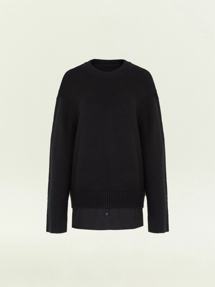 Удобная многослойность и модная игра с деконструированными формами — то, что нужно для нескучного повседневного гардероба.Джемпер отлично подойдёт для кэжуальных образов и в офис при нестрогом дресс-коде. Модель имитирует надетую под лаконичный шерстяной джемпер хлопковую рубашку: более чем уместное сочетание для офиса. Нижняя часть с имитацией рубашки пришита к джемперу.Имитация рубашки под джемпером удобнее, чем просто рубашка под джемпером: ничего не мешает в плечах и проймах. А также смотрится аккуратнее и экономит время на глажке рубашек. Материал джемпера очень комфортен к телу, содержит шерсть и кашемир. Нейлон и эластан в составе делают его практичнее. Базовая чёрная расцветка даёт универсальность