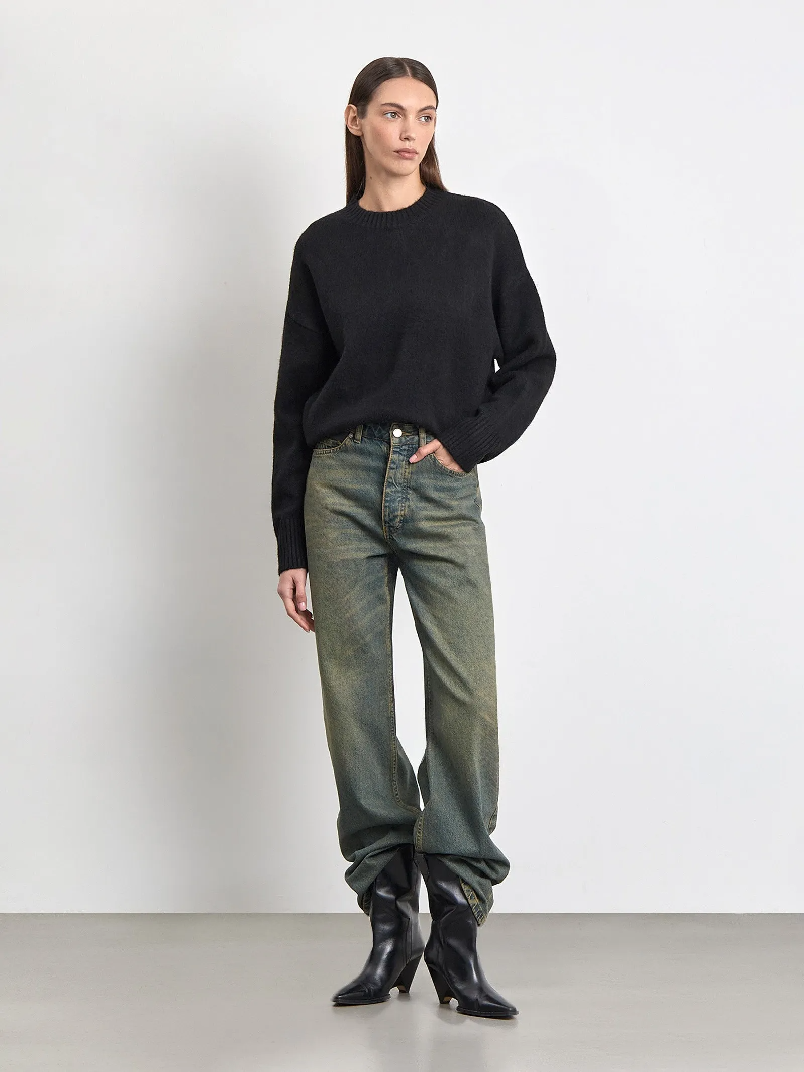 Мягкий базовый джемпер на каждый день. Выполнен в чёрном цвете из практичного материала с содержанием шерсти. Свободная модель прямого кроя со спущенным плечом создаёт расслабленный образ. Сочетается с любым базовым низом.