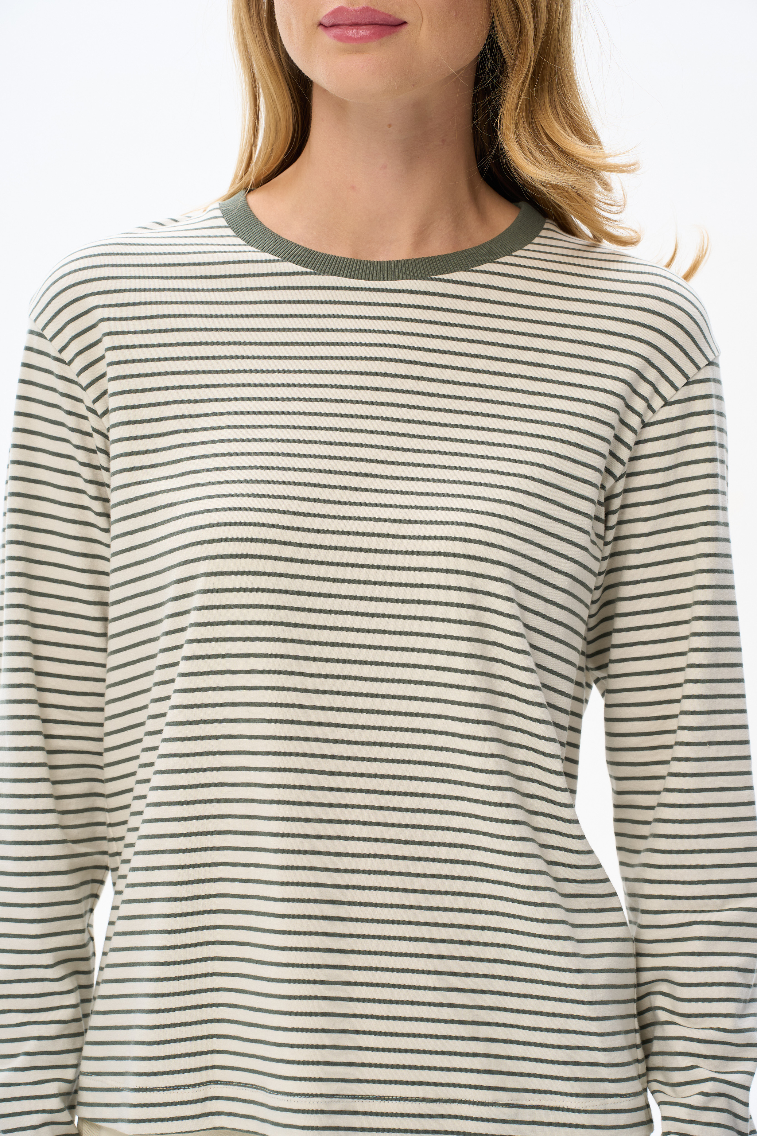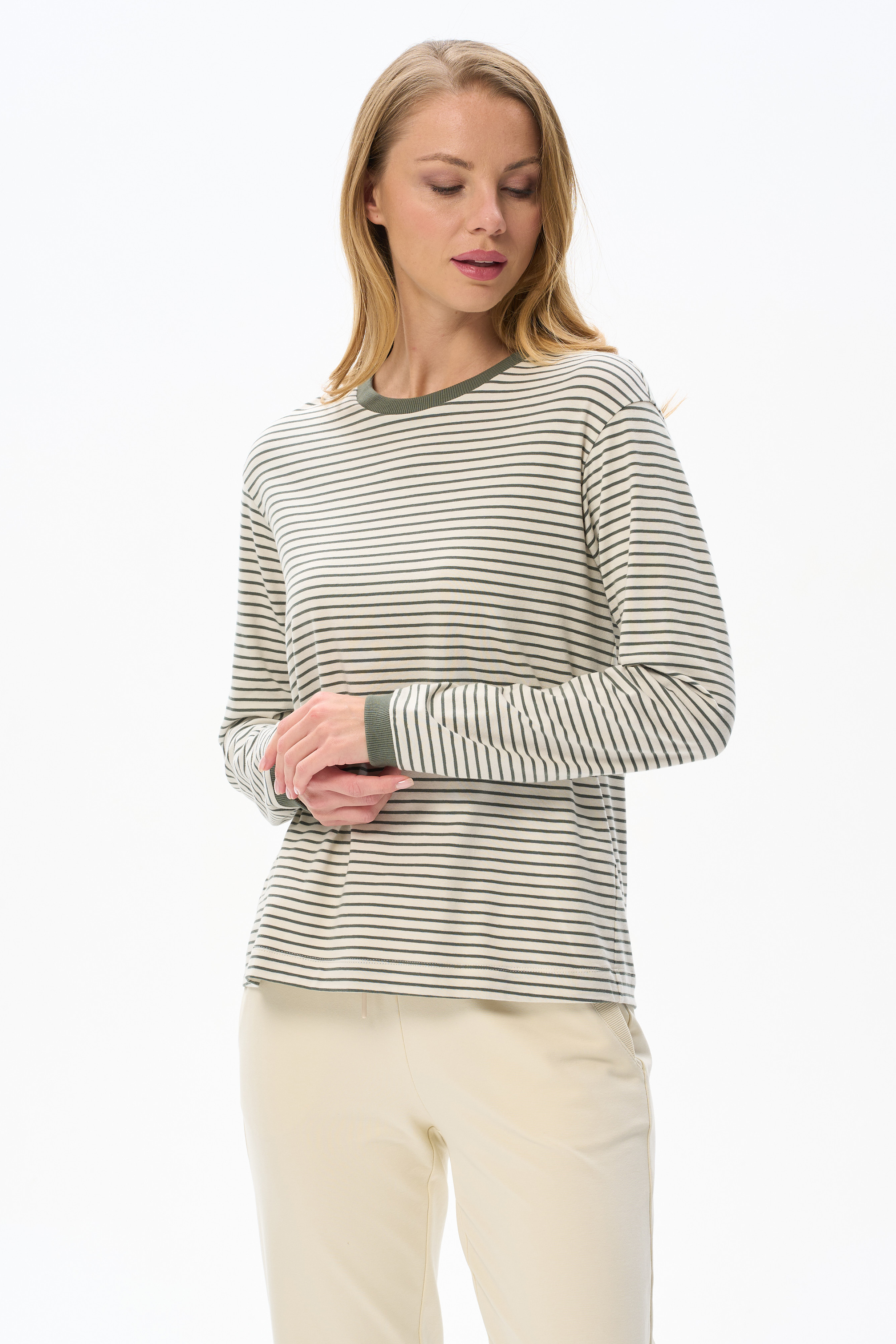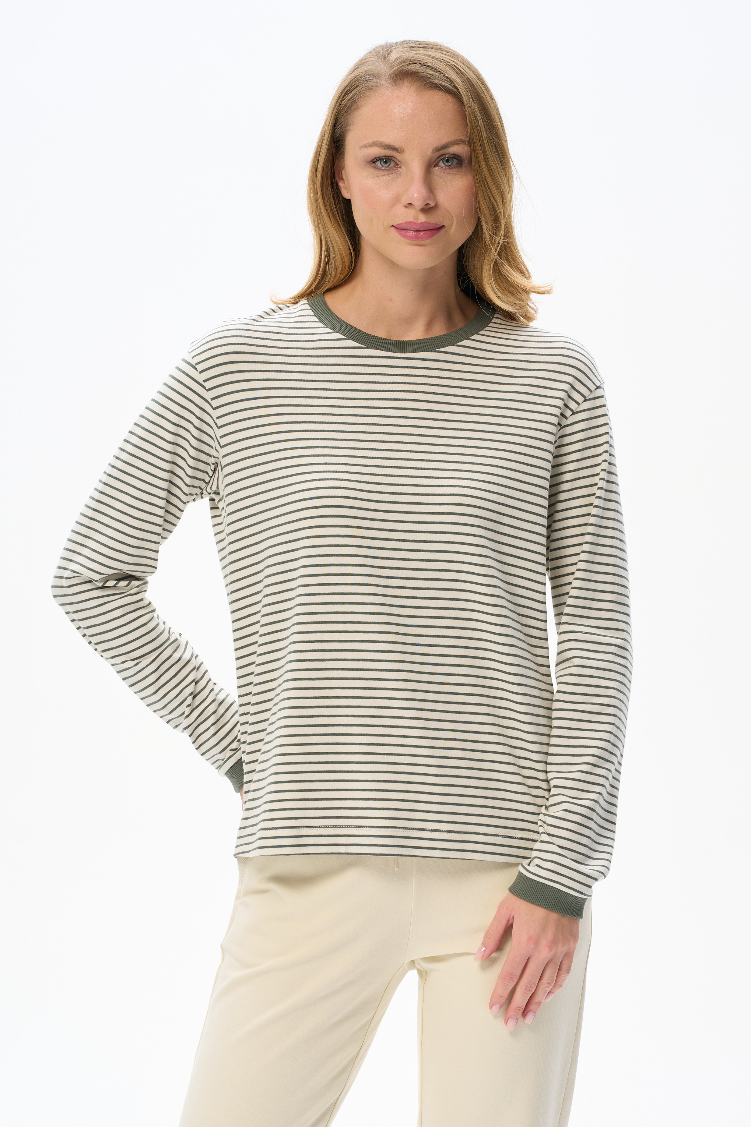 92% хлопок, 8% эластан Повседневный базовый джемпер в полоску из хлопкового полотна с эластаном качества пенье 180 гр. Модель с круглым вырезом горловины и длинными втачными рукавами. Комфортная, универсальная модель в оттенках коллекции. Рост модели 175 см.