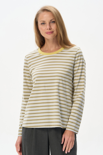 92% хлопок/ 8% эластан Повседневный базовый джемпер в полоску из хлопкового полотна с эластаном качества пенье 180 гр. Модель с круглым вырезом горловины и длинными втачными рукавами. Комфортная, универсальная модель в трендовых оттенках: Жемчужный и Утренний туман. Рост модели 175 см