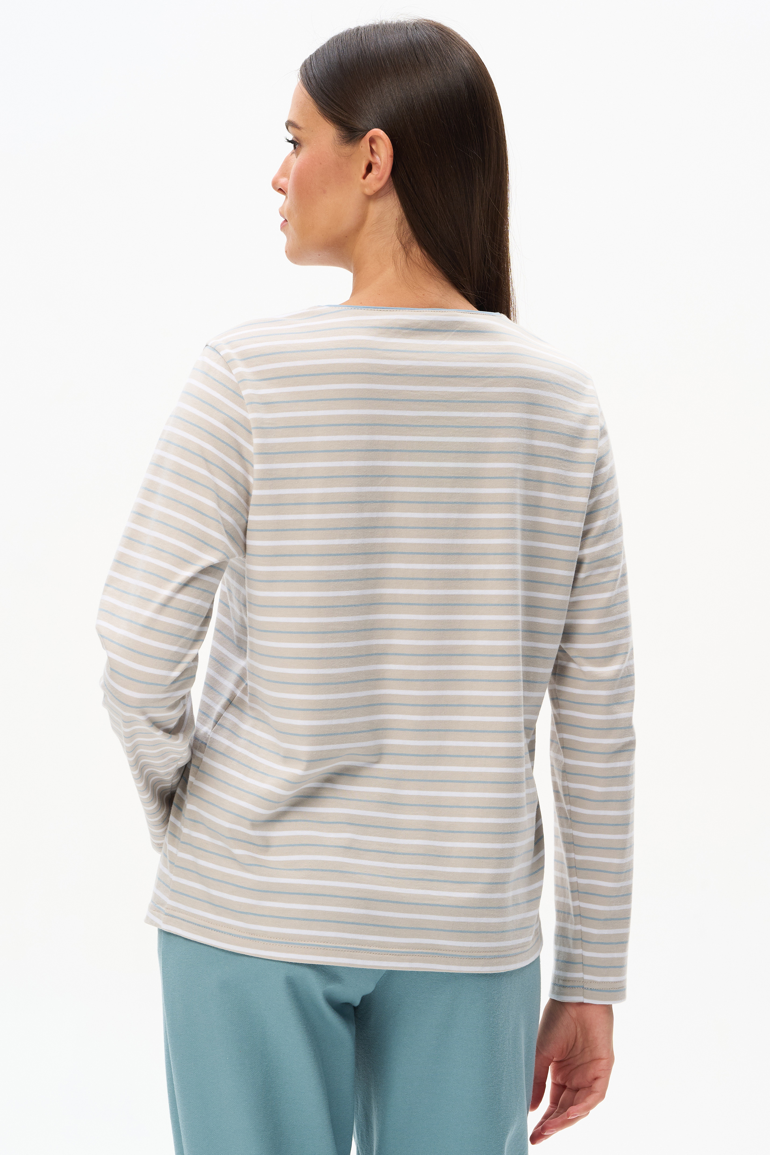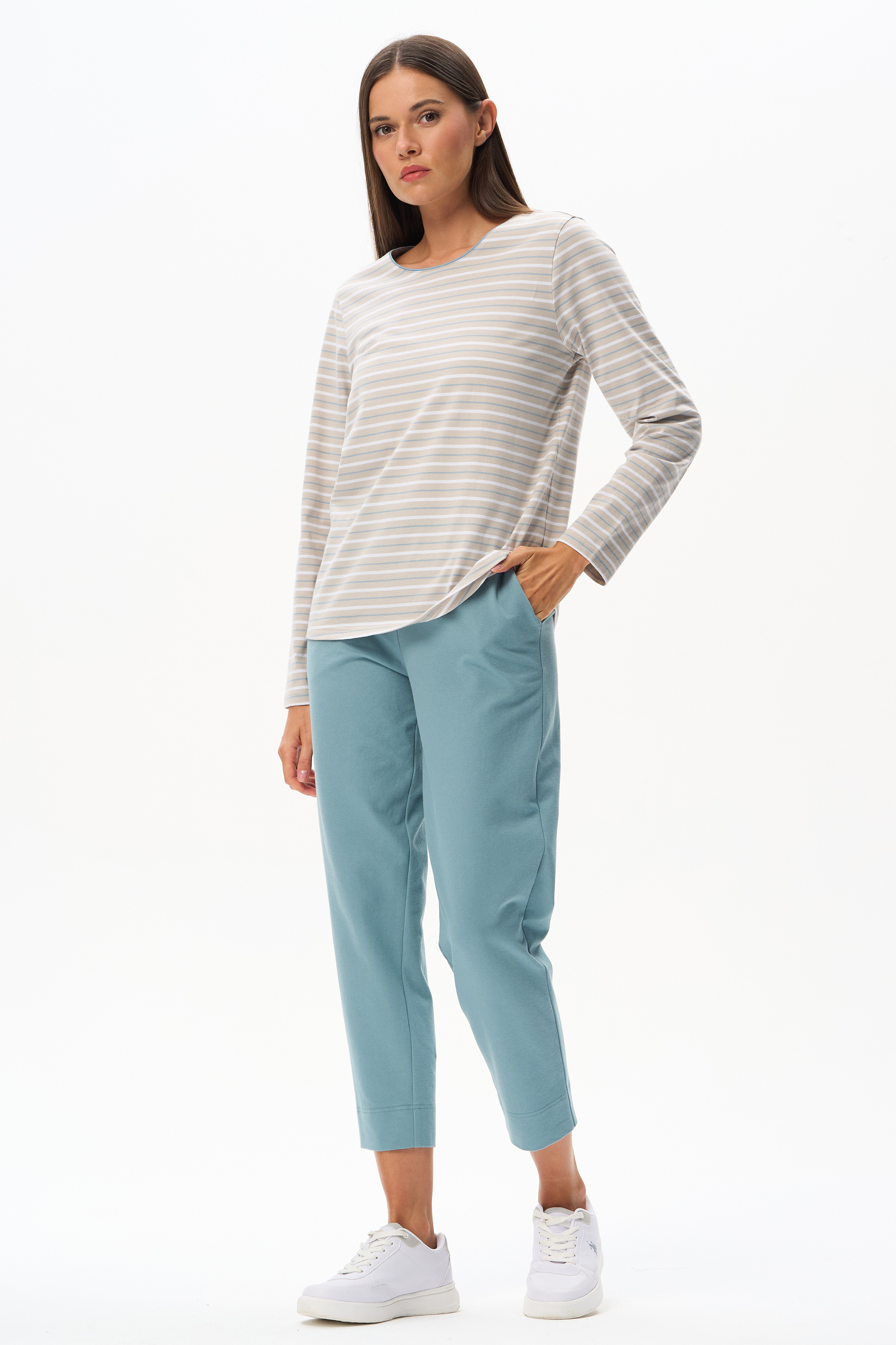 Повседневный базовый джемпер в полоску из хлопкового полотна качества пенье 180 гр. Модель с круглым вырезом горловины и длинными втачными рукавами. Комфортная, универсальная модель в трендовых оттенках: Голубой дельфиниум и Кунжут. Рост модели 175 см