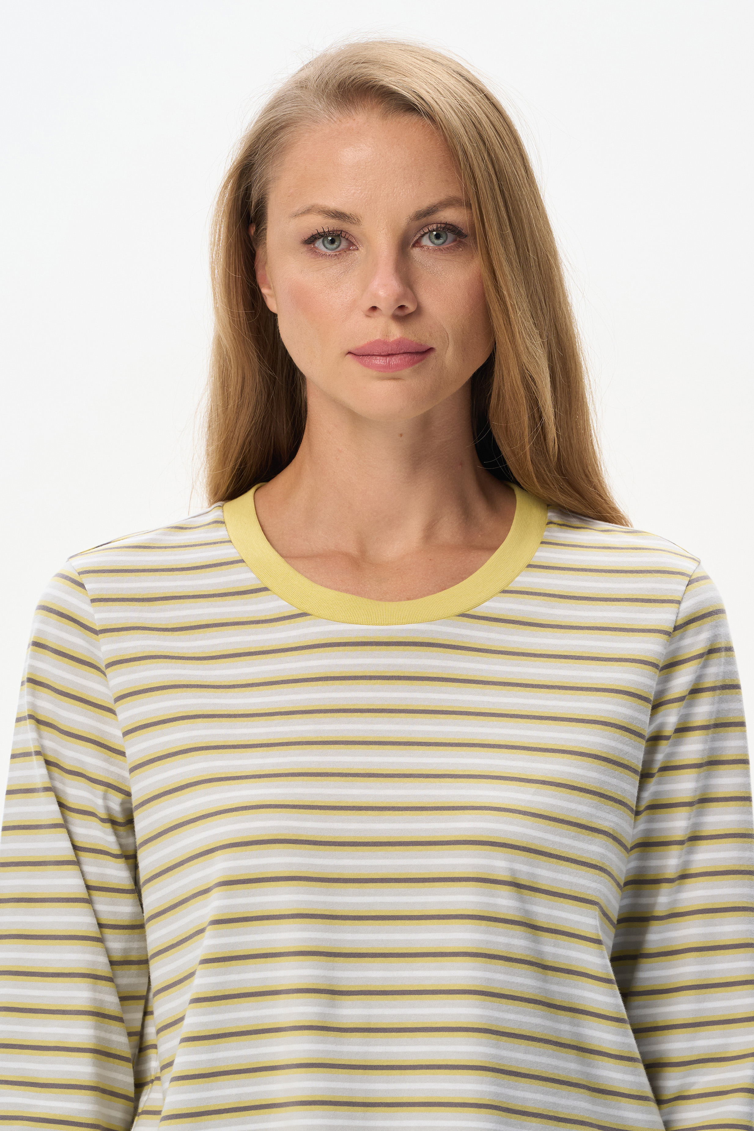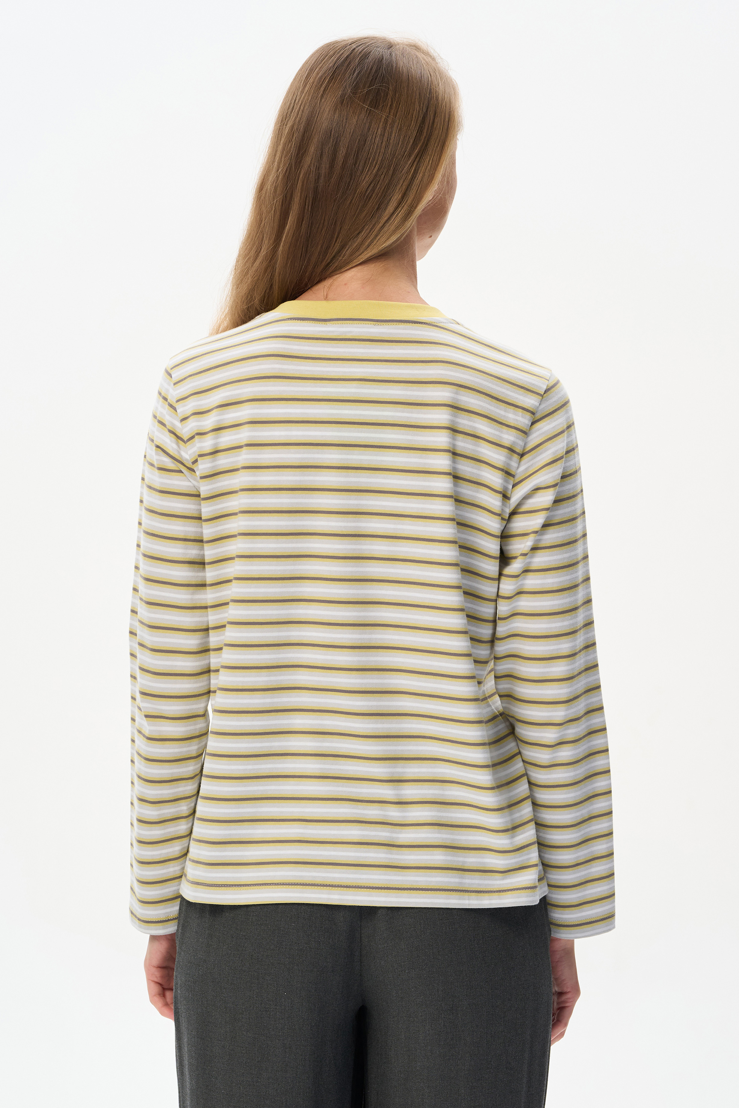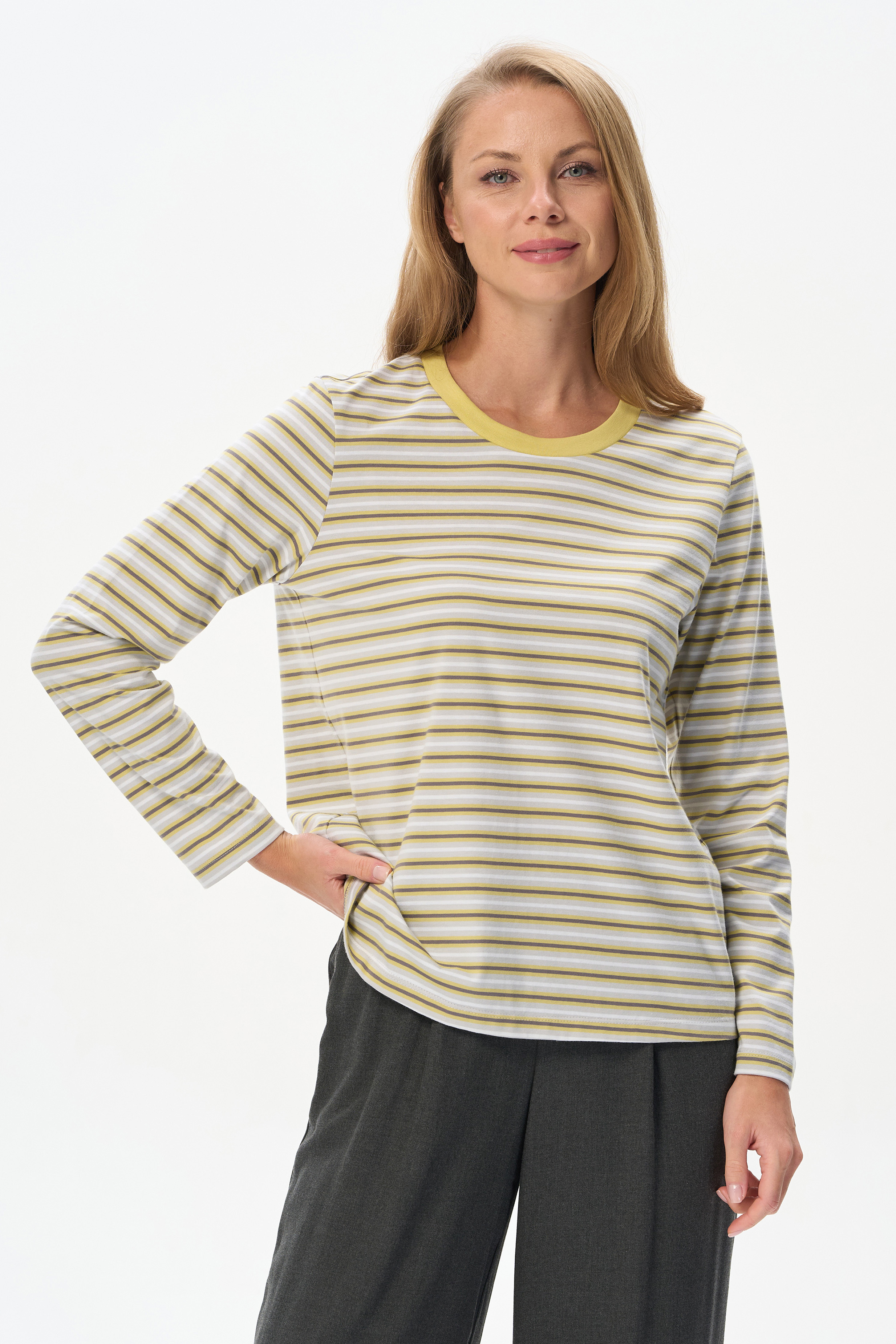 100% хлопок Повседневный базовый джемпер в полоску из хлопкового полотна качества пенье плотностью 186 гр. Модель с круглым вырезом горловины и длинными втачными рукавами. Комфортная, универсальная модель в трендовых оттенках: Рост модели 175 см