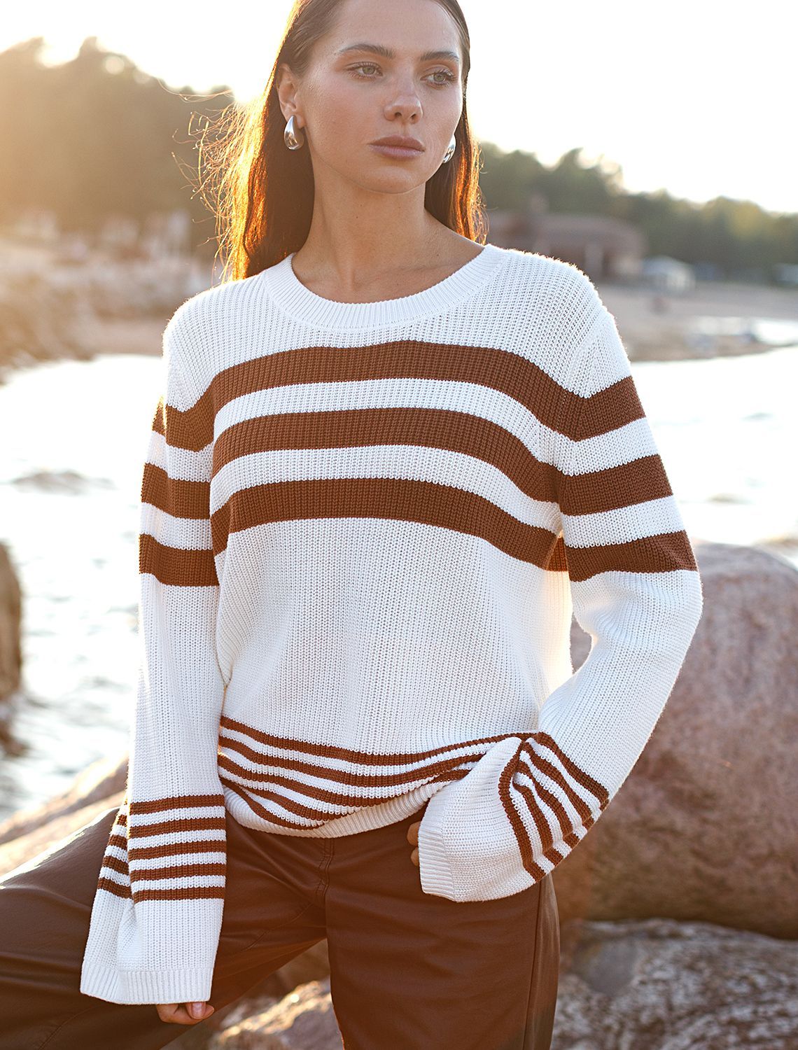Джемпер крупной вязки выполнен из хлопковой пряжи. Полосатый узор и эффектно сочетающиеся цвета сделают любой образ роскошным и расслабленным. Благодаря натуральному составу и воздушной фактуре в изделии будет комфортно в любое время года. Свободный силуэт подходит для любой фигуры.