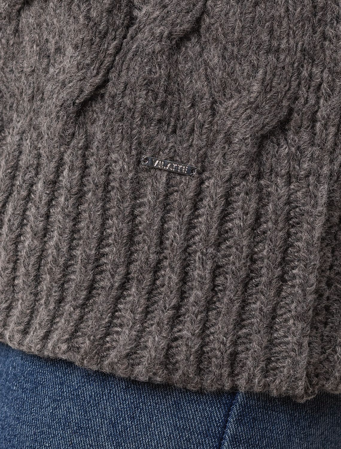 Джемпер в кофейном оттенке выполнен из уютной меланжевой пряжи крупной вязки с ангорой и легким пушистым мохером. Пряжа очень мягкая и свсем не колючая. Модель с фактурным узором косы очень приятная на ощупь, в которую хочется укутаться. Отлично согревает, а свободный силуэт позволяет носить изделие на футболку или рубашку. Из украшений металлический логотип бренда. кофе меланж