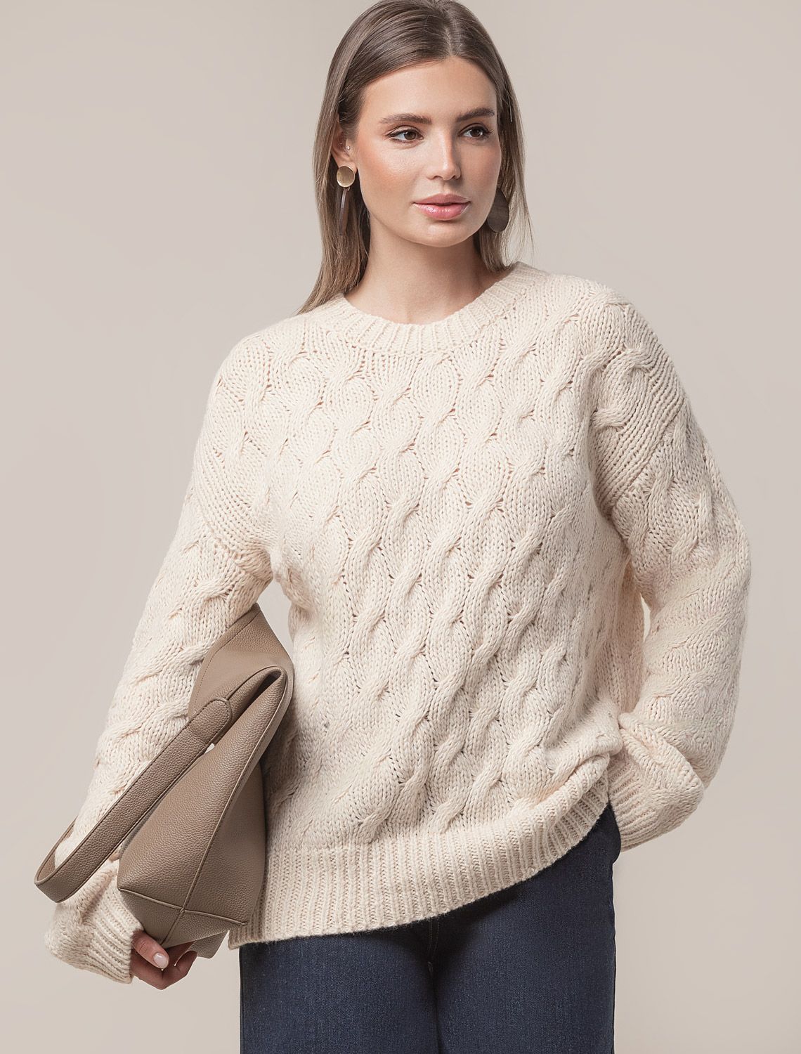 Джемпер в овсяном оттенке выполнен из уютной пряжи крупной вязки с ангорой и легким пушистым мохером. Модель с фактурным узором косы очень приятная на ощупь, в которую хочется укутаться. Отлично согревает, а свободный силуэт позволяет носить изделие на футболку или рубашку. Из украшений металлический логотип бренда.