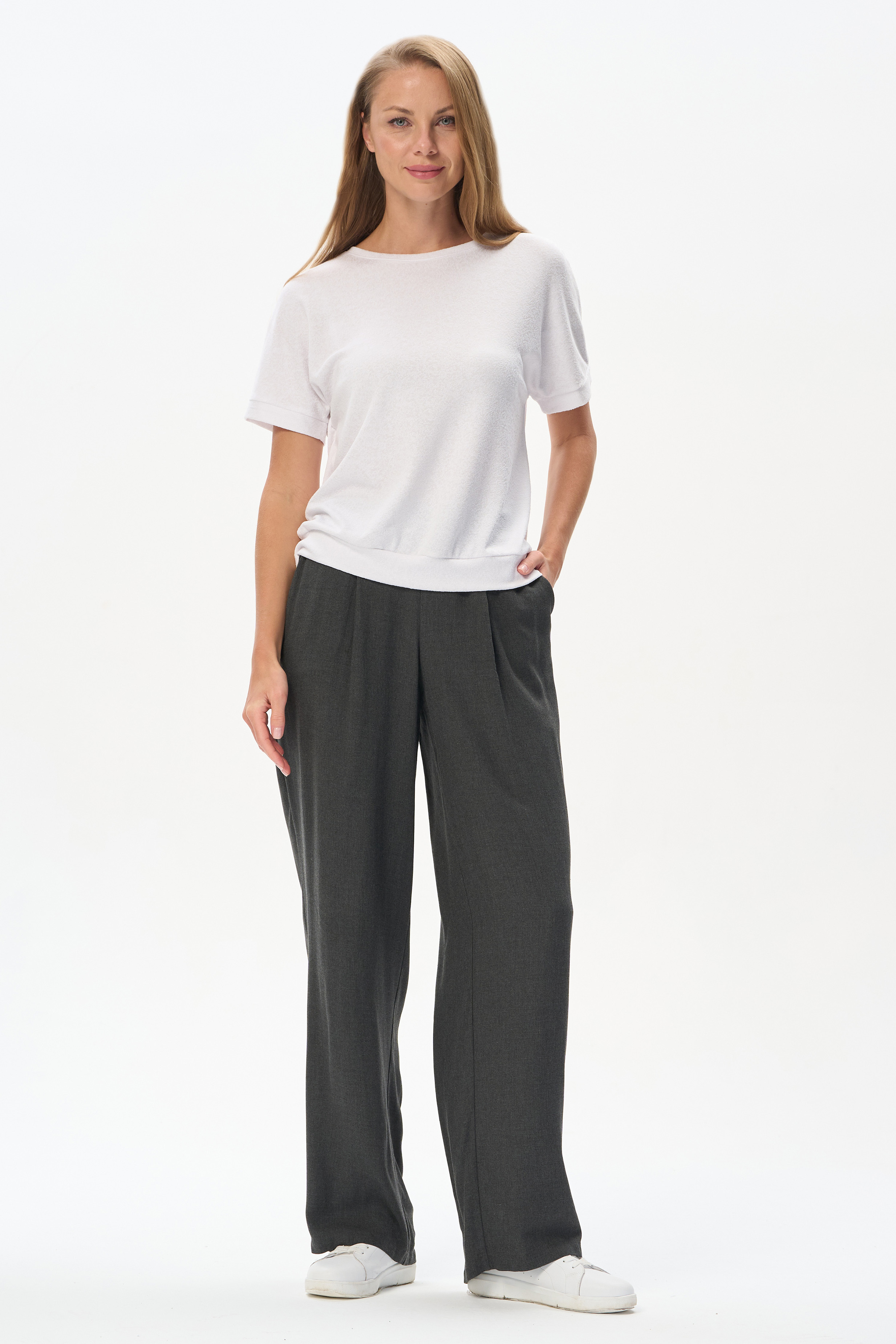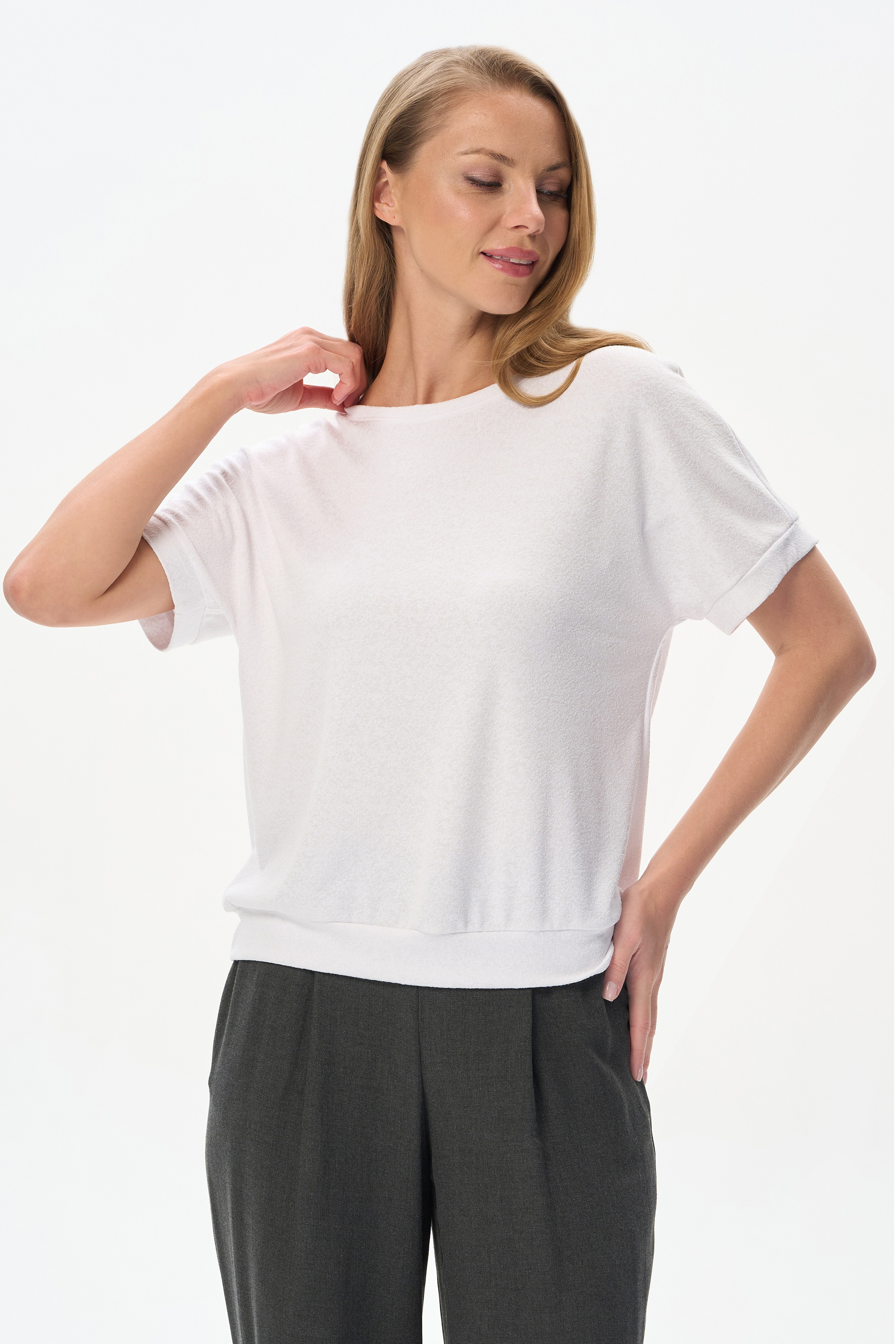80% вискоза/ 15% полиэстер/ 5% эластан Блузка свободного силуэта из вискозного трикотажного полотна с эффектом 3D. Круглый вырез горловины, цельнокроеные короткие рукава с манжетами, по низу изделия - манжет. Рост модели 175 см.